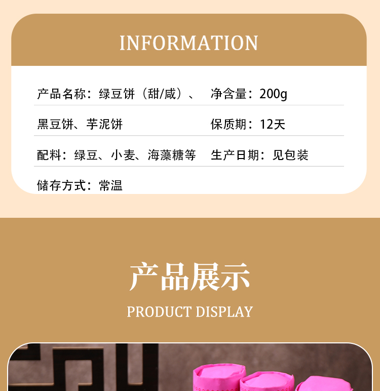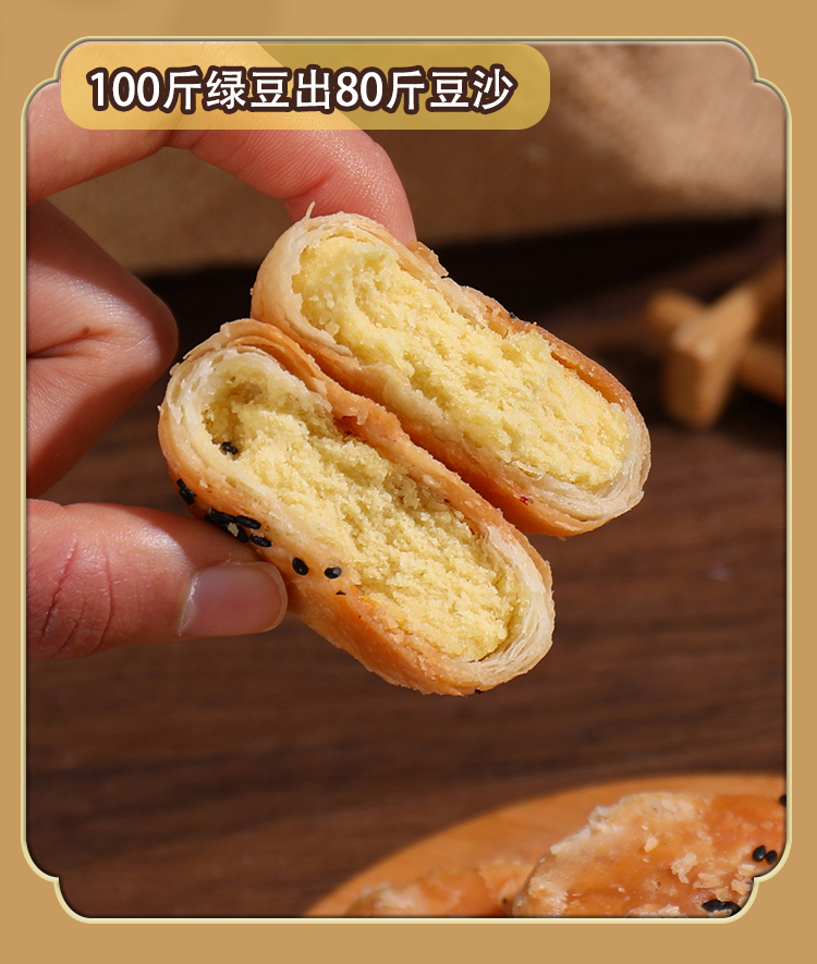1、绿豆饼(甜/咸):小麦粉、脱皮绿豆、白砂糖、海藻糖、食用植物油、食用盐、黑芝麻