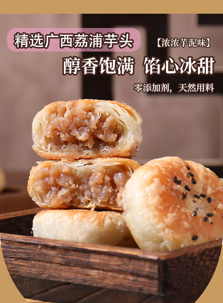 3、芋泥饼:小麦粉、芋头、脱皮绿豆、白砂糖、海藻糖、食用植物油、食用盐、黑芝麻