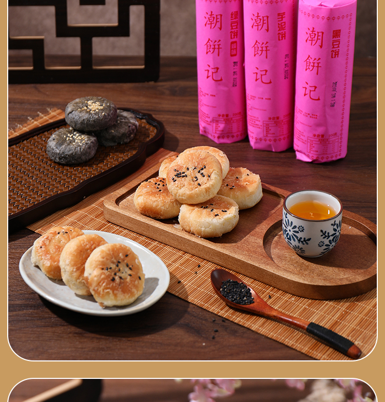 2、黑豆饼:小麦粉、黑豆、脱皮绿豆、白砂糖、海藻糖、食用植物油、食用盐、黑芝麻、白芝麻、植物炭黑
