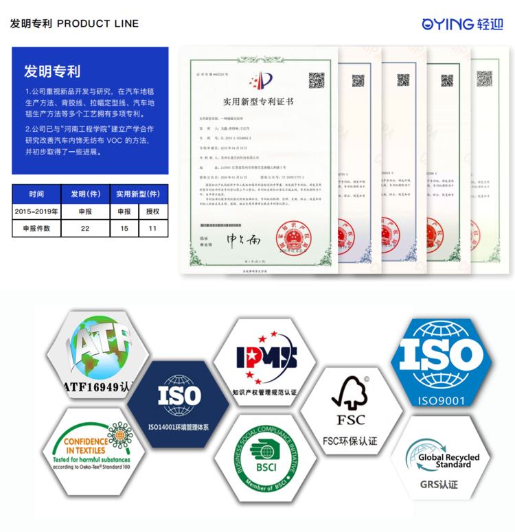 以创新的配方结合现代生产设备及工艺,已获得发明专利37项,取得授权专利11项!同时持有欧洲最严格的环保检测REACH认证、SGS国际权威机构认证、OEKO欧盟认证等多项国际认证体系。