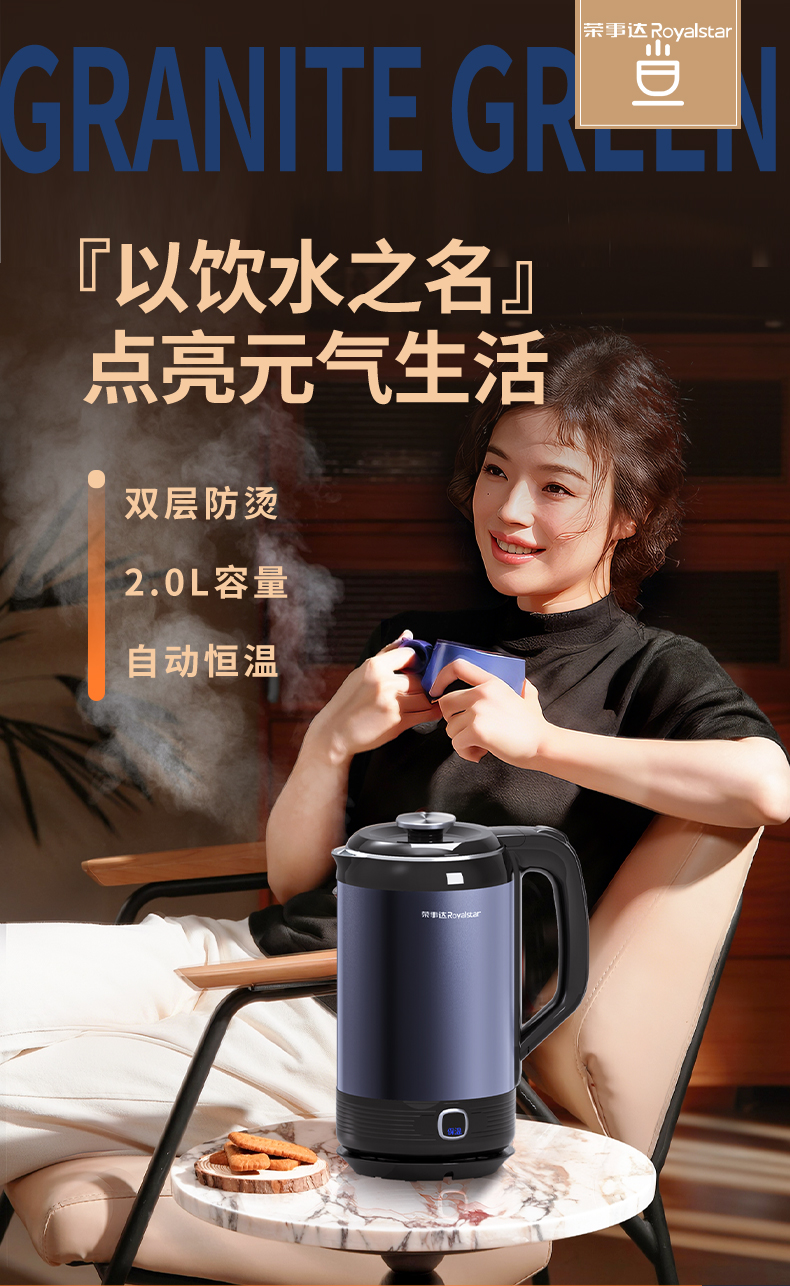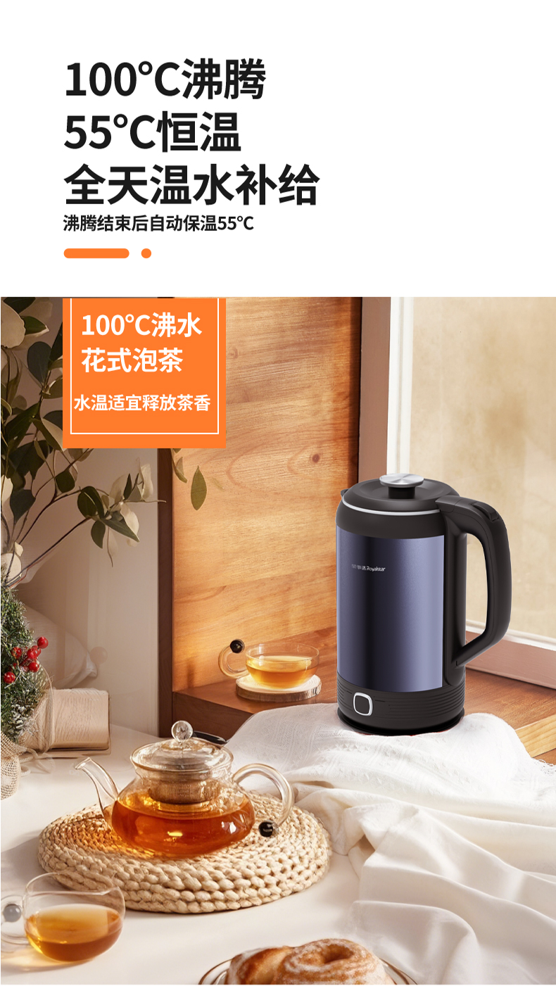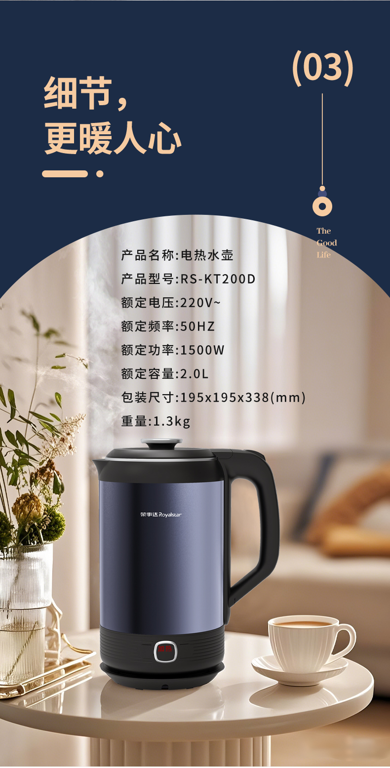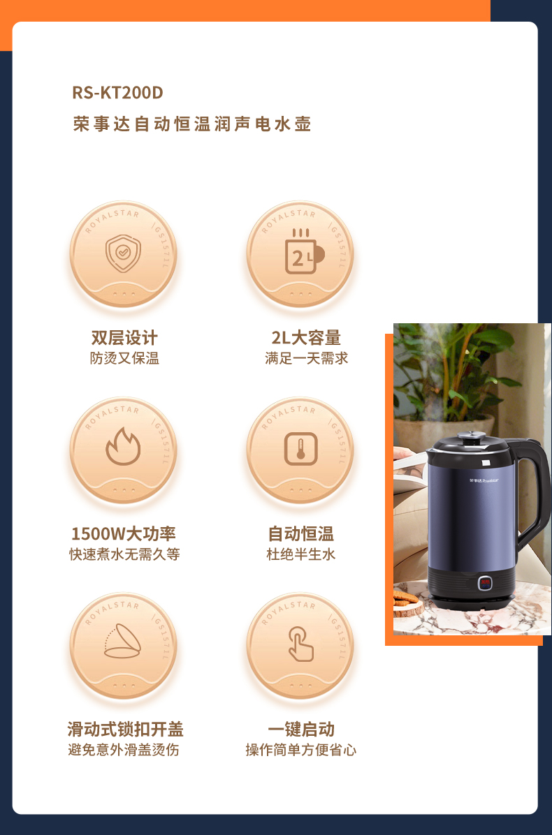 甄选 | 【快速烧水 双层防烫】荣事达电热水壶2升烧水壶暖水壶开水壶家用304不锈钢大功率RS-KT200D