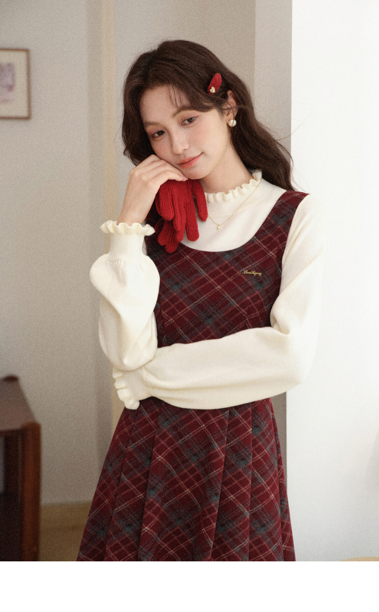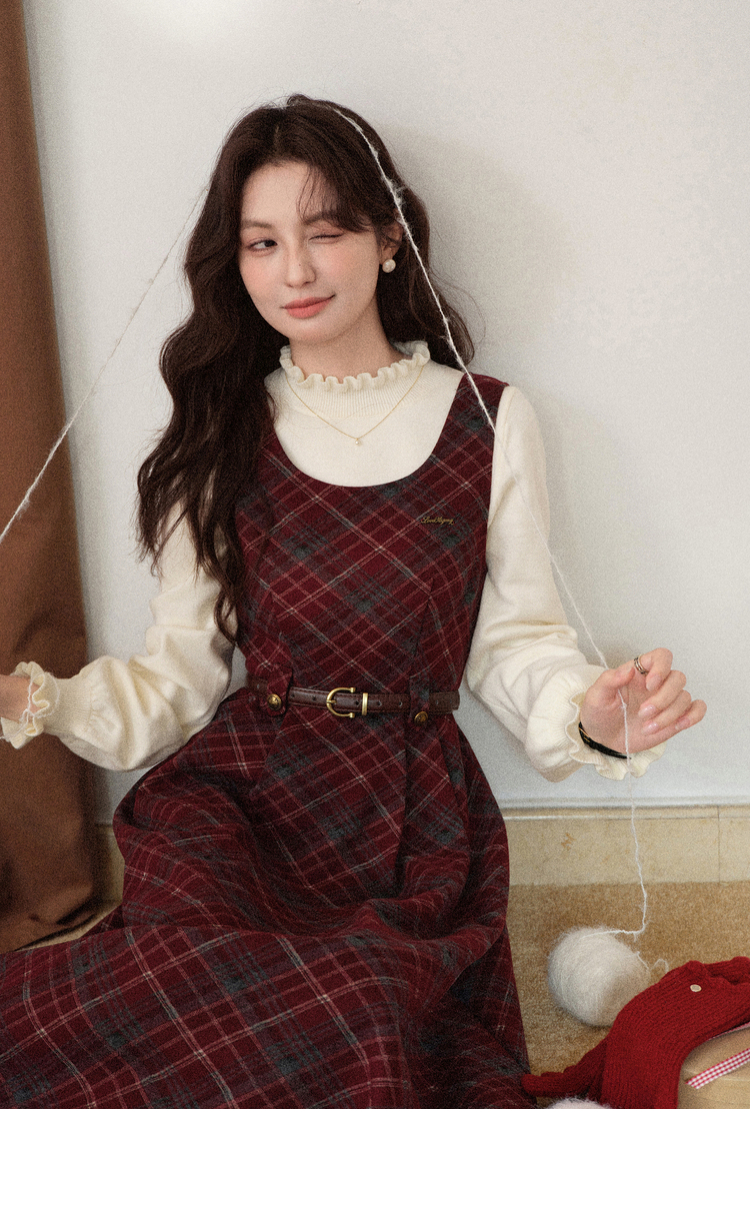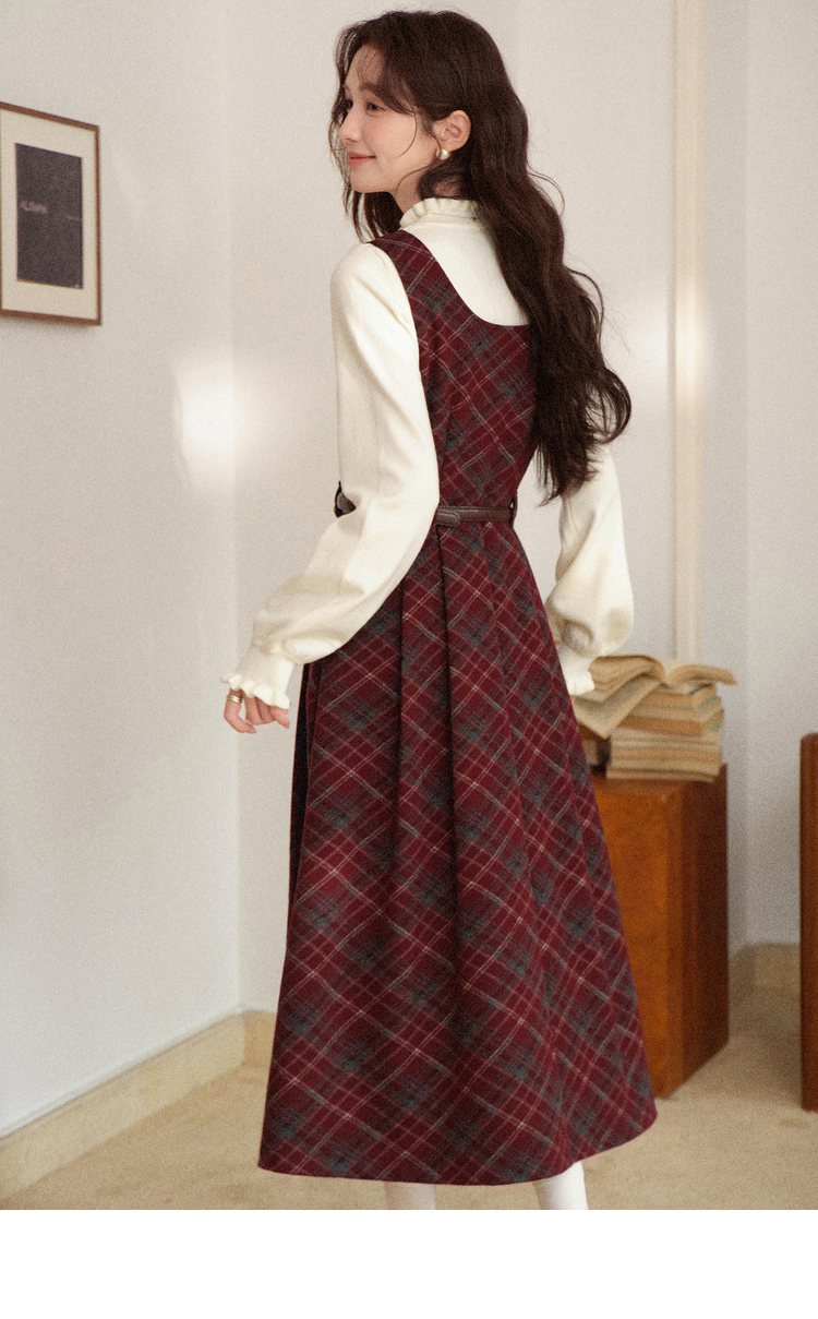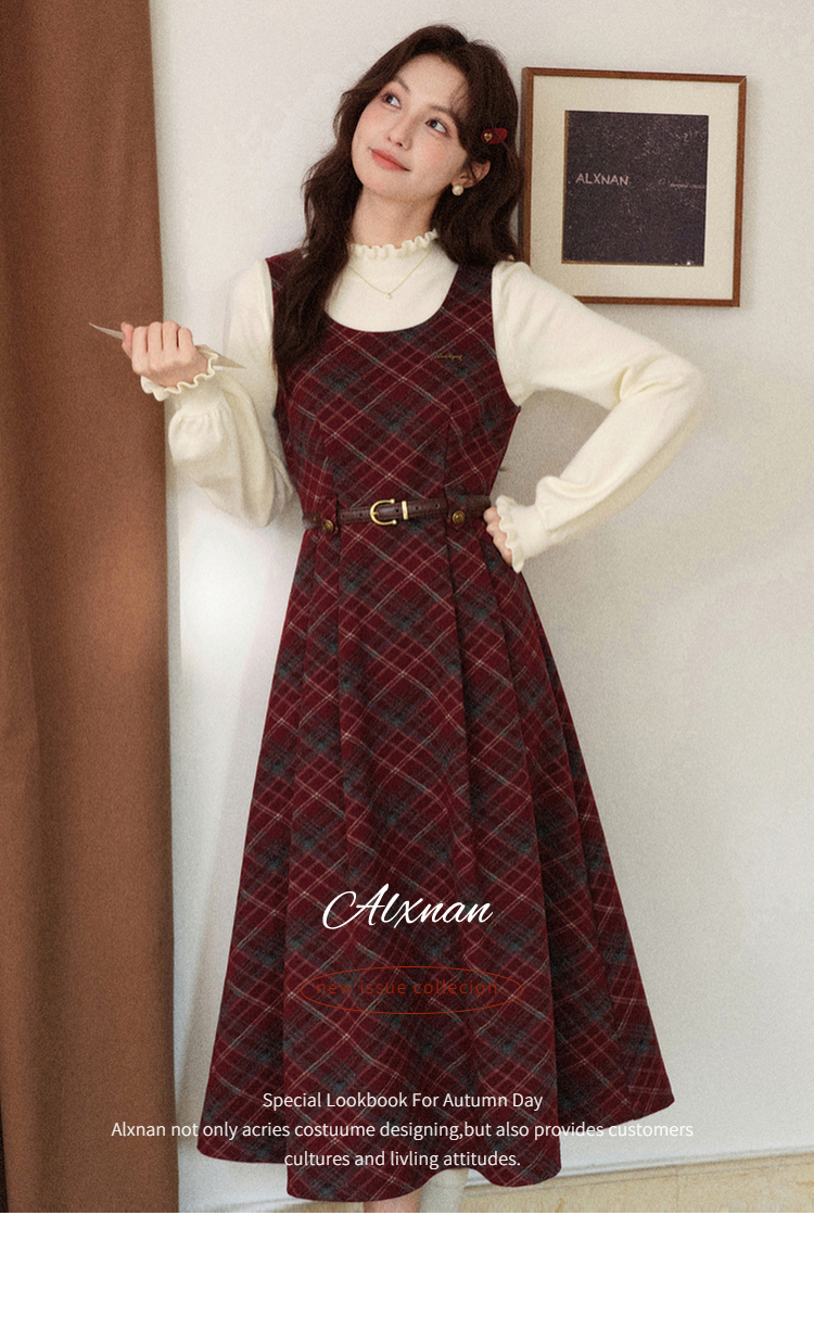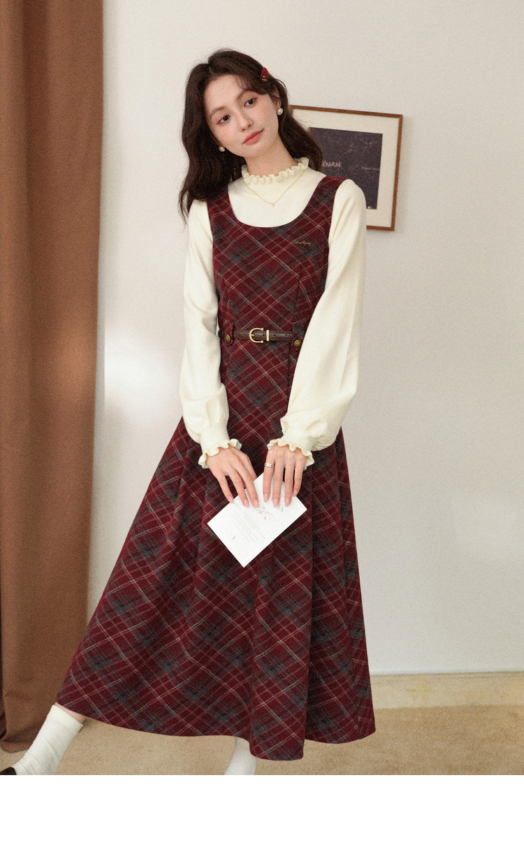 鹿向南「揽星凝暖」法式红色格纹背带连衣裙秋冬季复古收腰长裙女
