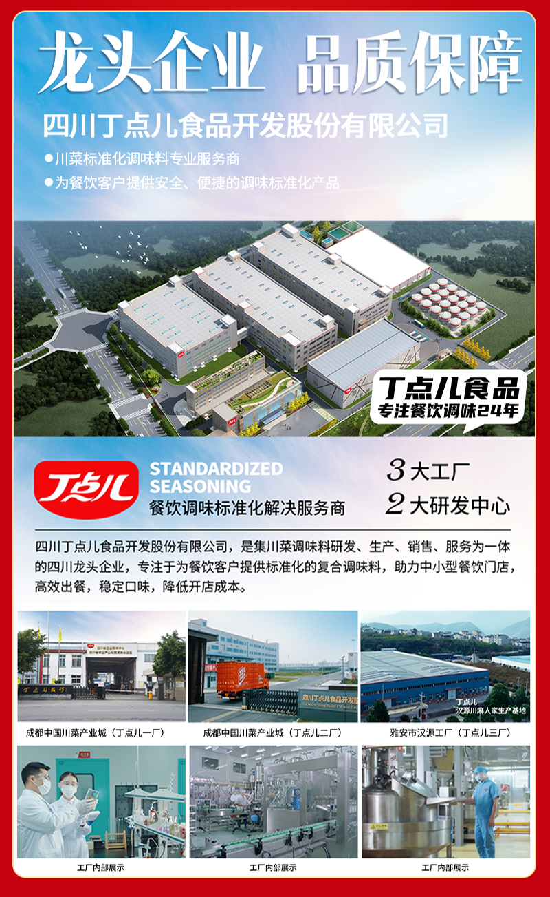 四川丁点儿食品开发股份有限公司,是集川菜调味料研发、生产、销售、服务为一体的现代化企业,专注为餐饮客户提供川菜调味解决方案。公司成立至今,服务了超百万家的餐饮门店以及连锁品牌。