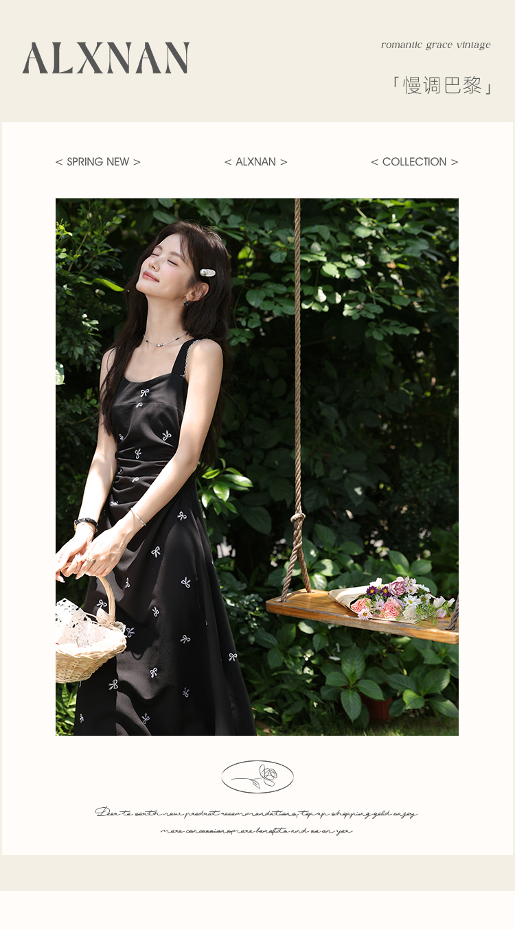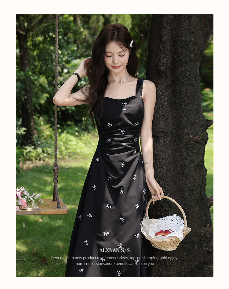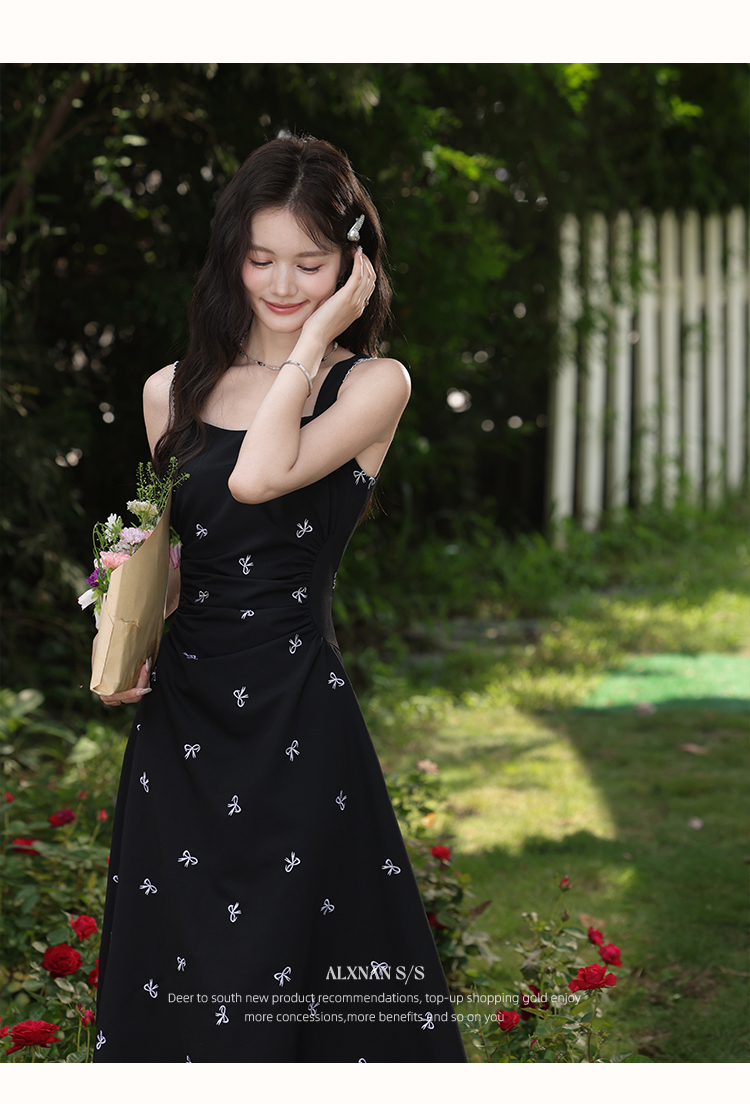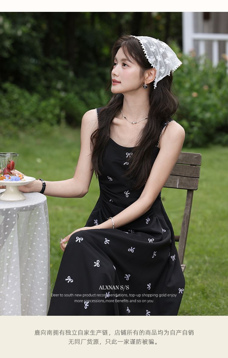 鹿向南「慢调巴黎」黑色碎花连衣裙女夏小个子收腰无袖长款吊带裙