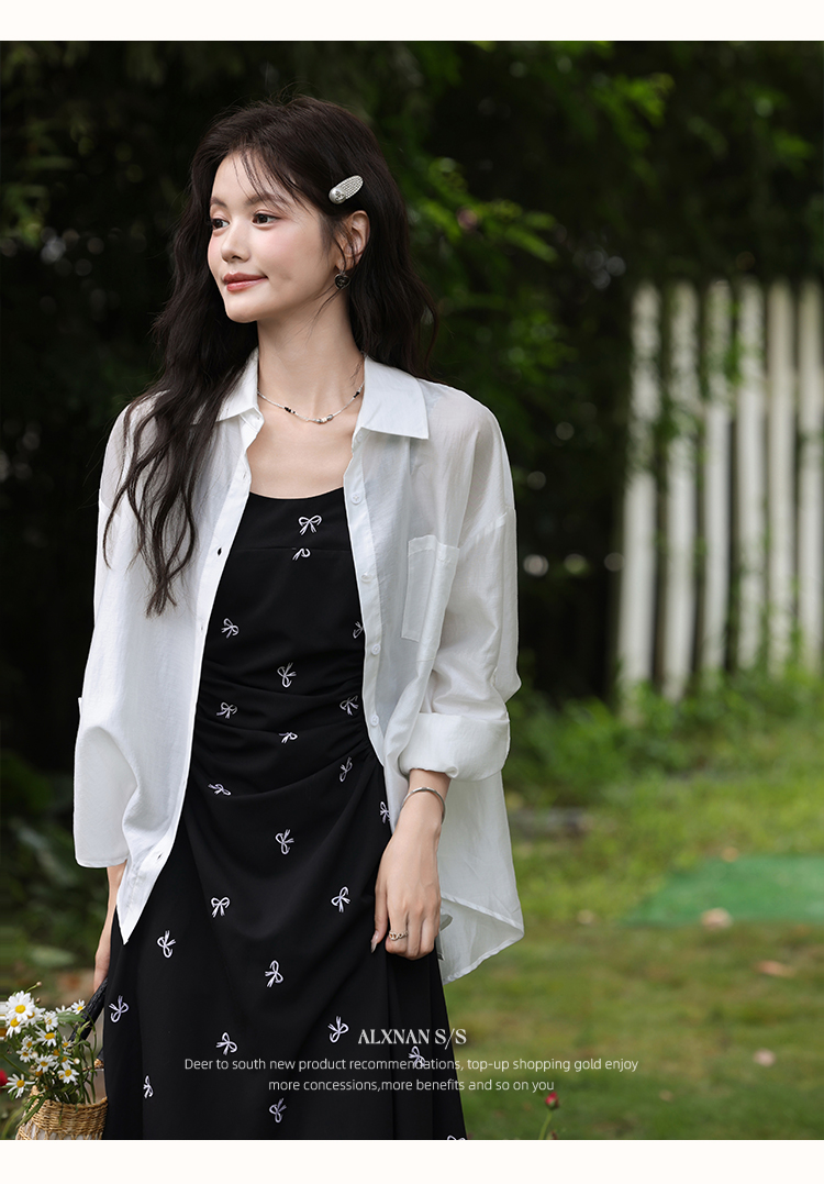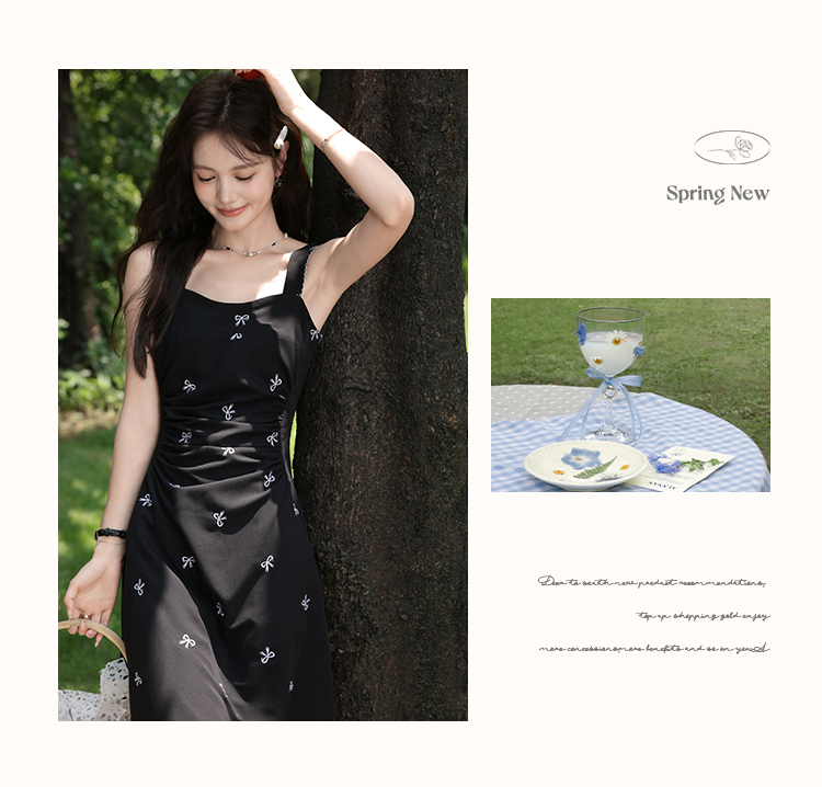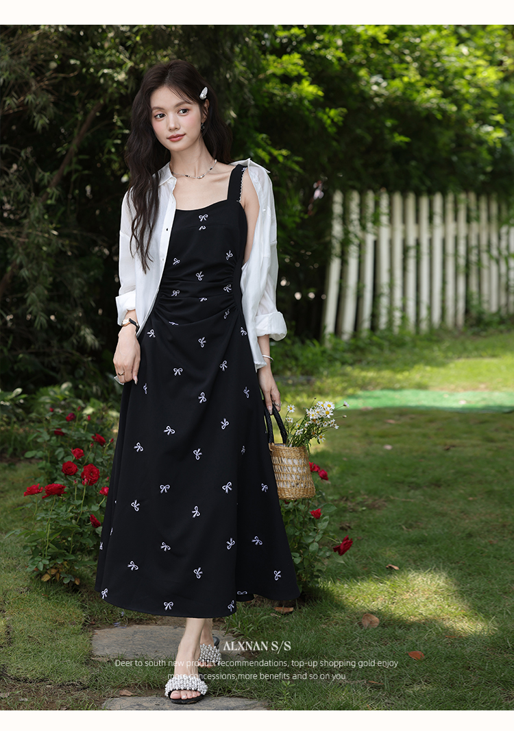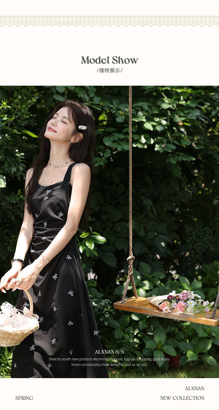 鹿向南「慢调巴黎」黑色碎花连衣裙女夏小个子收腰无袖长款吊带裙