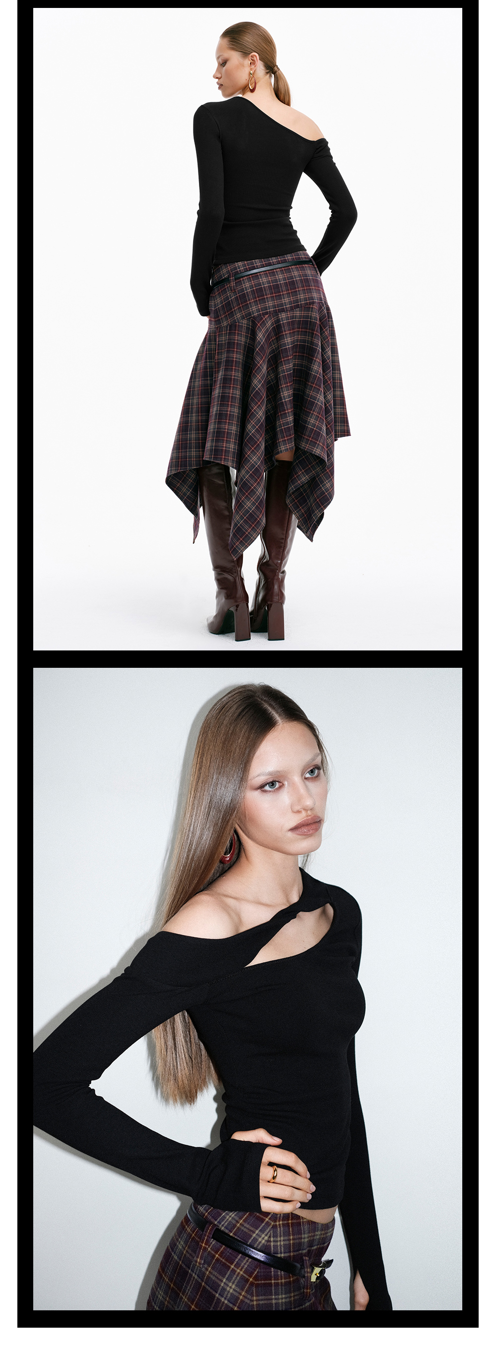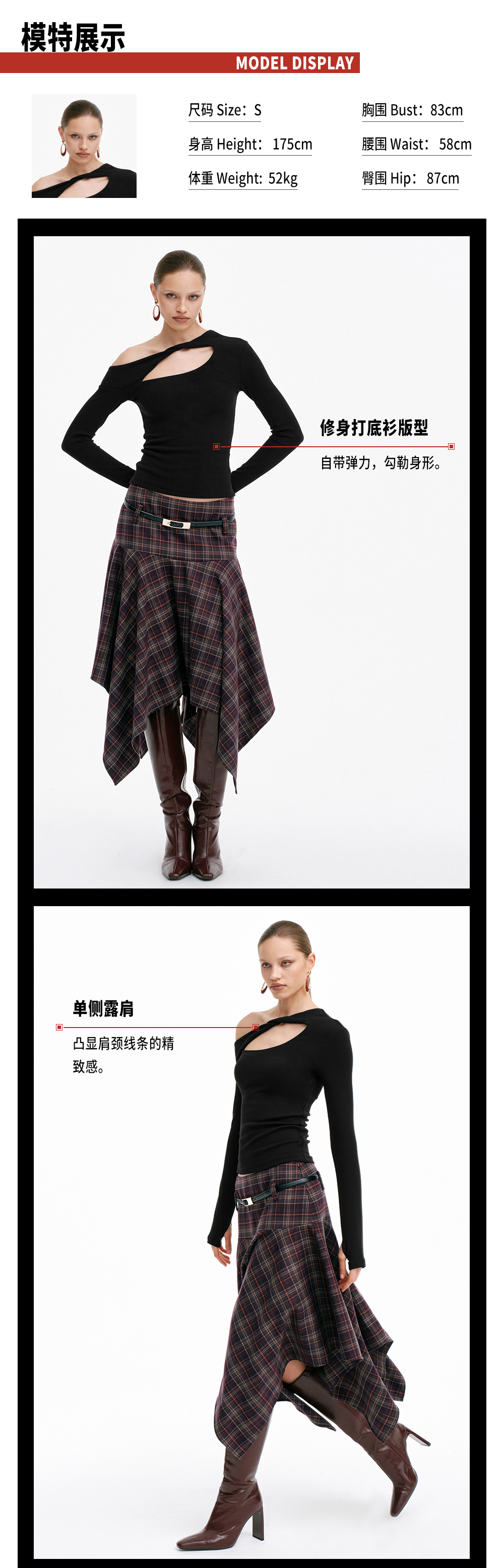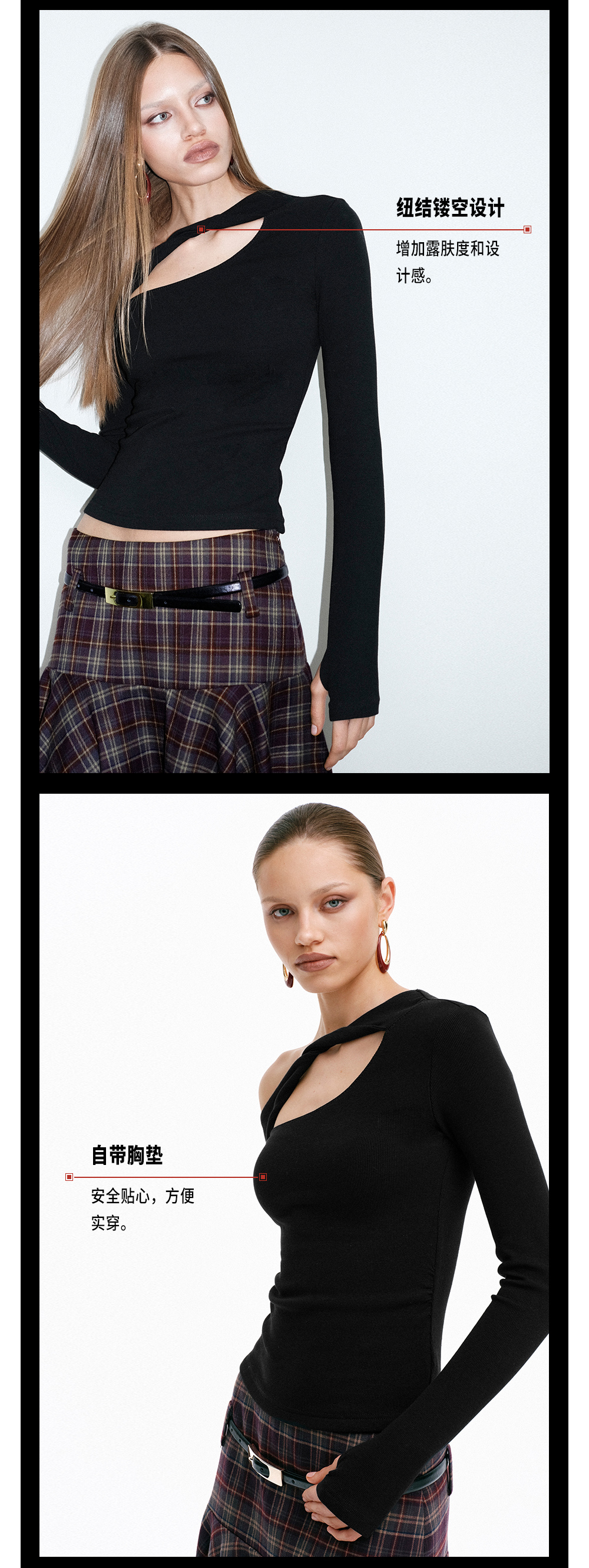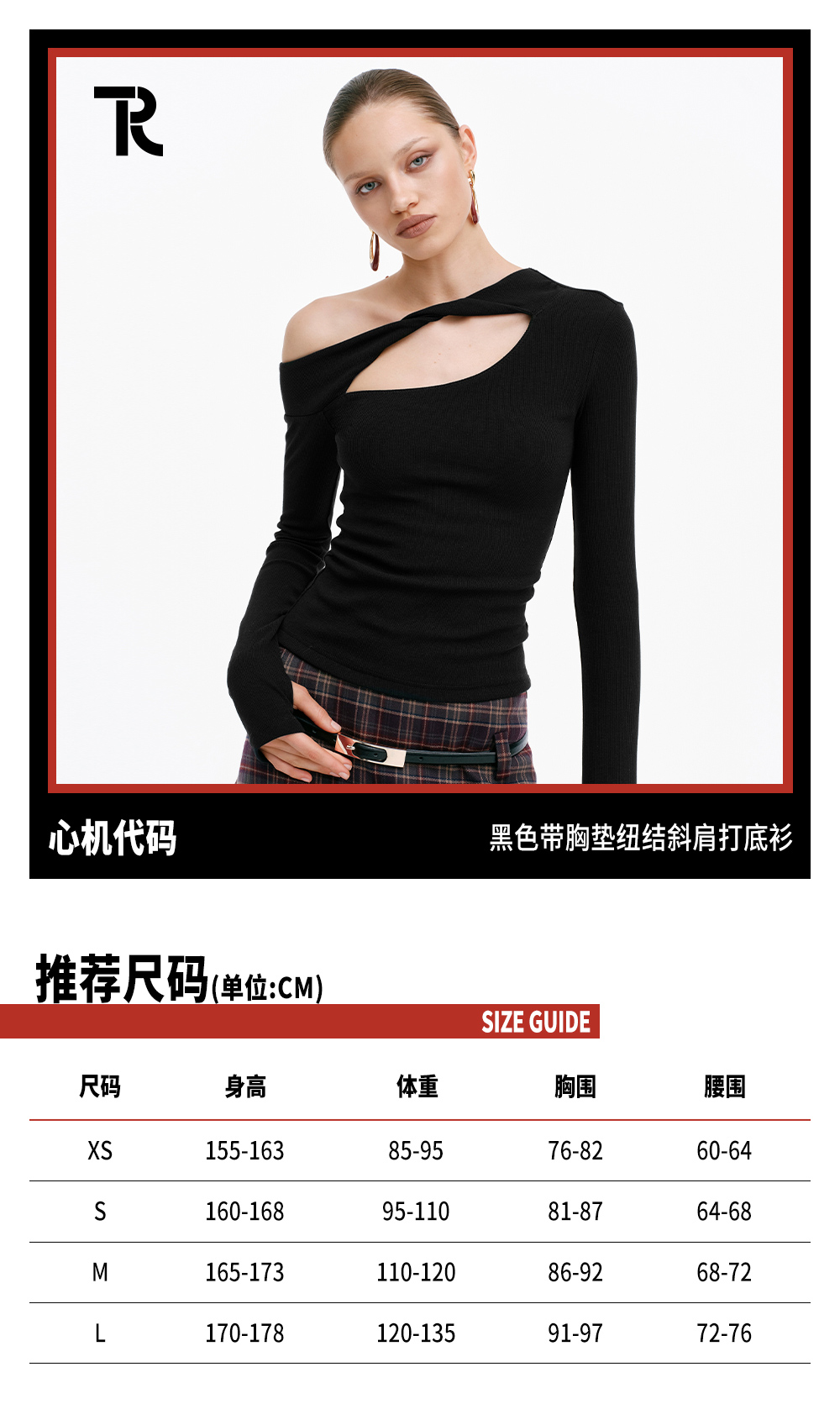TR她热 心机代码 黑色纽结镂空带胸垫显瘦设计感斜肩打底衫上衣