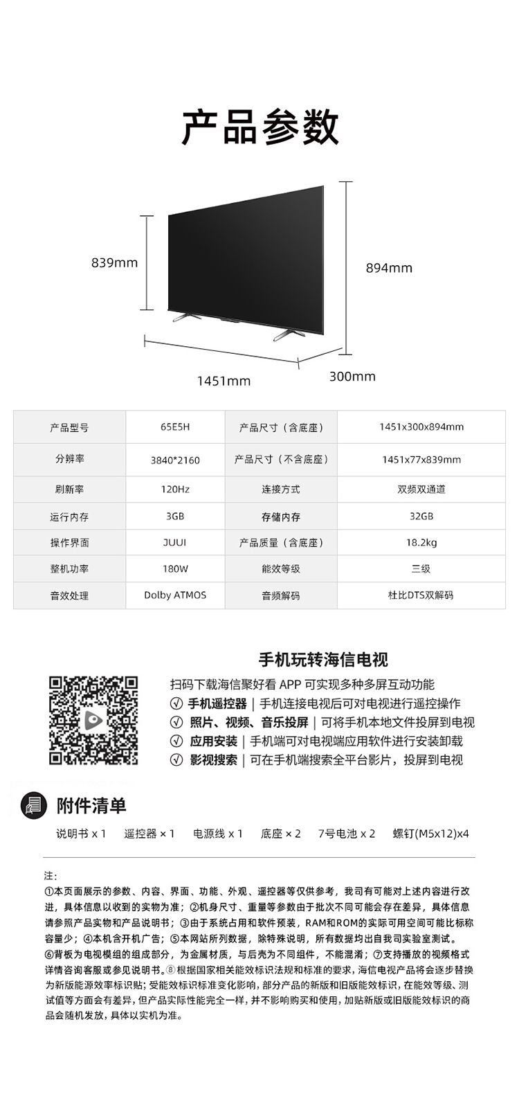 海信电视 65E5H 65英寸 4K超清120Hz高刷多分区 32G大内存旗舰超薄智能全面屏液晶平板电视机