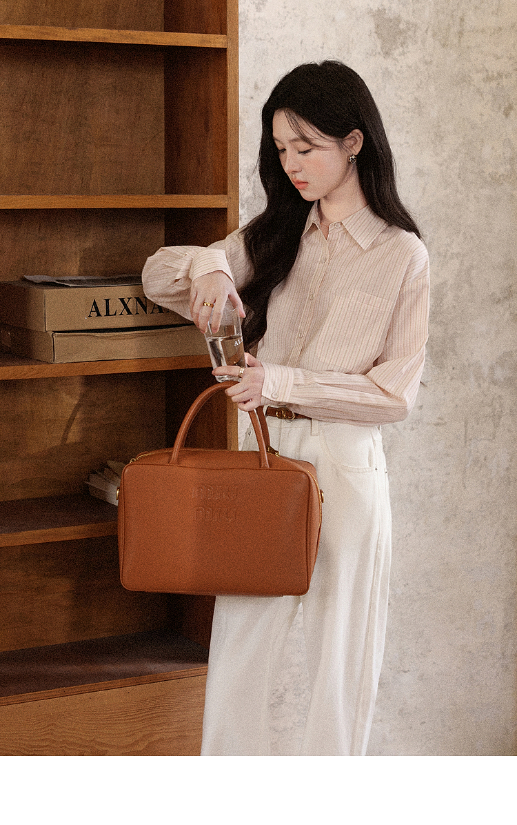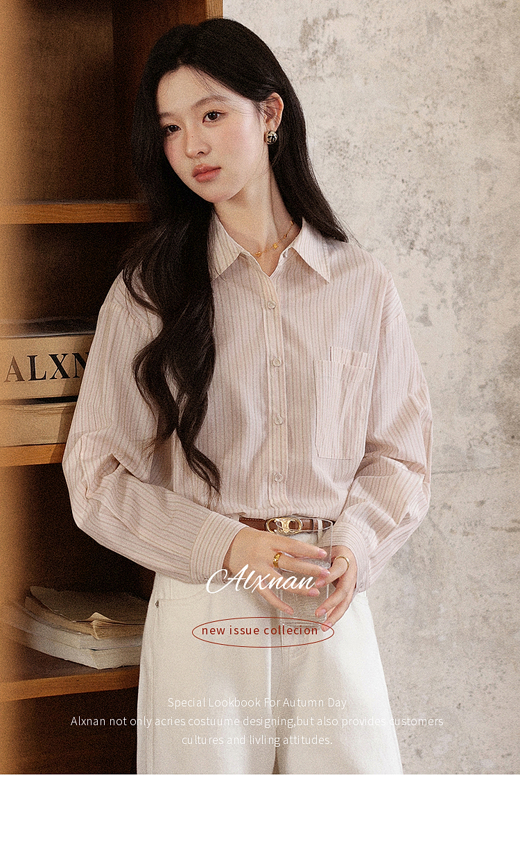 【6折秒杀】鹿向南「花涧蜜语」粉色条纹polo领休闲衬衫女秋宽松减龄长袖上衣L57652