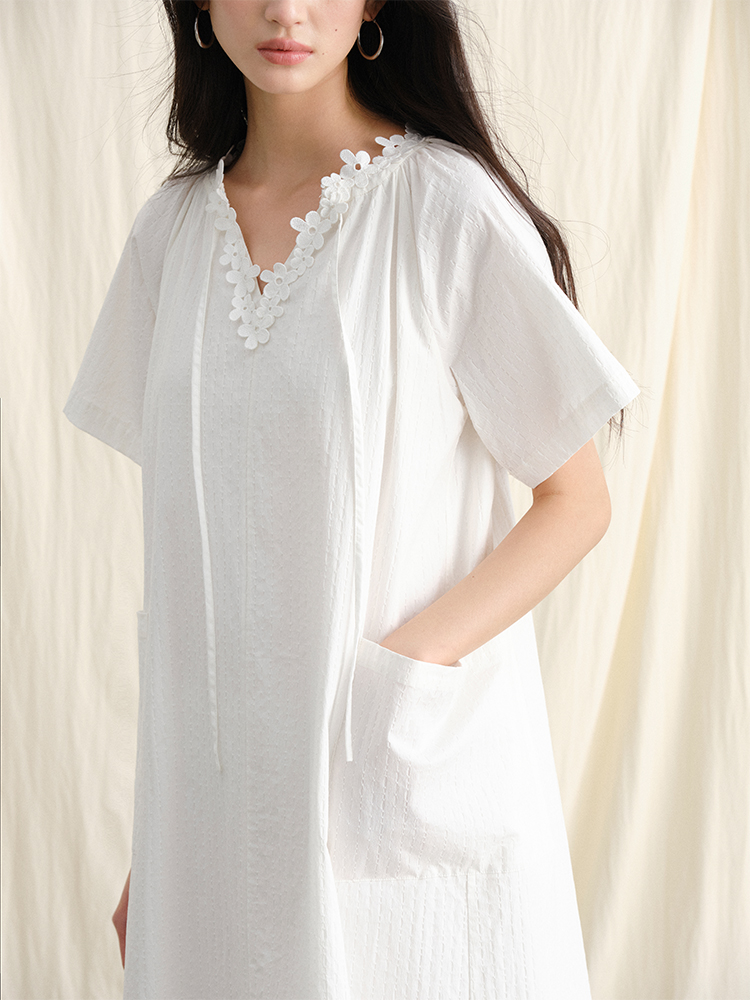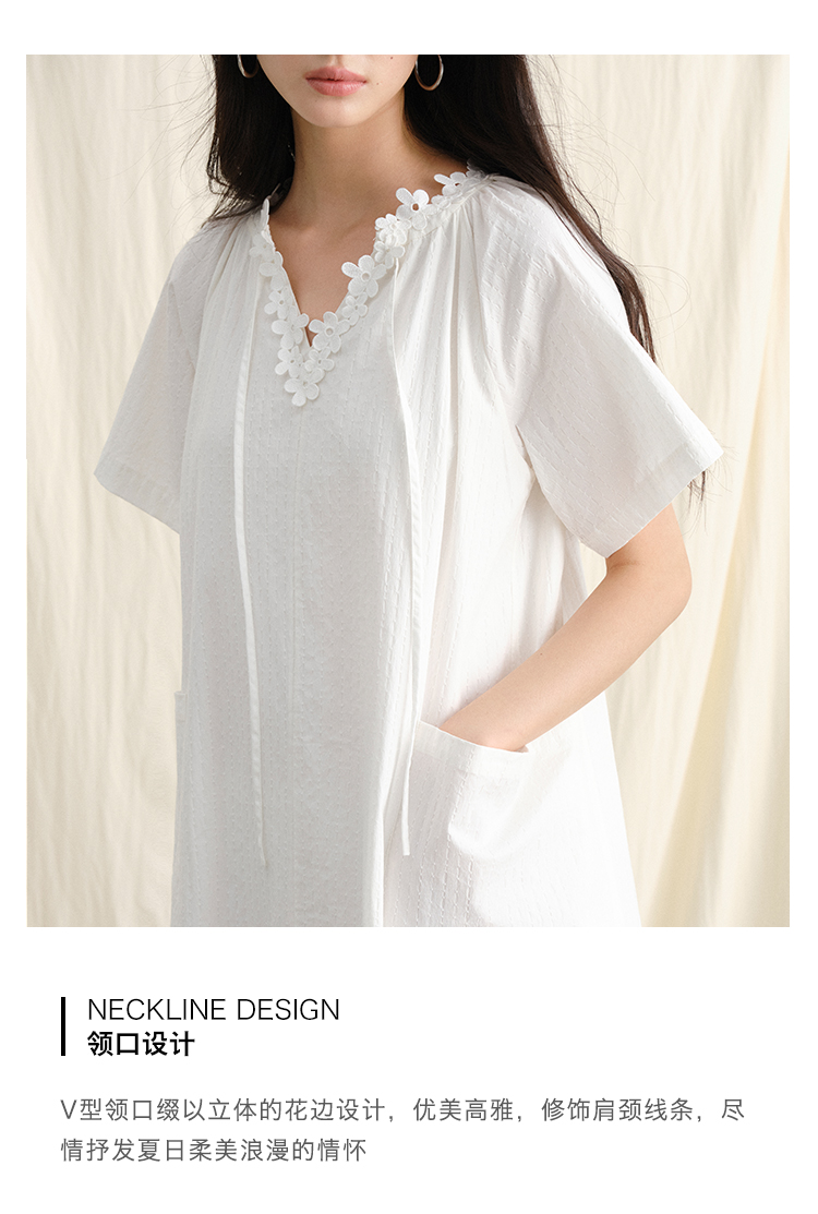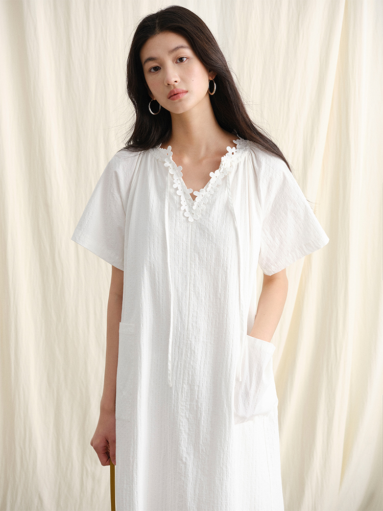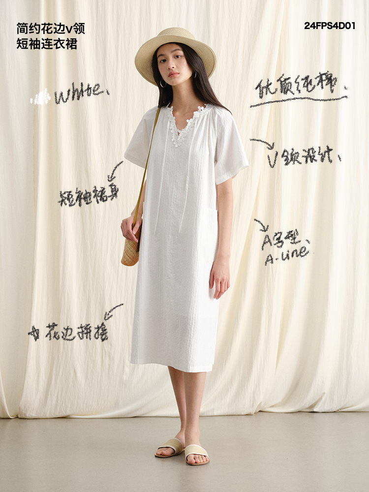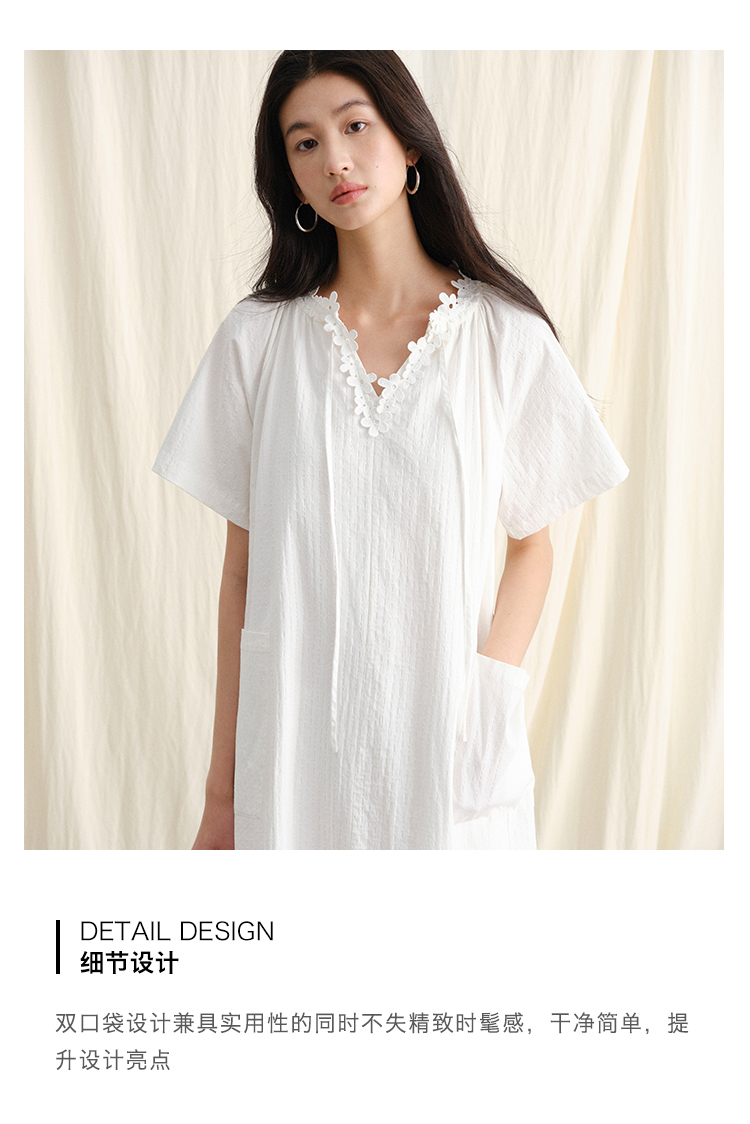 ForPoem 现货 24/SS原创设计简约花边v领短袖肌理感连衣裙