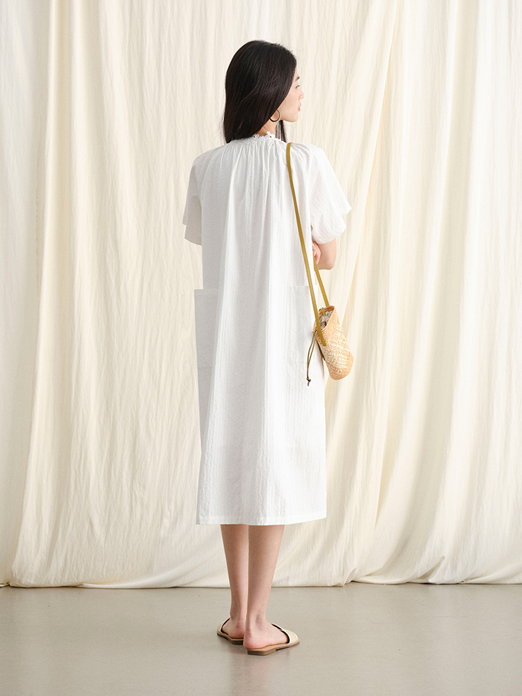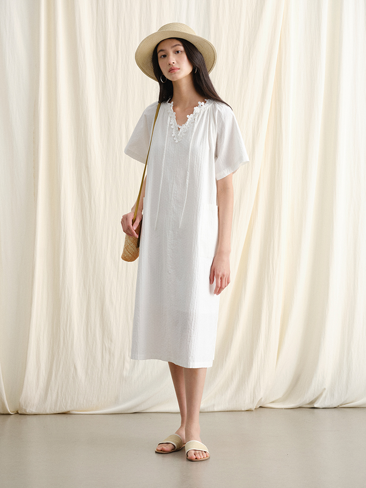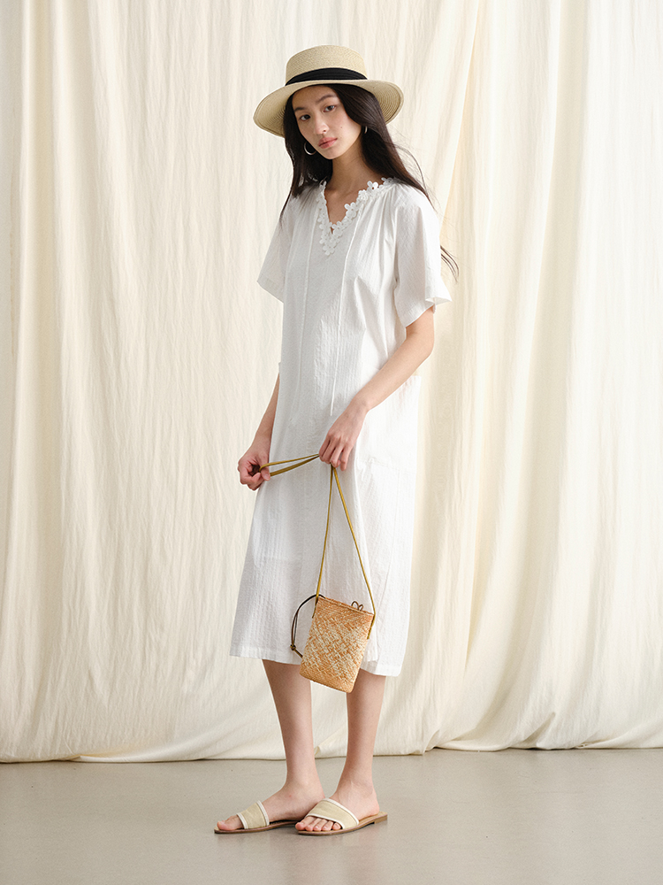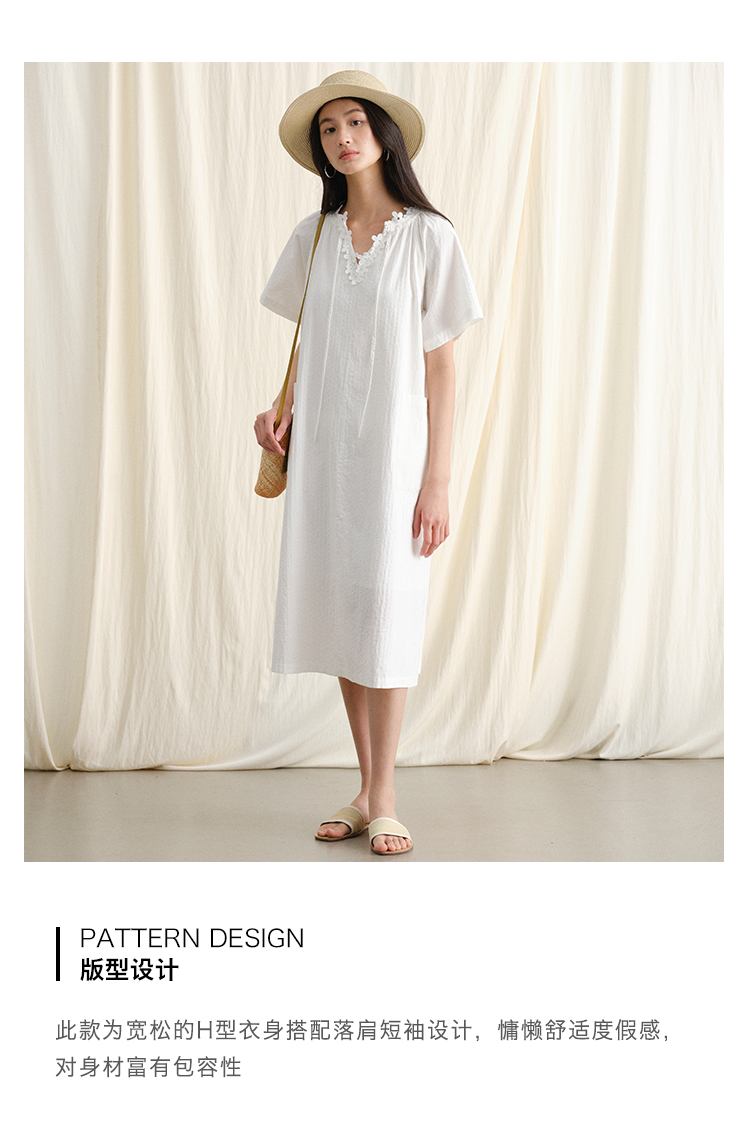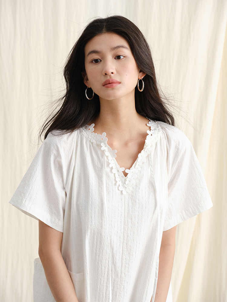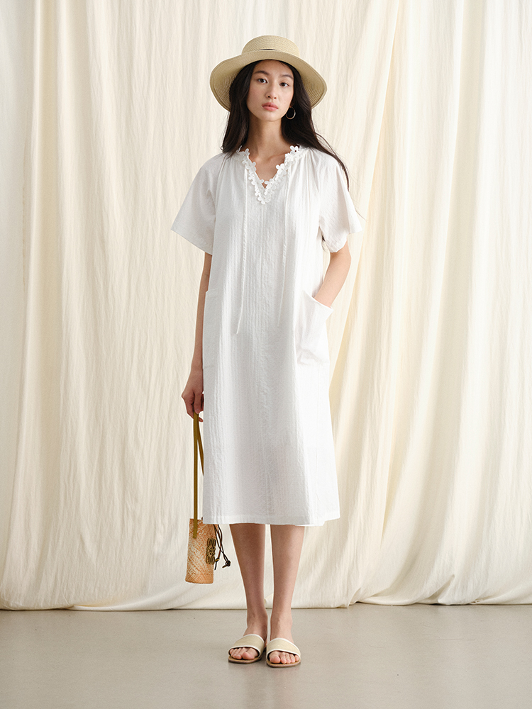 ForPoem 现货 24/SS原创设计简约花边v领短袖肌理感连衣裙