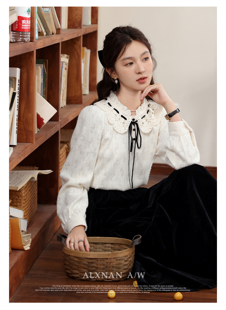 【6折秒杀】鹿向南「秋日蓝调」蓝色娃娃领长袖T恤女秋季显瘦针织衫开衫上衣L56993
