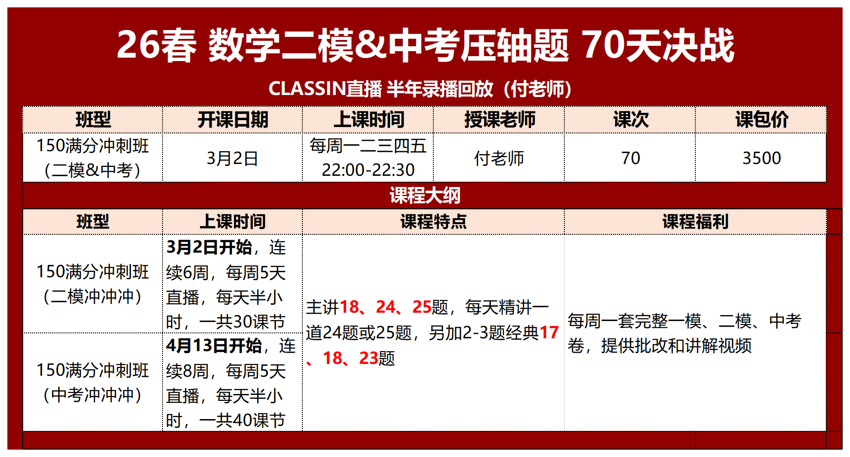 70天集中突破数学二模&中考第18、24、25题压轴题,夯实高频题型基础,系统梳理命题逻辑与解题套路,助力基础扎实的学生突破得分天花板,高效冲刺数学中考满分