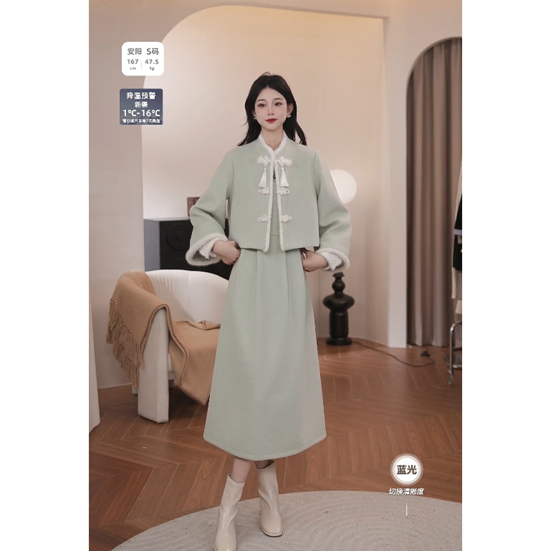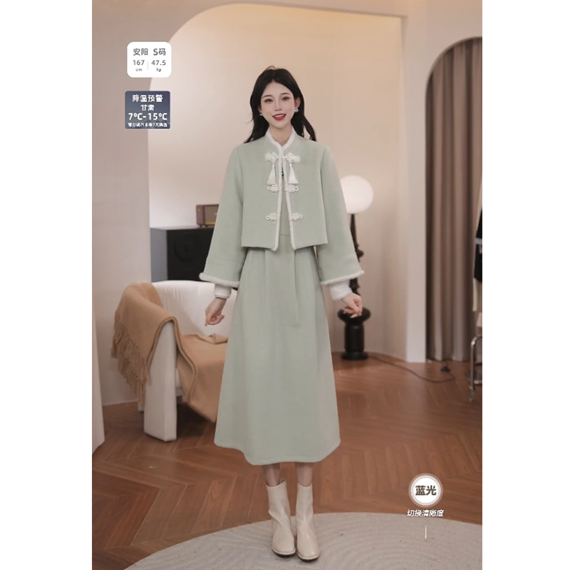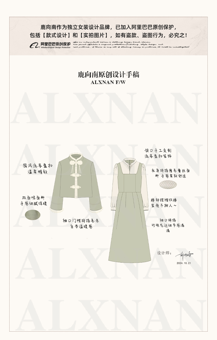 鹿向南「百若绿」新中式连衣裙短外套套装女2024秋冬显瘦气质裙子