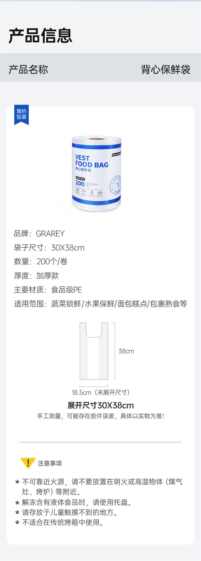 【品名】Grarey格瑞亚-背心保鲜袋 【材质】食品级PE 【规格】1卷200枚 【快递】申通、邮政 【偏远加运费区域】甘肃 宁夏 内蒙古 2kg内+5元;青海、西藏、新疆1kg内+10元 【发货地】福建厦门 【发货时间】下单后48-72小时发出 【售后标准】破损,丢件,少件结构问题包退换。客户签收产品后,无产品质量问题,不影响二次销售的情况下,支持7天内退货退款,退货运费自理。如有质量问题收到后第一时间内反馈)若是质量问题群里反馈并补贴运费