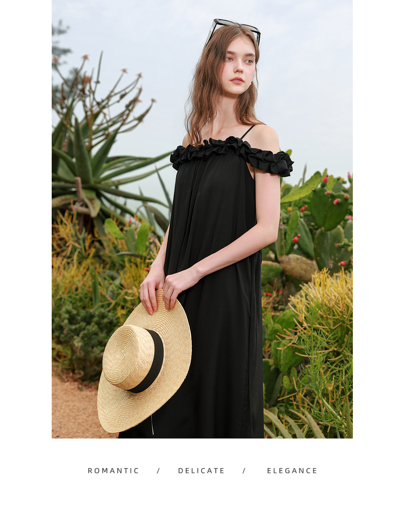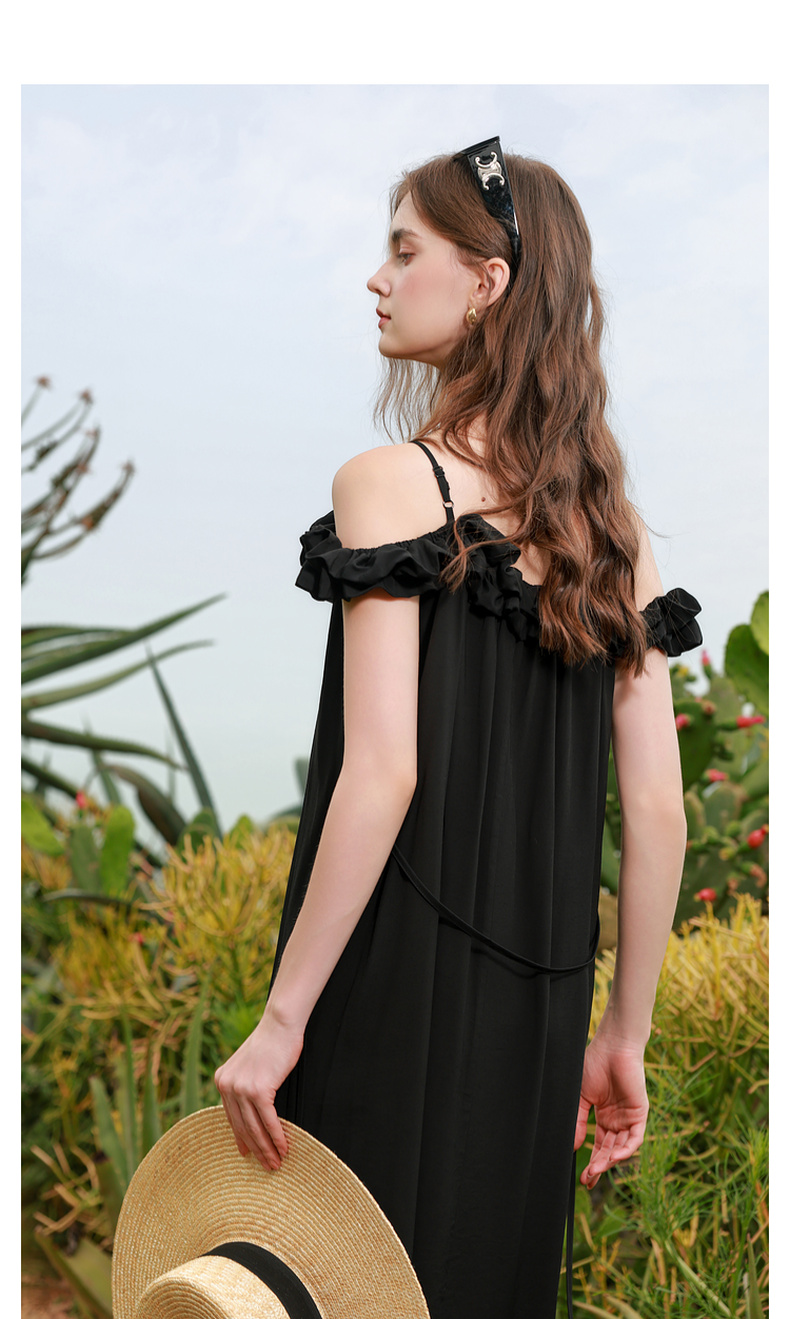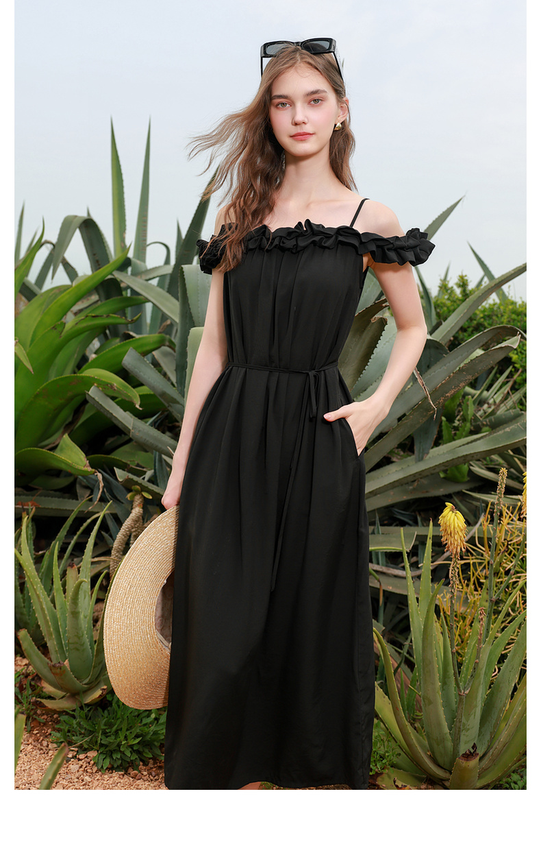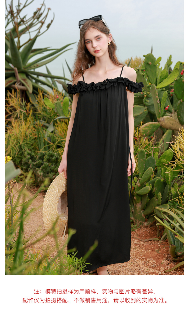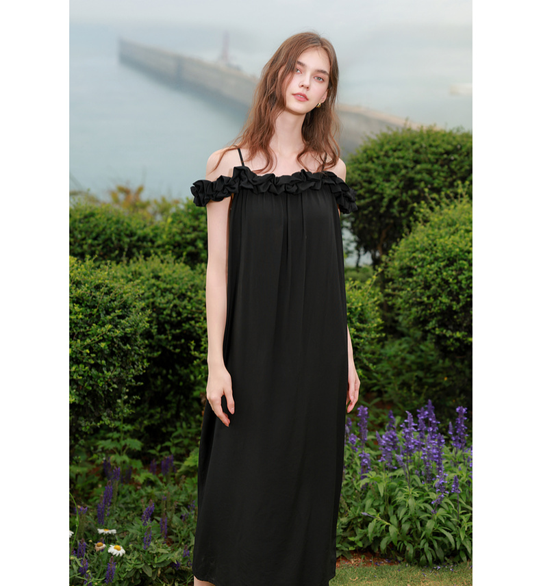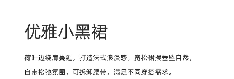 三彩2025夏季新款优雅小黑裙荷叶边连衣裙宽松A字裙长裙M