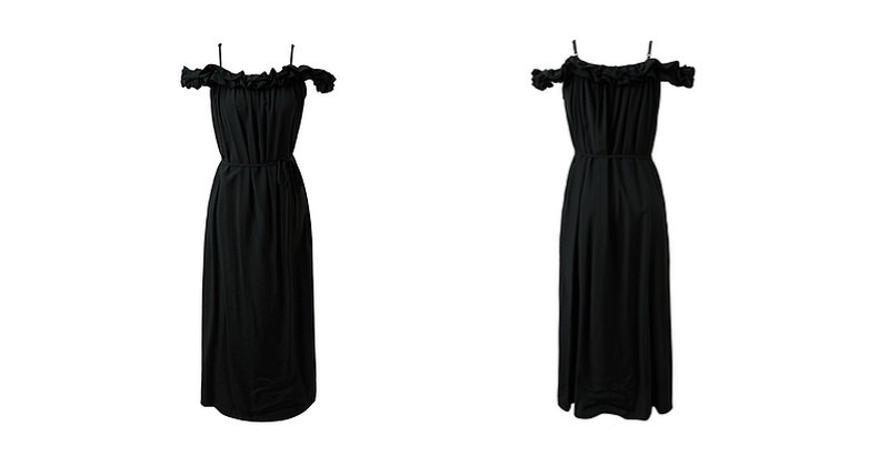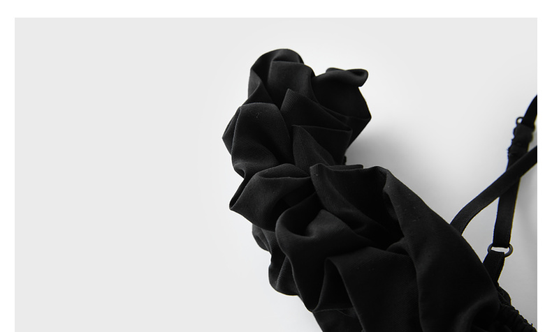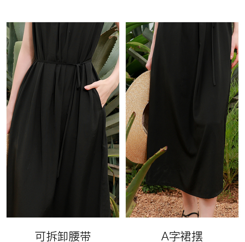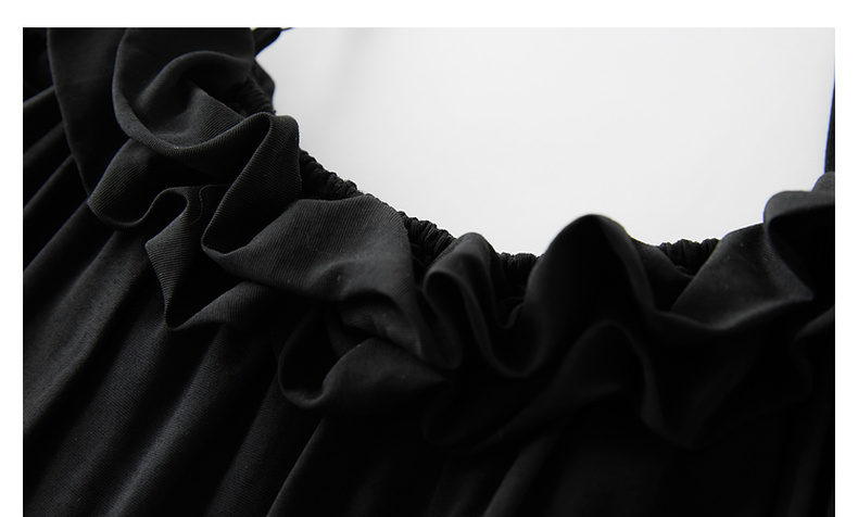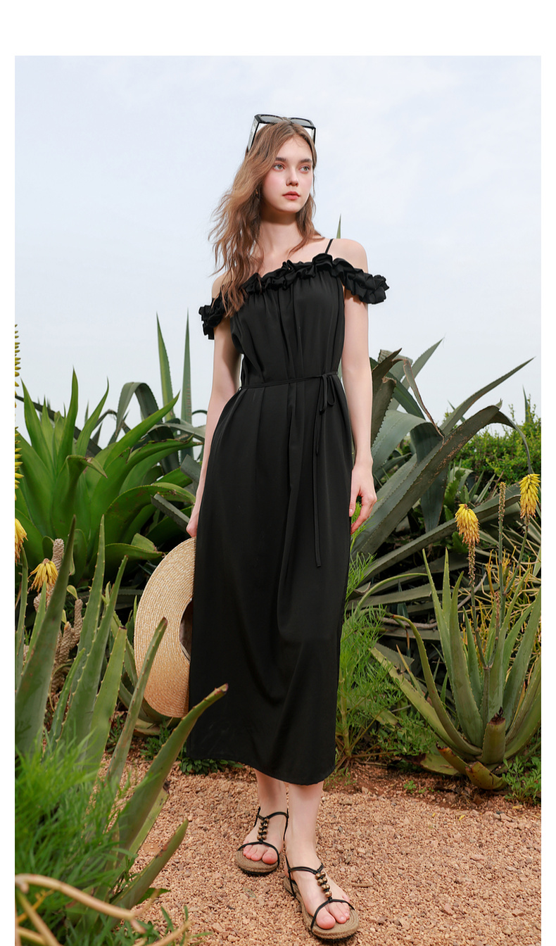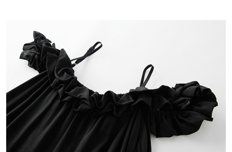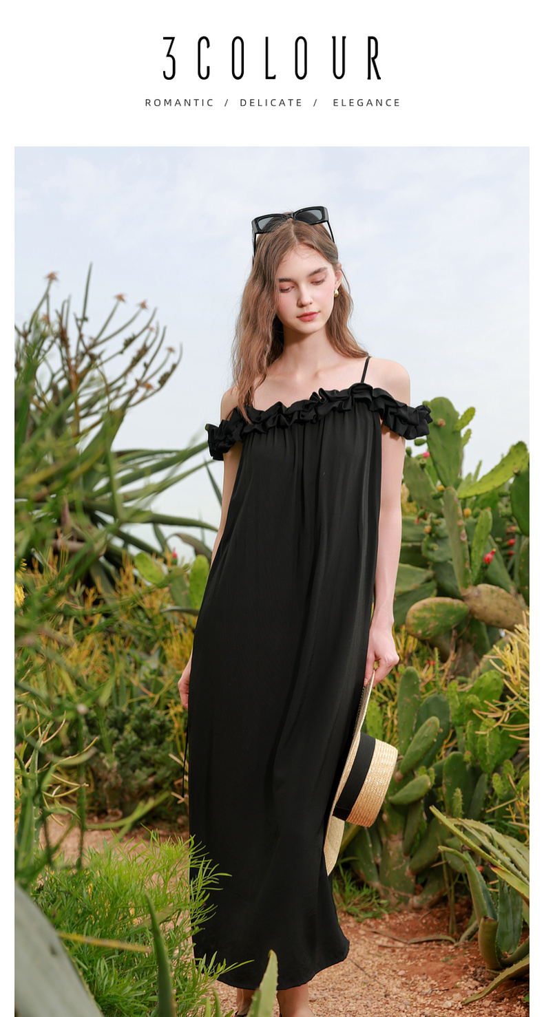 三彩2025夏季新款优雅小黑裙荷叶边连衣裙宽松A字裙长裙M
