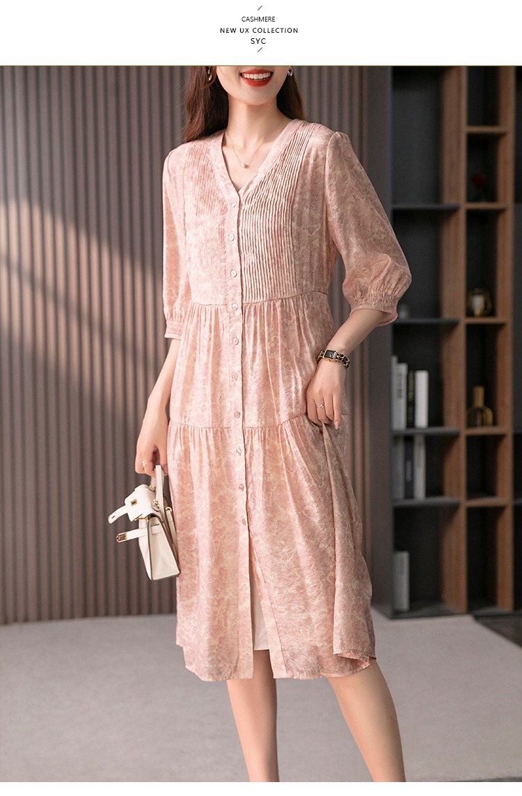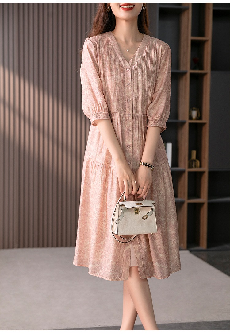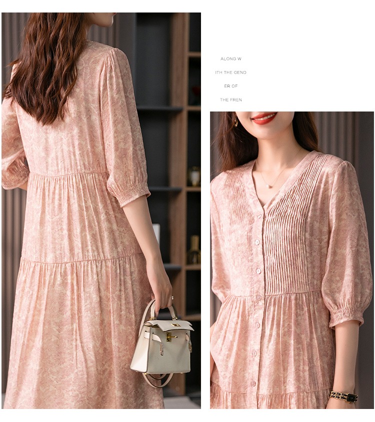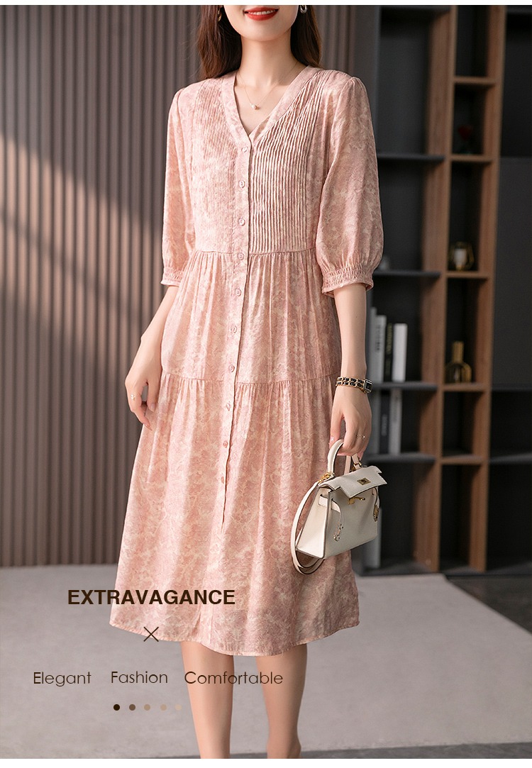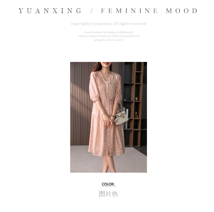 YX【定制17天】气质减龄V领天丝连衣裙灯笼袖显瘦长裙【7.5新款】