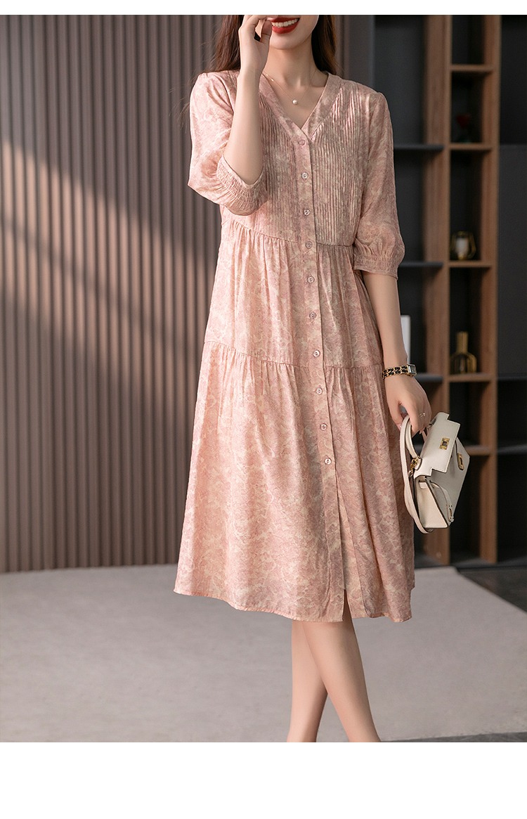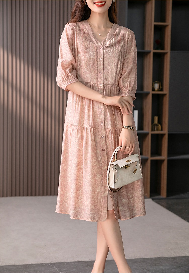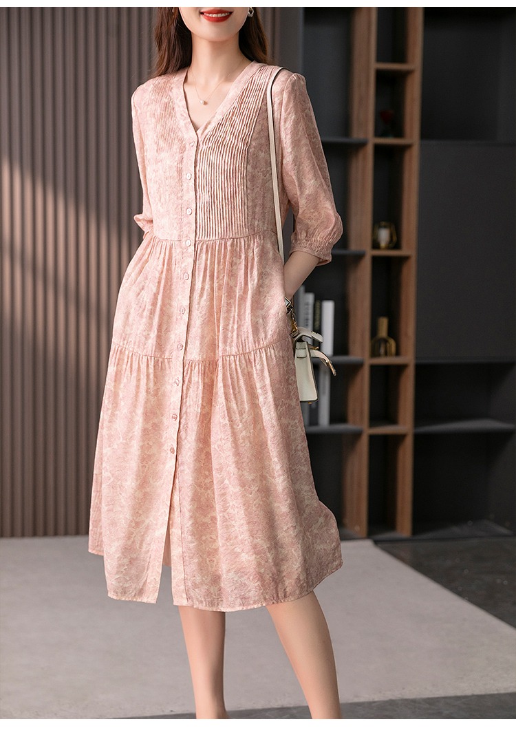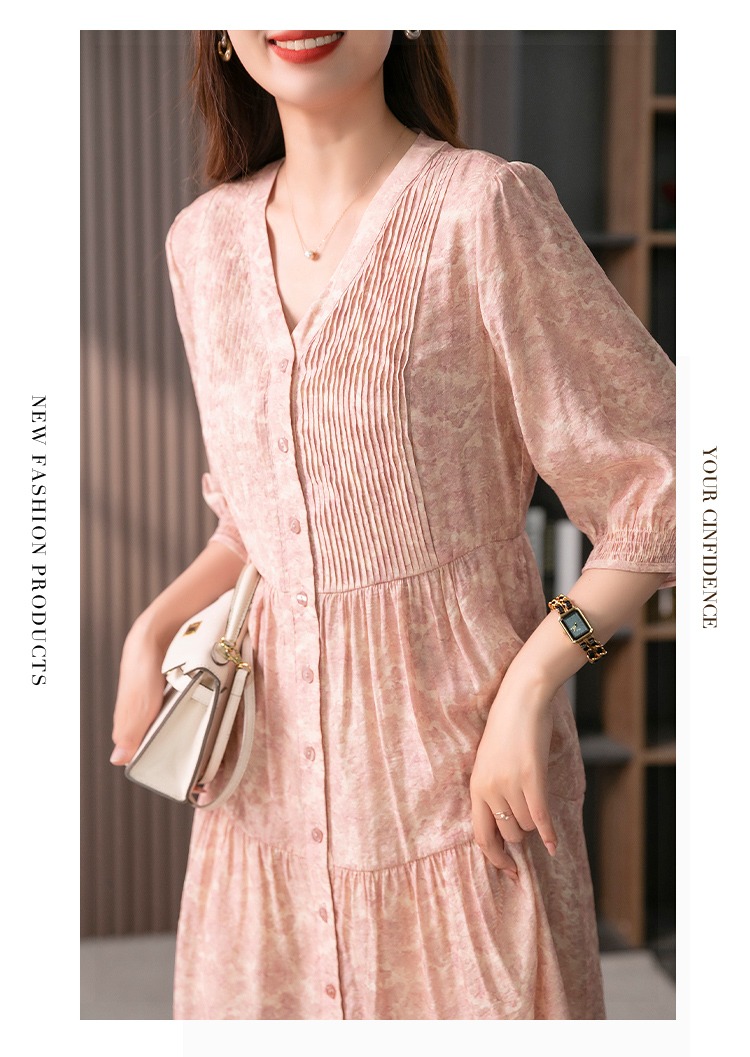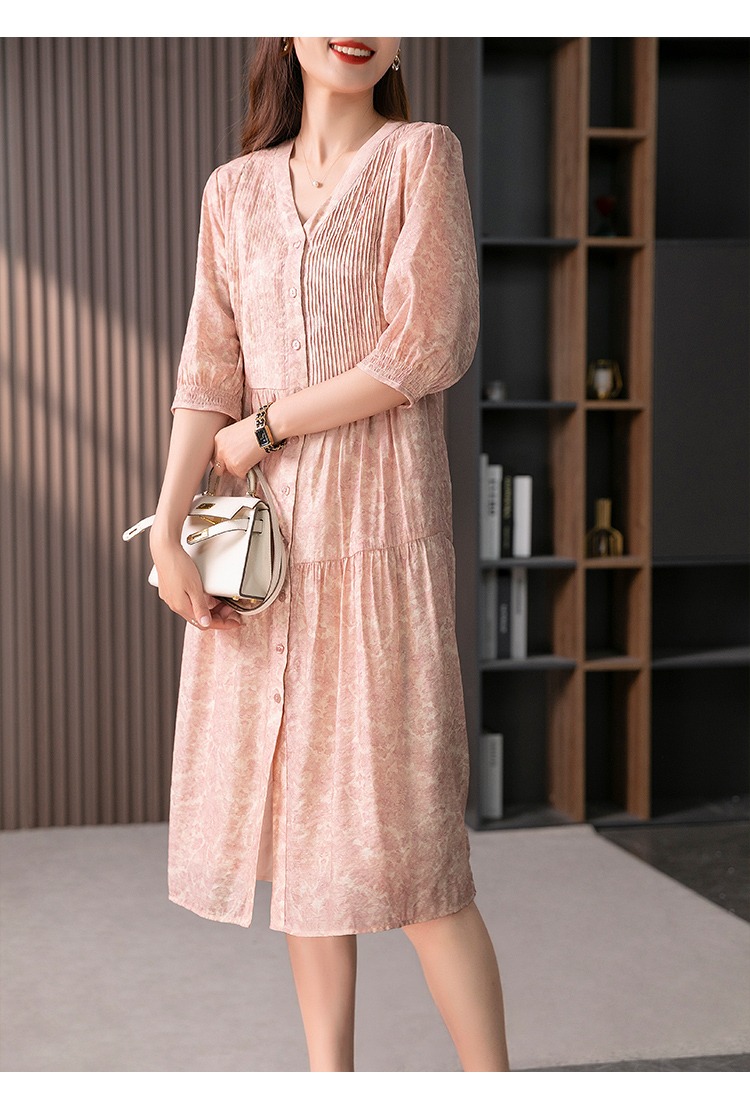 YX【定制17天】气质减龄V领天丝连衣裙灯笼袖显瘦长裙【7.5新款】