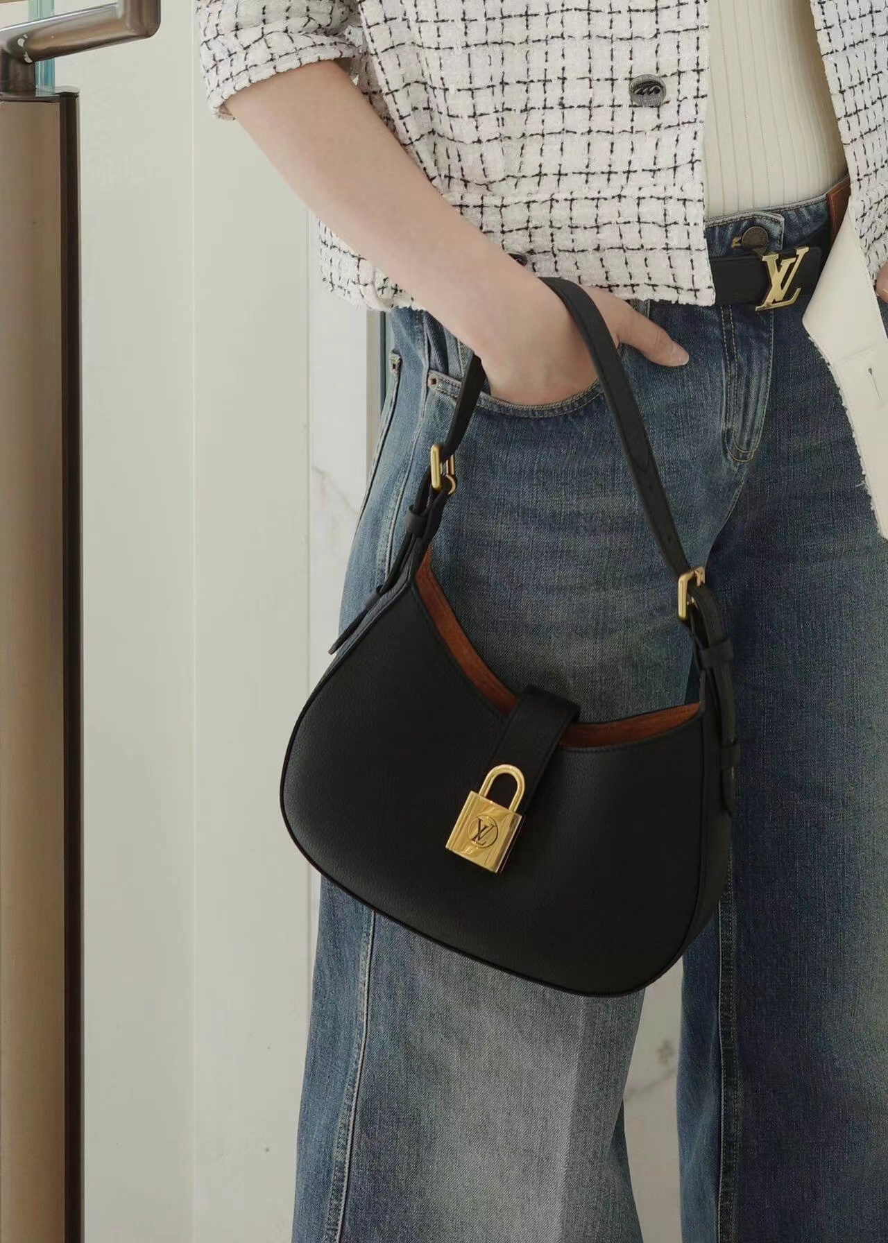 以华美设计再度印证品牌精湛匠艺。柔软牛皮革浸染从容色调,可调节肩带与绒面内衬烘托考究气息,经典 LV 挂锁确保随身物品安全无虞。