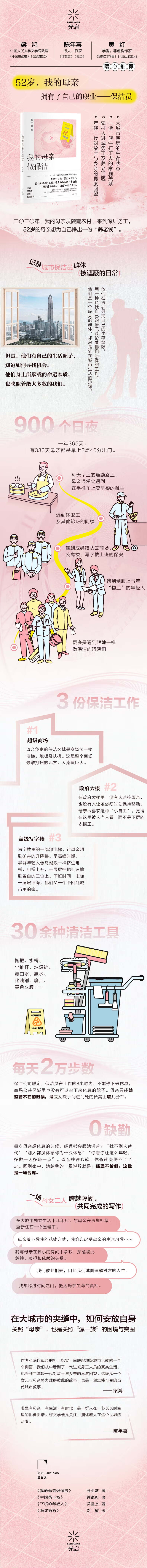 ★城市巨轮运转下,保洁员群体被遮蔽的日常 是谁在维系超级城市的“体面”与“洁净”?这是一群用体力劳作填满超长工作时间的外来务工者,他们在深圳这座包容万象的城市中寻找自己的生存空间,与污渍、垃圾为伴,支撑起城市文明对整洁细节的无限追求。作者张小满的母亲就是城市保洁群体中的一员。他们落脚城市的初衷是如此相似,一路走来的人生又与时代发展的轨迹紧紧捆绑。 他们在深圳寻找自己的生存缝隙,有自己的生活圈子,知道如何寻找机会,很清楚自己在整个阶层划分中的地位,用一种贬低自己的语气谈论着他们所做的工作。他们是一个庞大的群体,却总是处在城市生活的边缘,城市的“整洁”“舒适”“便利”几乎与他们无缘。 而他们身上所承载的命运本质,其实也映照着绝大多数的我们。 ★母与女,“蓝”与“白”,两代人的隔阂与交融 当母亲成为一名城市保洁员后,“我”与母亲重新生活在一起。母亲用批判的眼光观察“我”的生活,而“我”也激烈地回应。但“我”爱母亲,更想理解母亲。“我”试着从了解母亲在超级商场的保洁工作开始去理解她,母亲又为“我”带回非常具体而生动的保洁员群体日常素描,母女二人一起拼贴出这一群体的生存境况。 母亲一辈子都是付出体力劳动的蓝领,而“我”则是看似跃入“体面阶层”的白领,母亲向来以此为荣。随着母女二人在记录保洁员群体故事的过程中,“我”得以重新回望自己的来处,越来越感到,自己很多看似努力的行为,看似接触到的圈子,其实不堪一击,“我”与母亲、与保洁员们,一样是无法豁出去的人,我们有共同的来处。而母亲也在这一过程中,颇感悲伤地意识到,苦读成材的子女,最终也不过是在城市生活中勉力维系一份螺丝钉般的工作,稍有不慎,同样会滑至“主流生活”之外。 通过保洁员群体的故事,或许我们也能关照自身的处境,对自身的生活有所省视。 至于“我”与母亲,两代人之间的真正理解也许永远无法抵达,但记录、书写母亲生活的这一过程,令“我”与母亲比从前任何时候都要信任对方、支持对方。 ★梁鸿、陈年喜、黄灯联袂推荐!