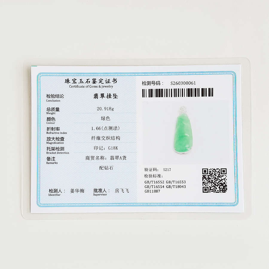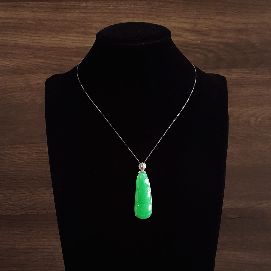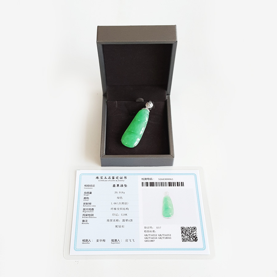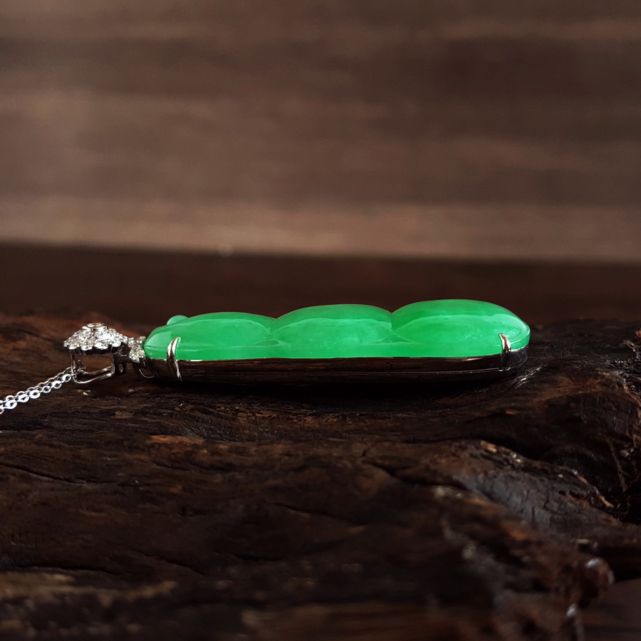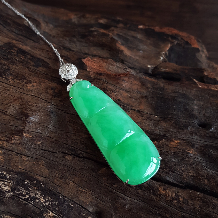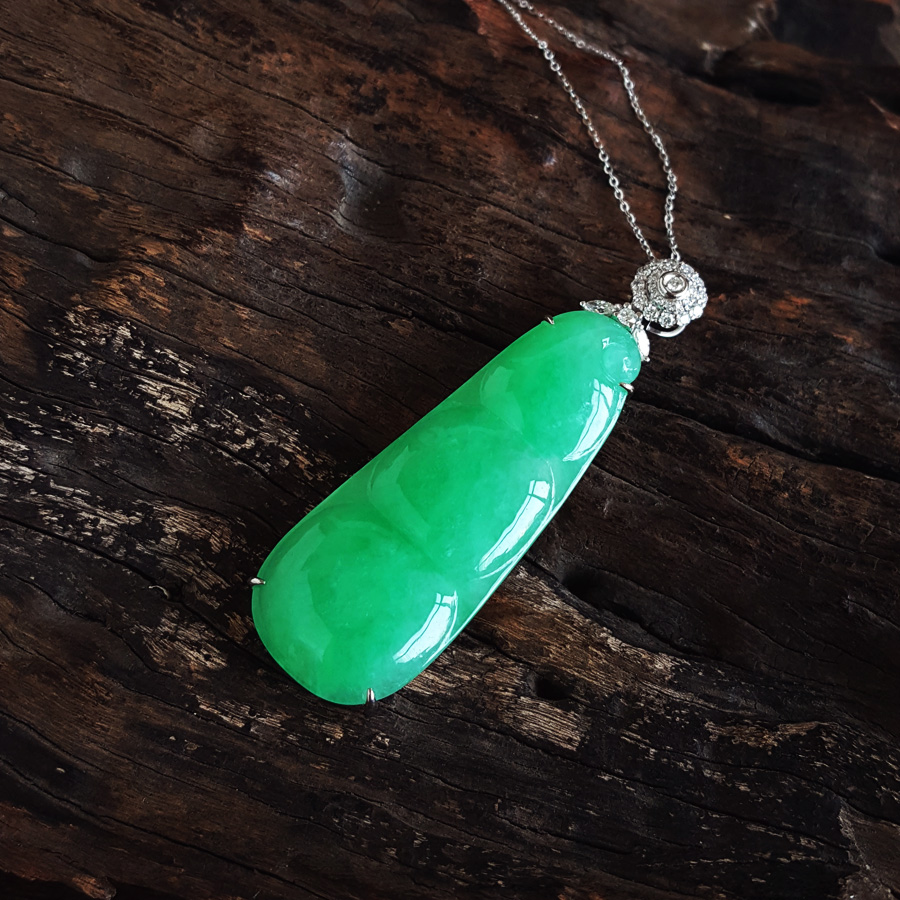 【天然正品】A货翡翠AU750收藏级白金镶钻镶天然细腻糯冰种满绿福豆翡翠吊坠项链58.1*18.5*7.6MM(皆取最大值)280226HSD46