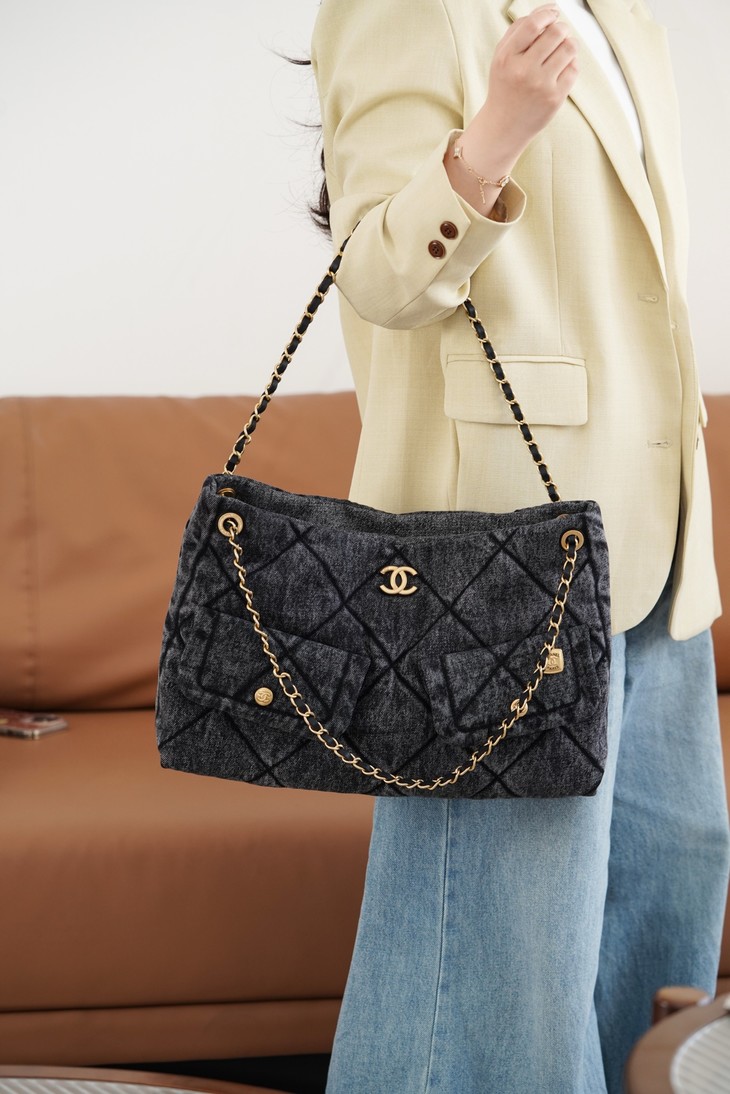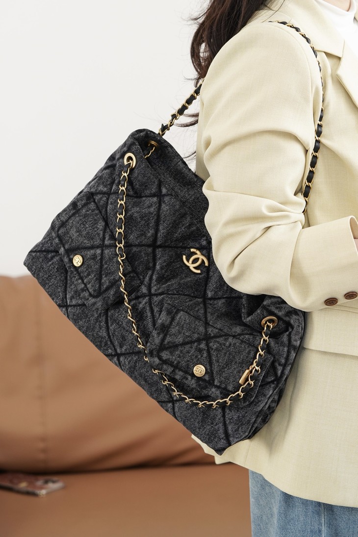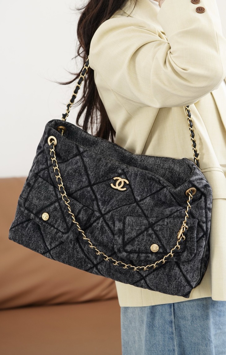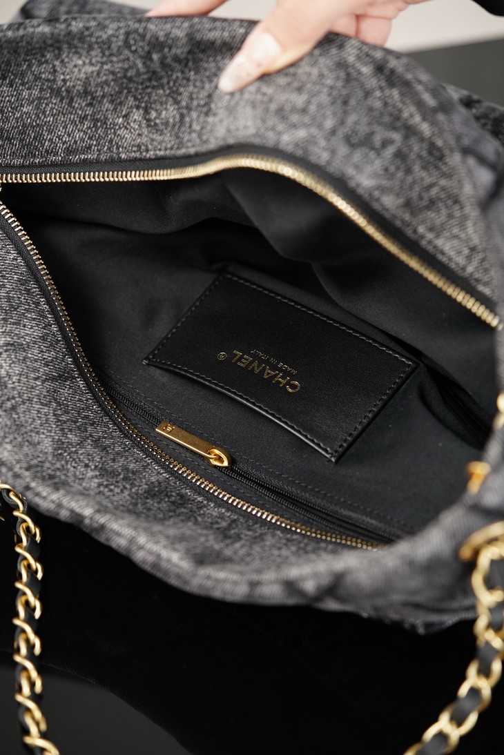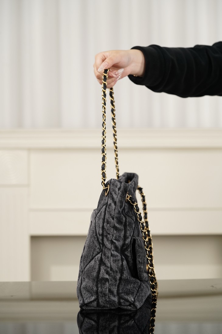 𝐂𝐡𝐚𝐧𝐞𝐥 𝟐𝟓𝐤 𝐇𝐨𝐛𝐨购物袋 黑色牛仔👜 秋冬必备大包🎊慵懒随性的水洗牛仔👏🏻 经典菱格纹与双𝐂五金、链条上的小金牌更是吸睛🤩 复古腔调拉满的同时、又因为𝐇𝐨𝐛𝐨的随性慵懒,让这只包成为“颜值硬通货” 👜 把“优雅”跟“松弛”柔和的恰到好处~ 包型软乎乎、随手一挎就很有范😎 前后都有口袋夹层、收纳的一把好手👏🏻 你绝对会为这只包包的所有细节心动!! 尺寸:𝟑𝟖𝐱𝟐𝟔𝐱𝟏𝟏𝐜𝐦