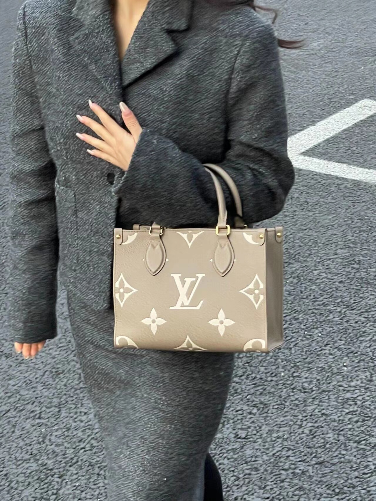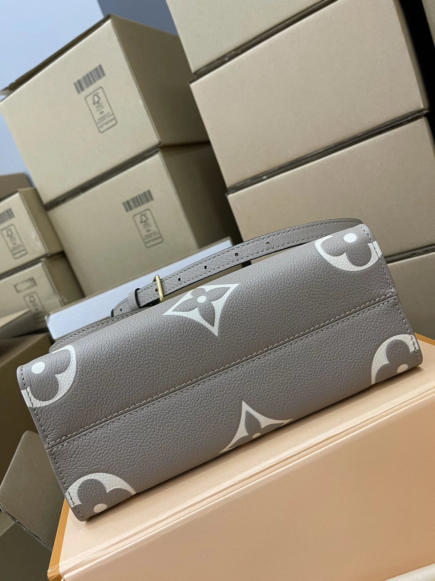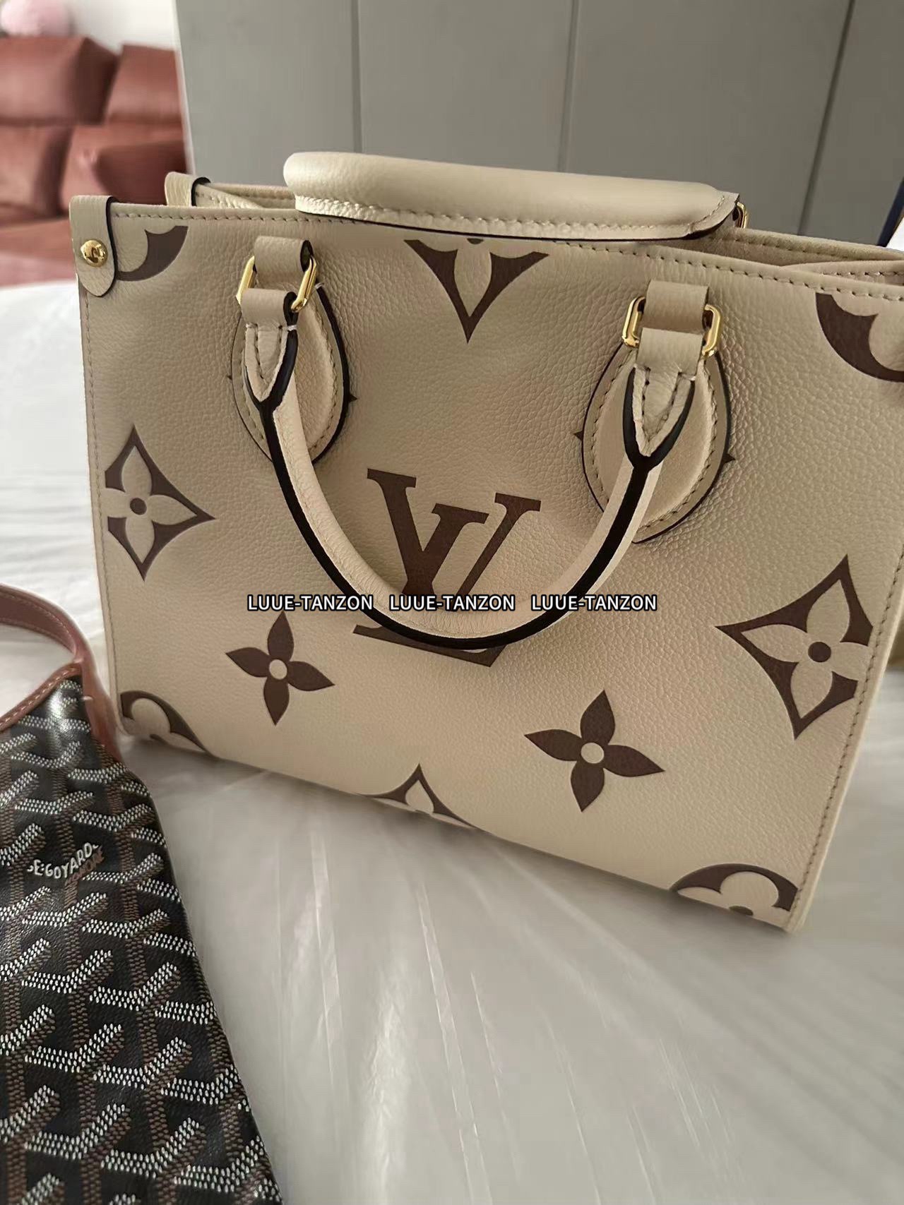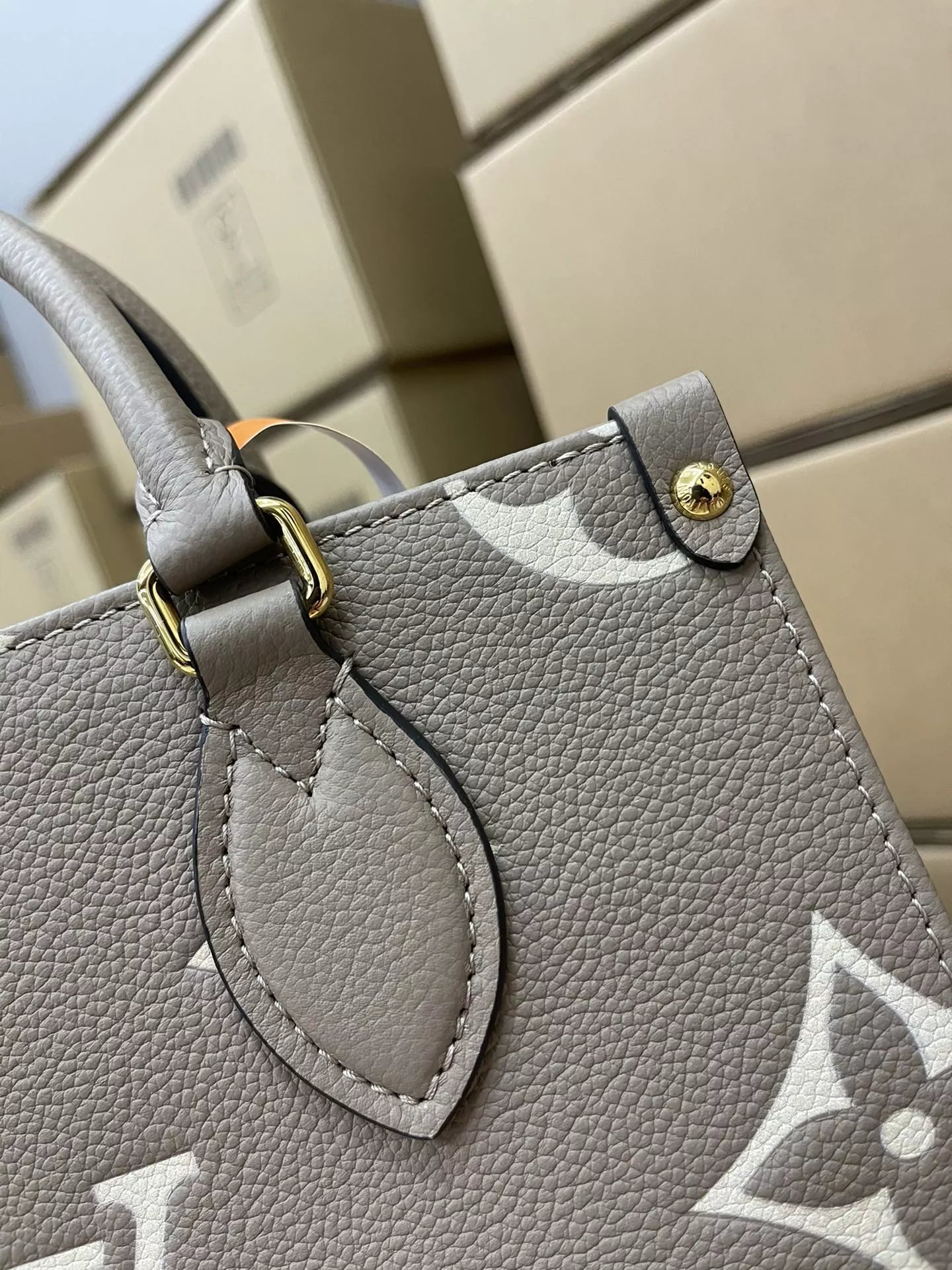本款 OnTheGo 小号Tote 包将 Monogram 图案先印染后压印于柔软粒面牛皮