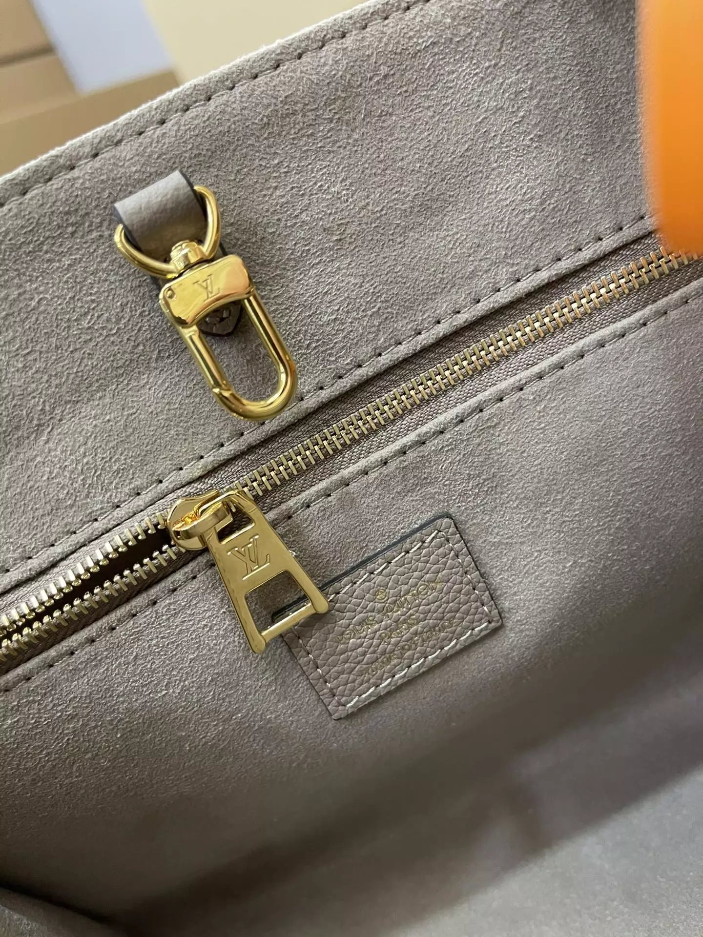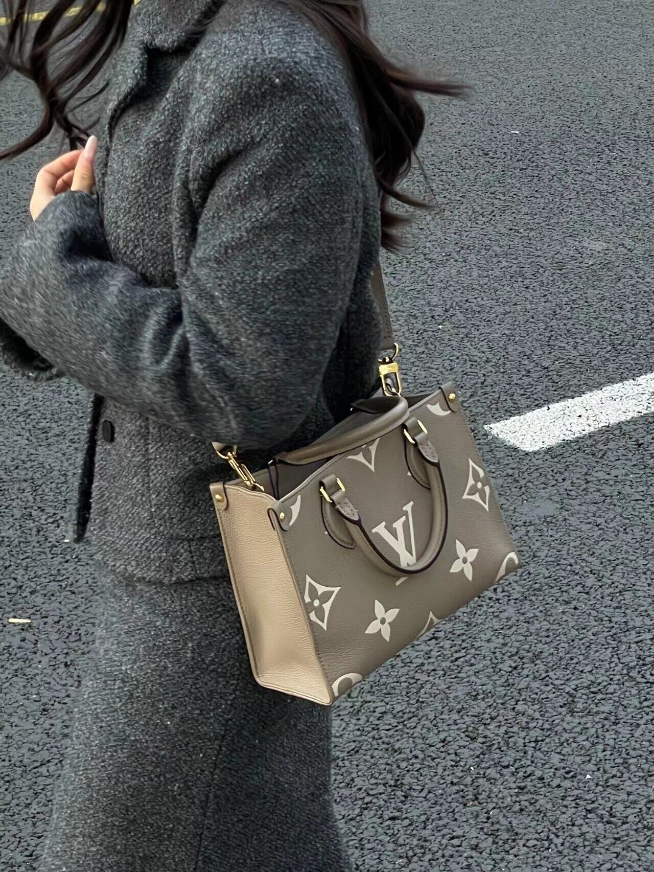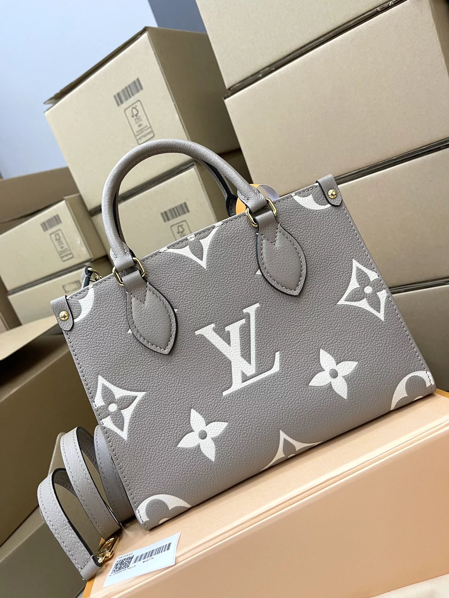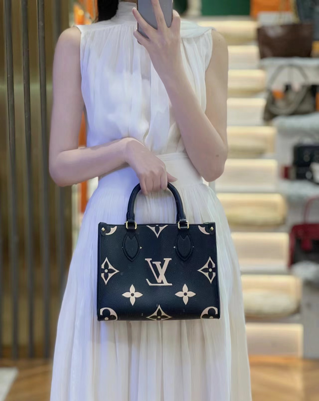本款 OnTheGo 小号Tote 包将 Monogram 图案先印染后压印于柔软粒面牛皮