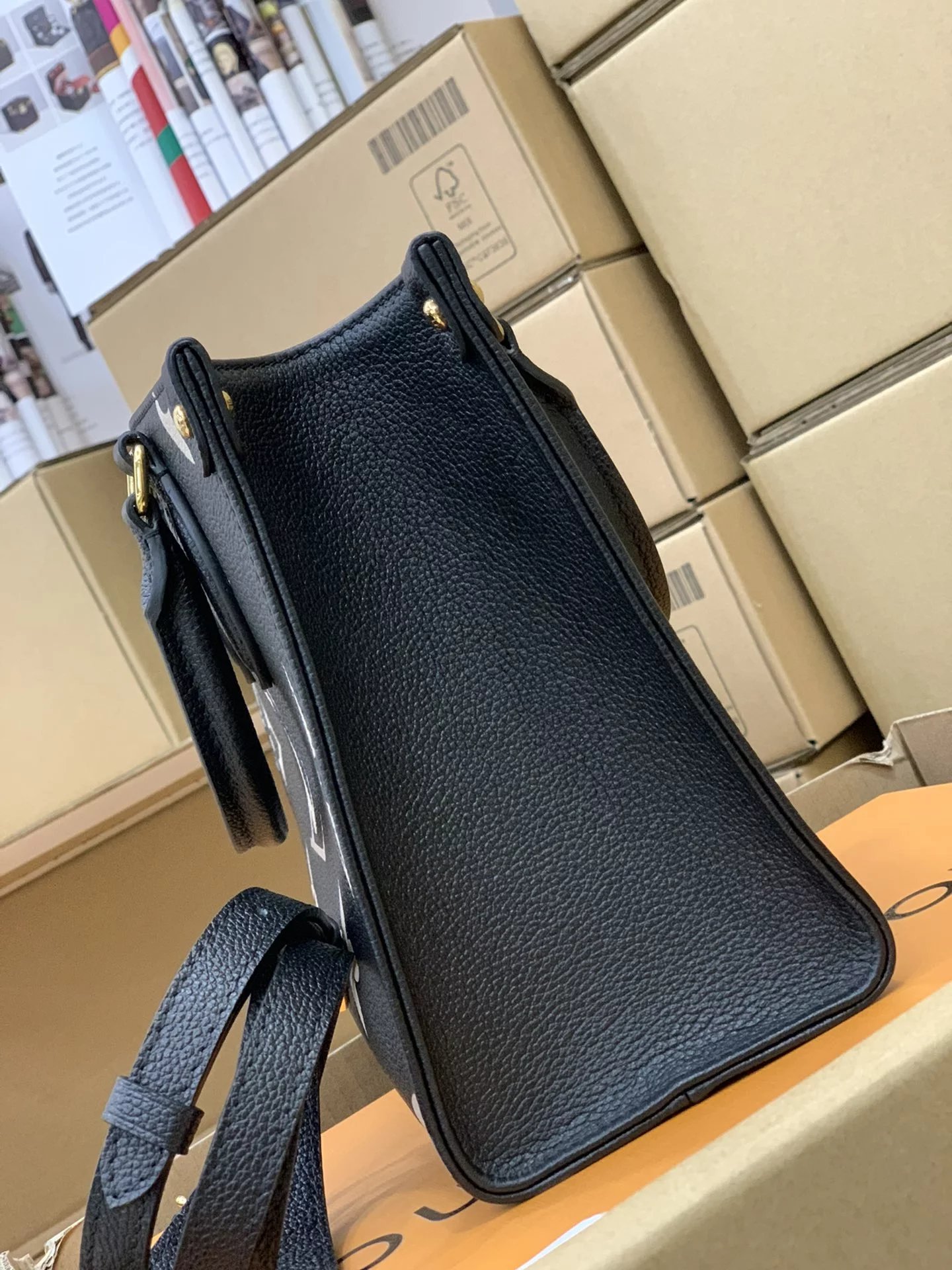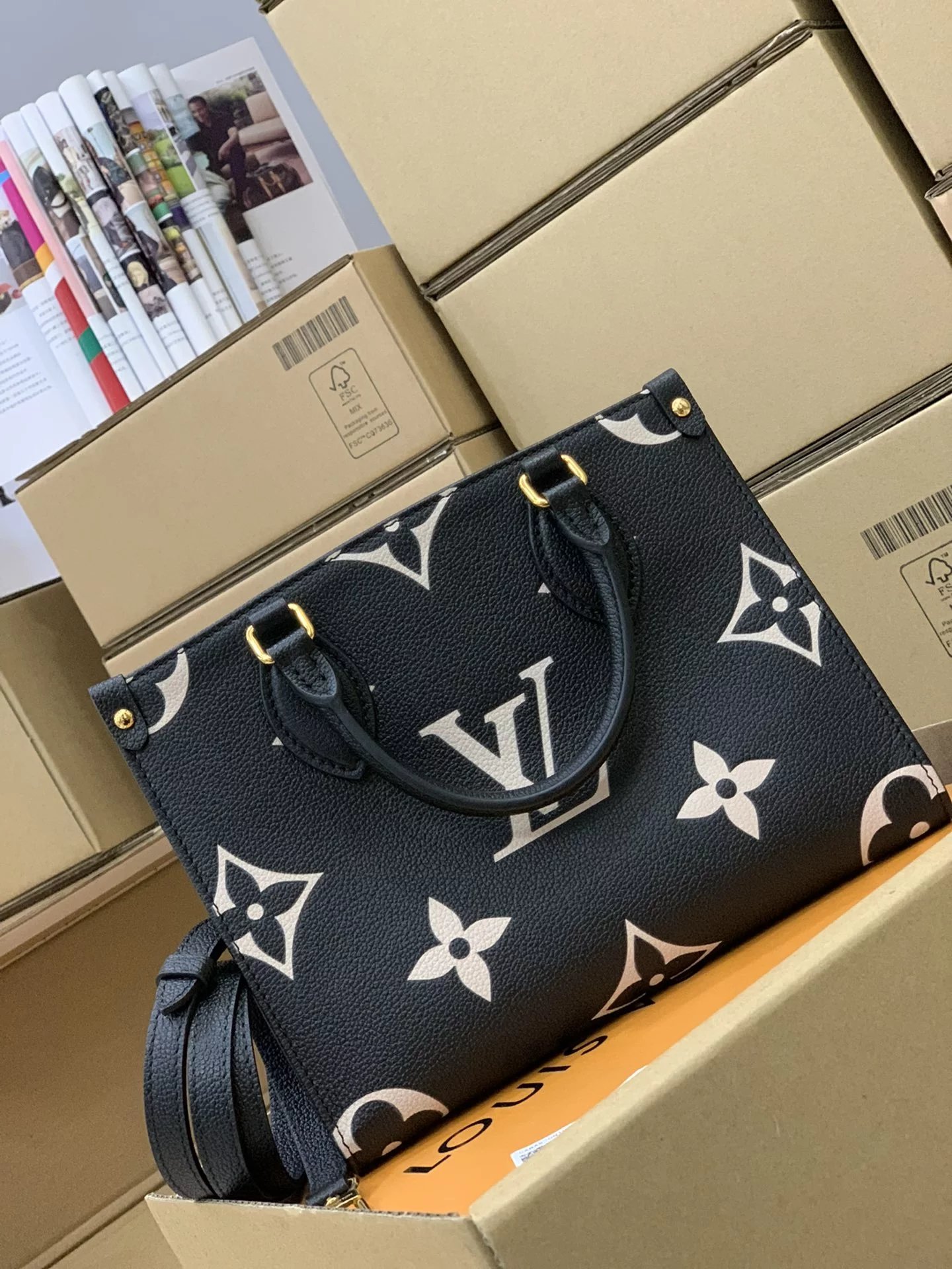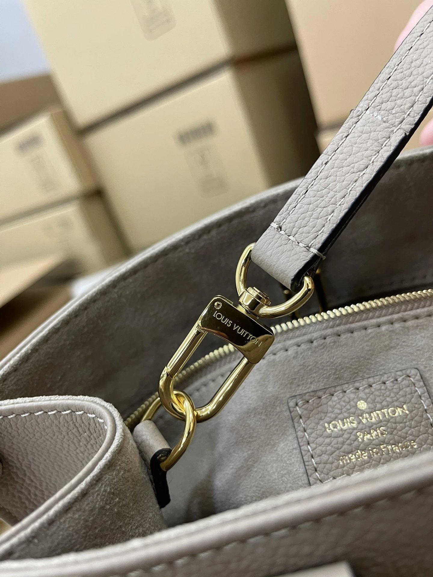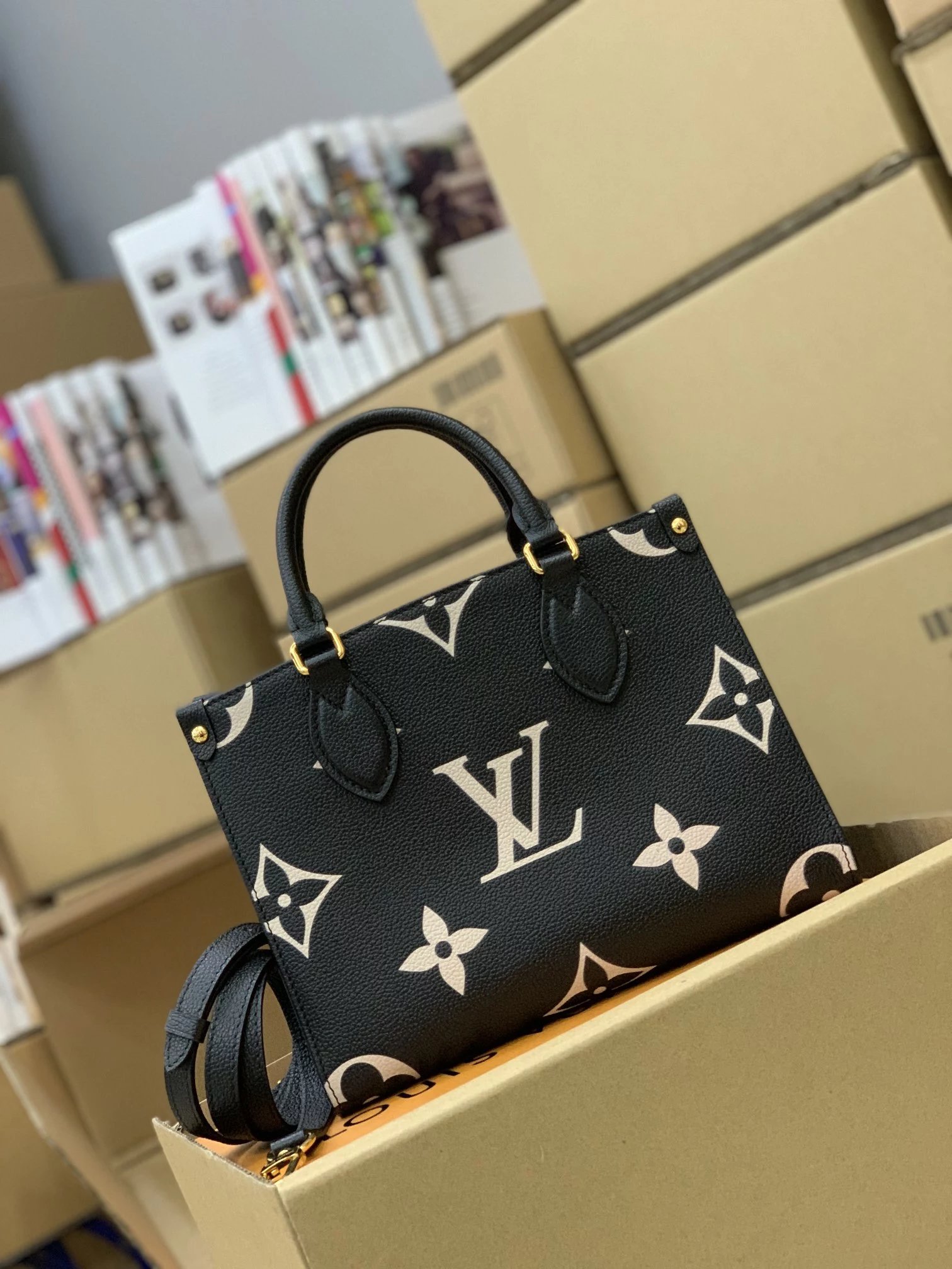 本款 OnTheGo 小号Tote 包将 Monogram 图案先印染后压印于柔软粒面牛皮