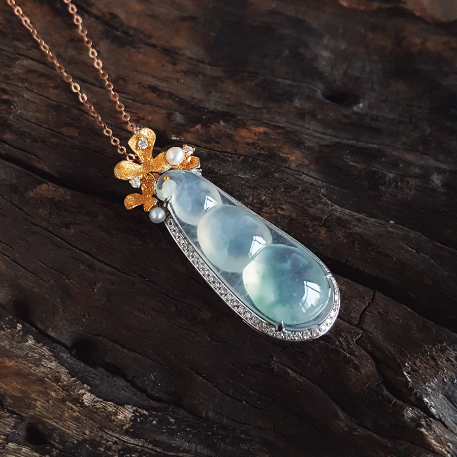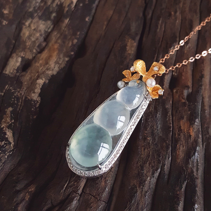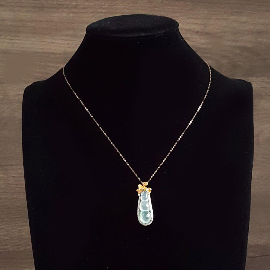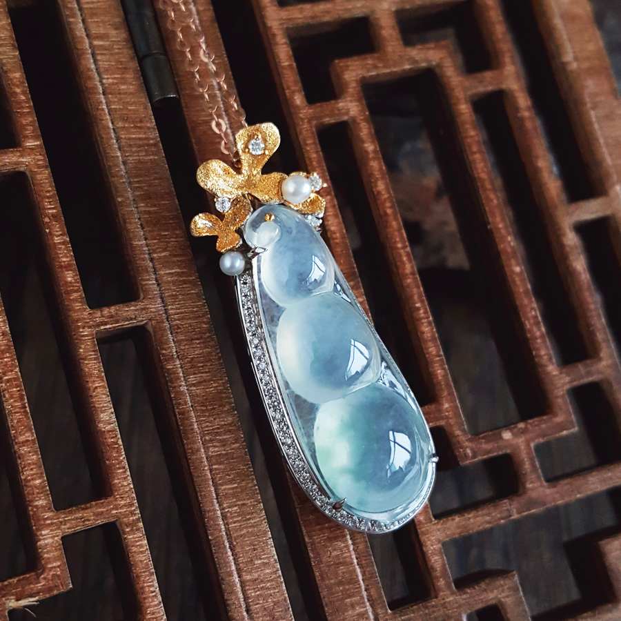 名称 | AU750双色金镶钻镶天然细腻飘蓝花冰种福豆翡翠配珍珠吊坠项链 |