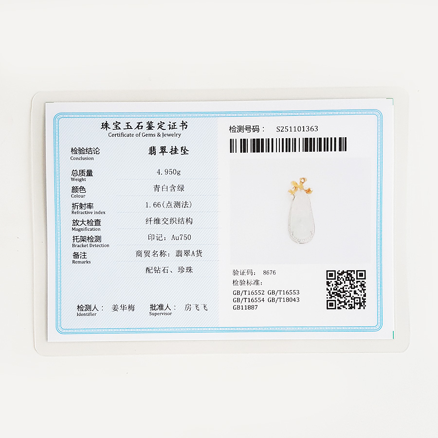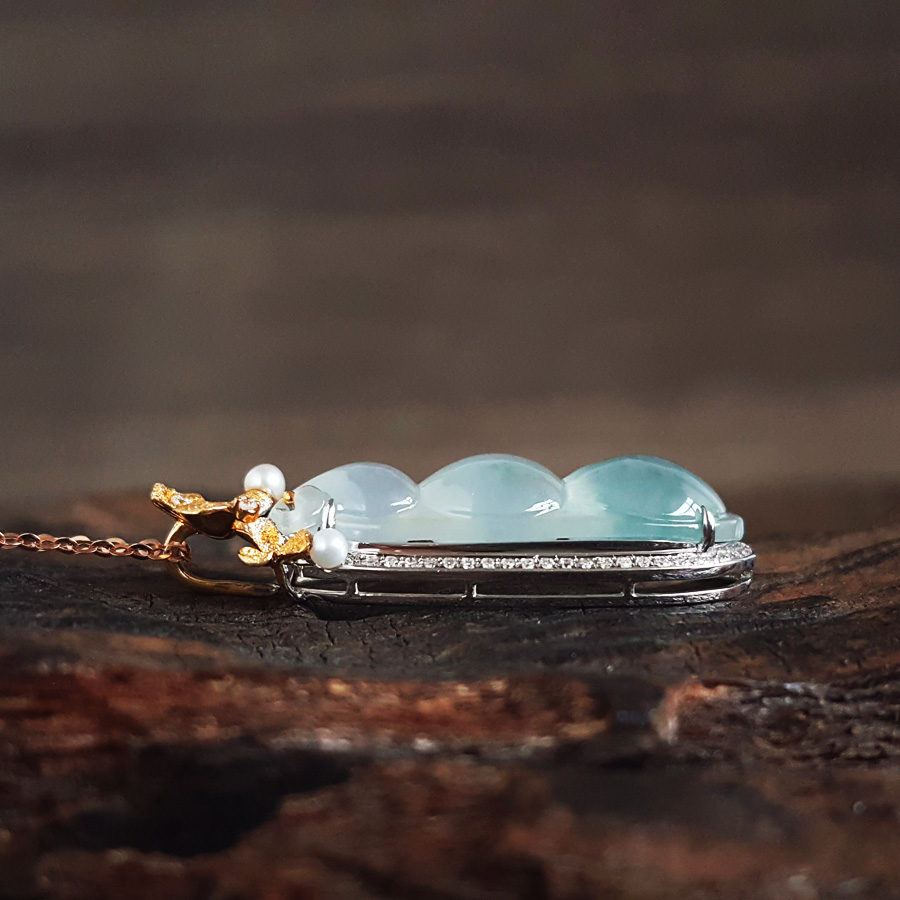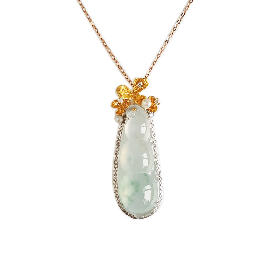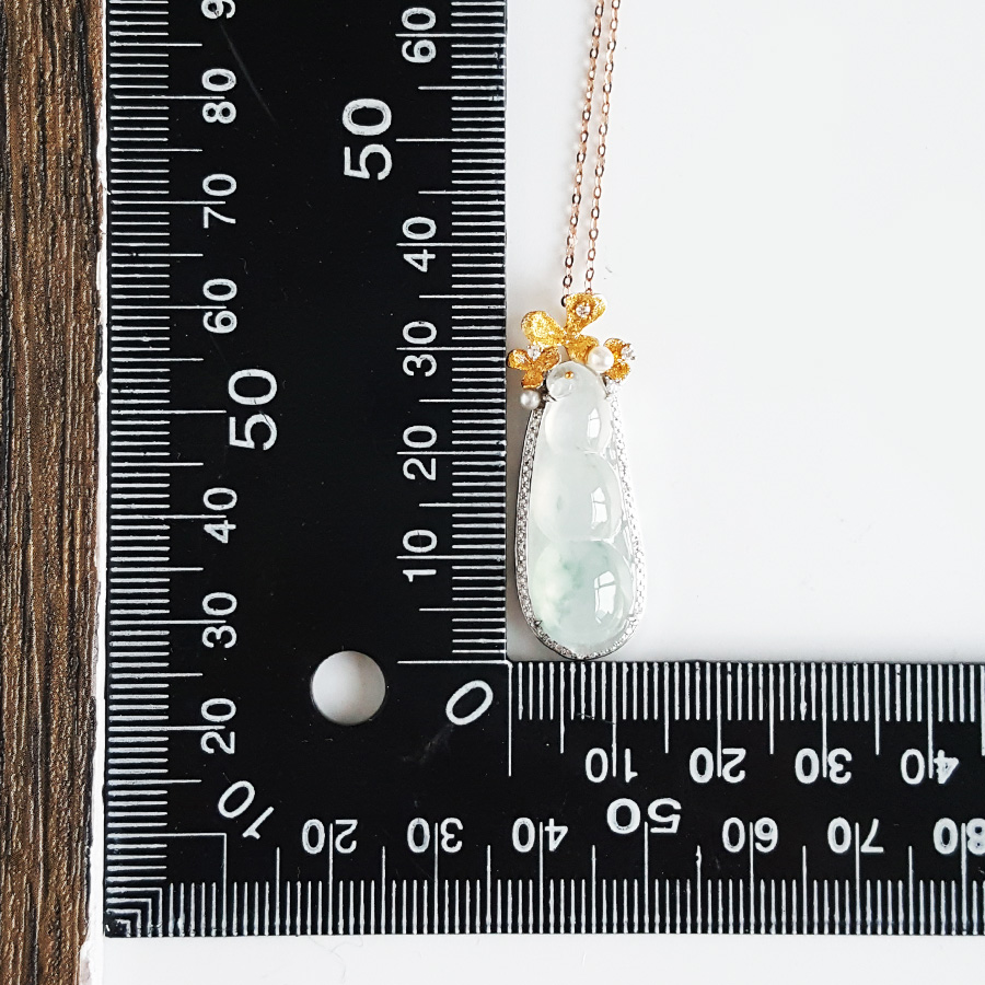 名称 | AU750双色金镶钻镶天然细腻飘蓝花冰种福豆翡翠配珍珠吊坠项链 |