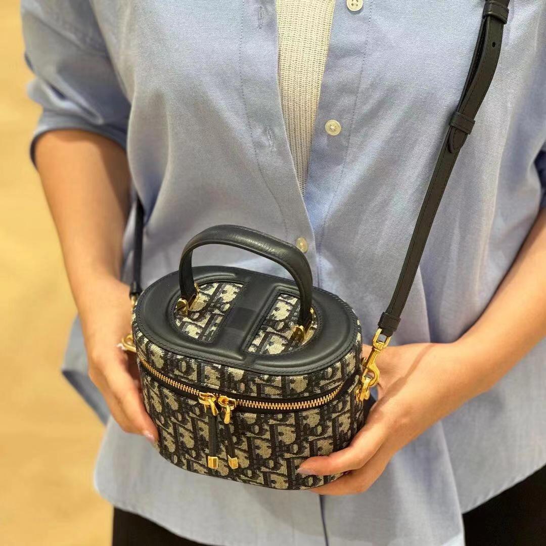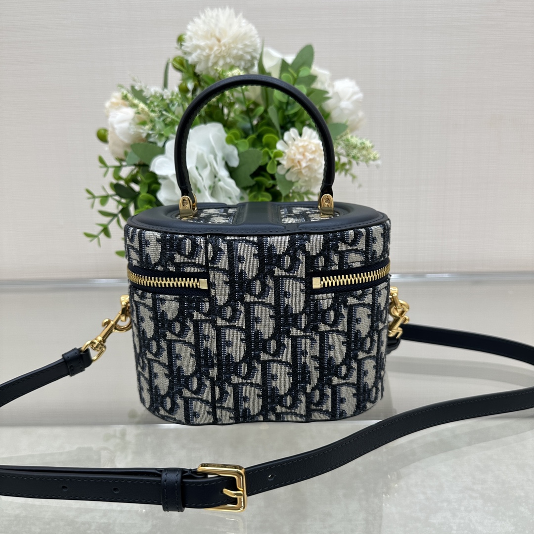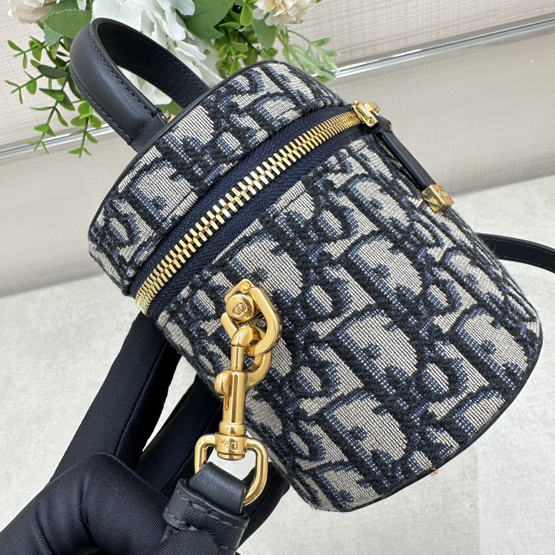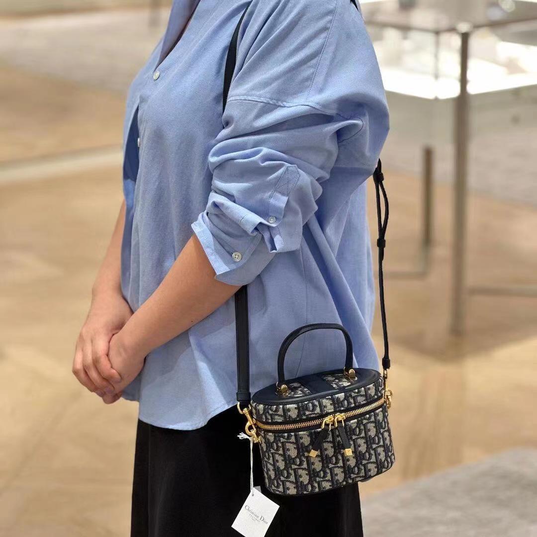 这款 C-D Signature Vanity 手袋是二零二三秋季成衣系列新品, 实用高雅,丰富了旅行经典系列。采用蓝色 Oblique 印花面料精心制作,顶部和底部饰以 C-D 压花标志,彰显 D-ior 的精湛工艺。内部优雅宽敞,双向拉链开合更显精致。小号款式,搭配硬质皮革顶部手柄和可调节、可拆卸的肩带,可手提、肩背或斜挎,是日常的理想良伴。