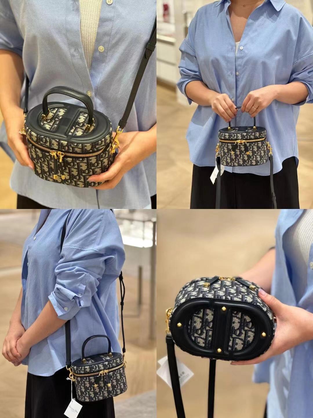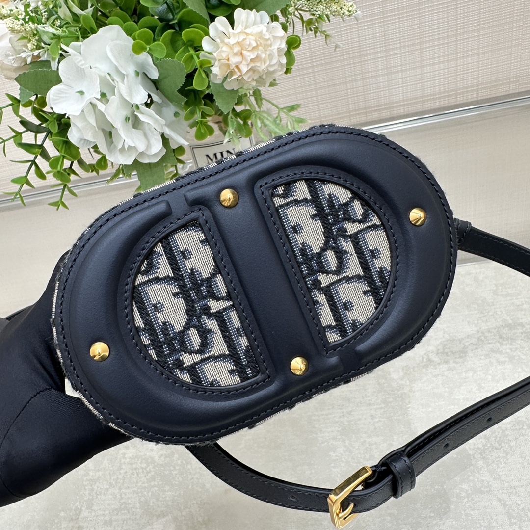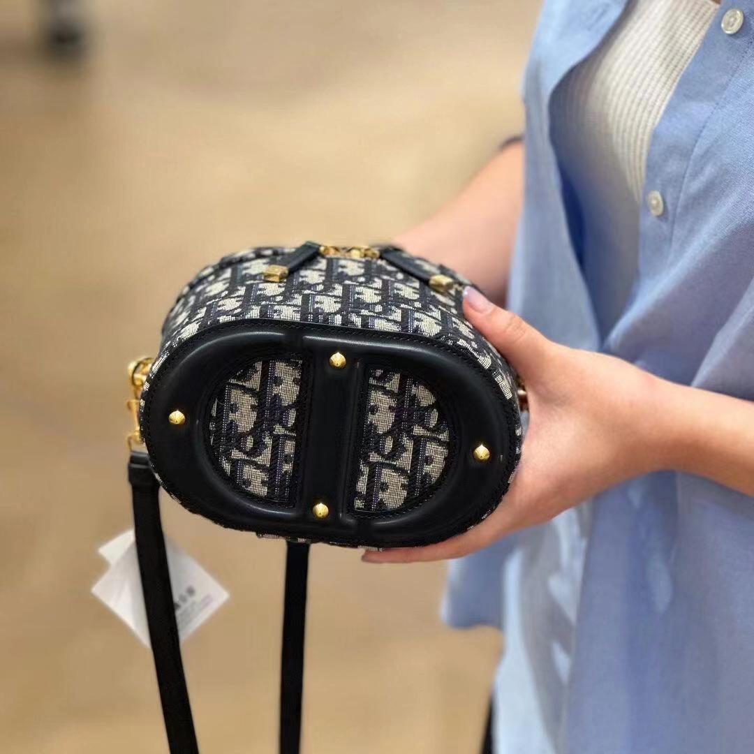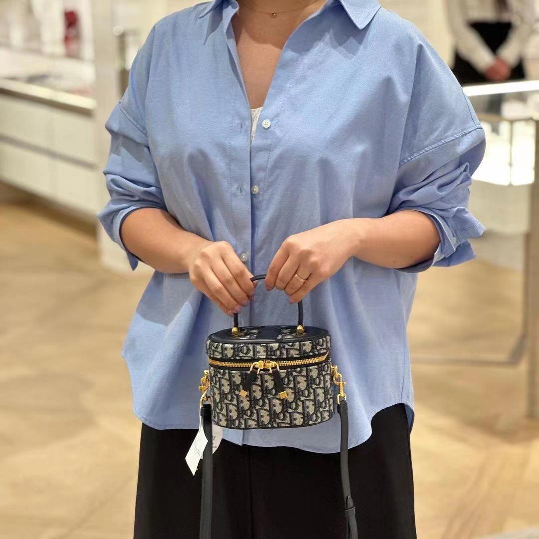 这款 C-D Signature Vanity 手袋是二零二三秋季成衣系列新品, 实用高雅,丰富了旅行经典系列。采用蓝色 Oblique 印花面料精心制作,顶部和底部饰以 C-D 压花标志,彰显 D-ior 的精湛工艺。内部优雅宽敞,双向拉链开合更显精致。小号款式,搭配硬质皮革顶部手柄和可调节、可拆卸的肩带,可手提、肩背或斜挎,是日常的理想良伴。