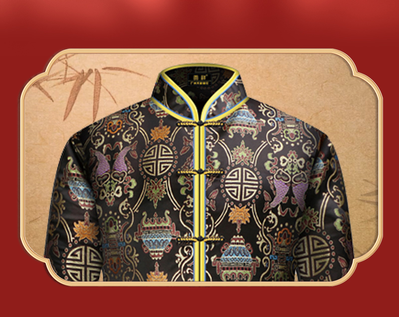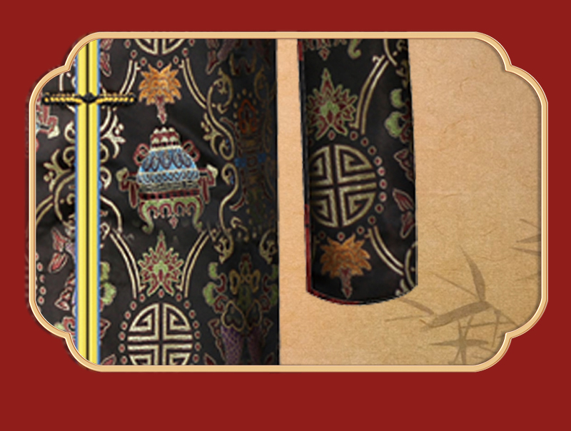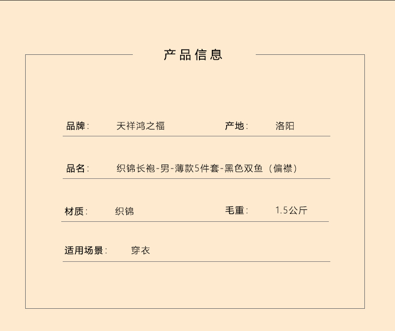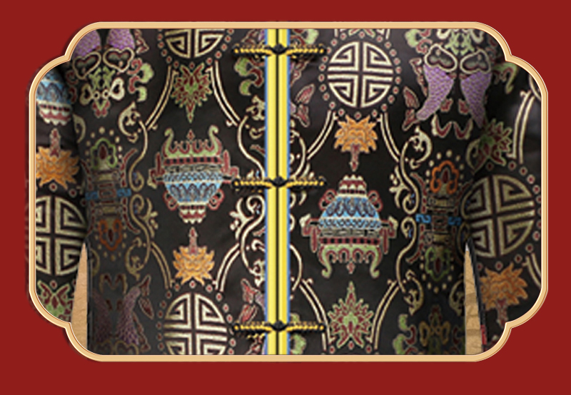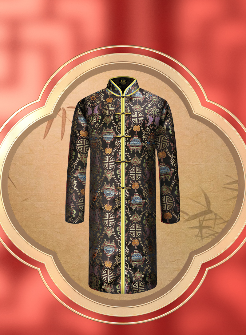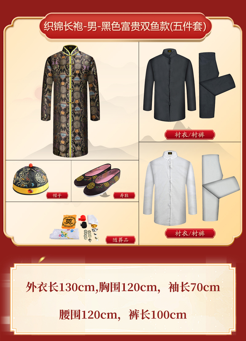 男士织锦长袍黑色双鱼(偏襟)薄款5件套寿衣寿服套装