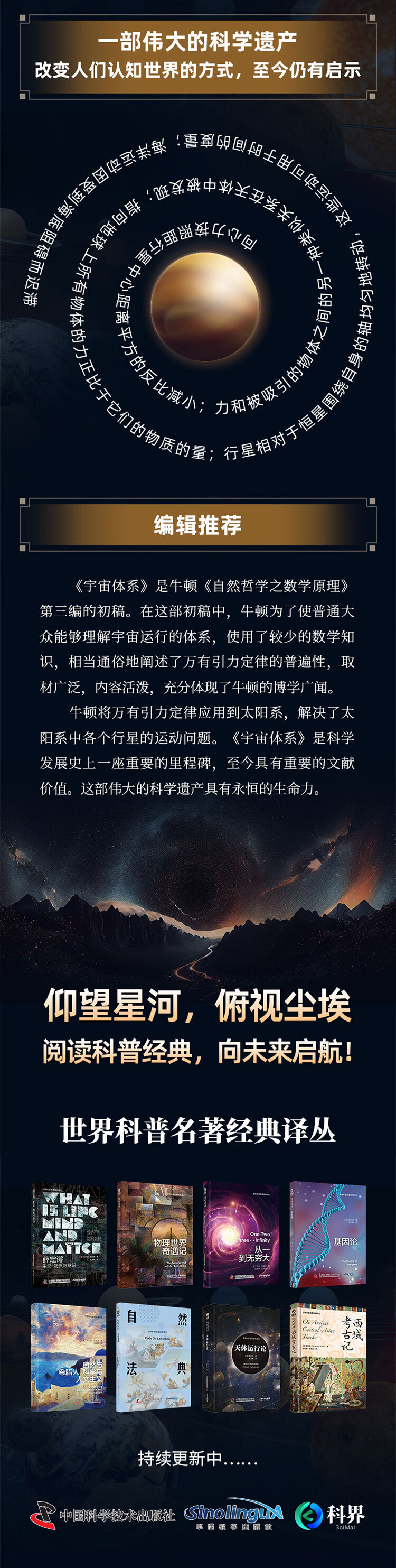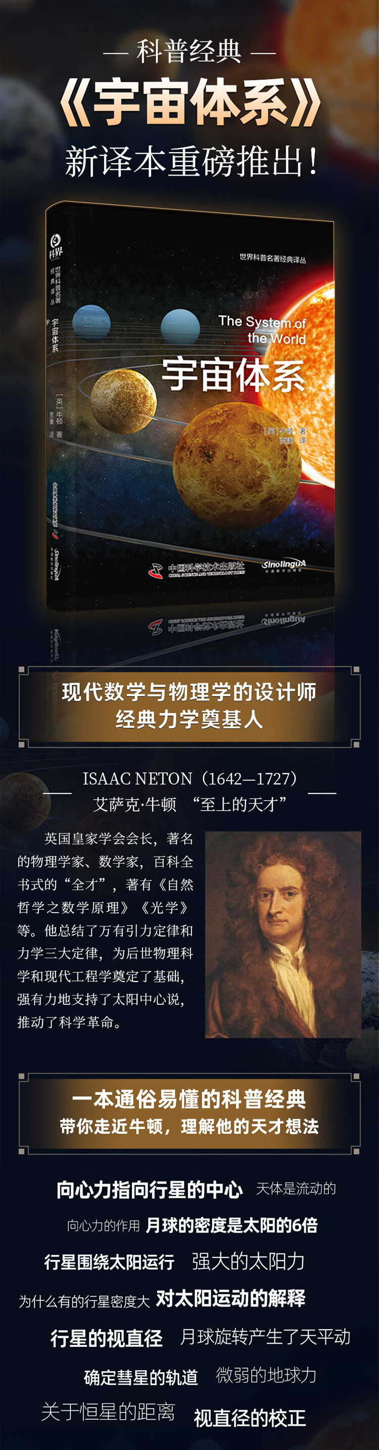 19世纪下半叶,英国伟大的科学家牛顿,在当时生产实践和实验的基础上,集前人力学知识之大成,奠定了古典力学的基本体系,把力学这一门古老的学科,推到了一个新的高度。牛顿将万有引力定律应用到太阳系,将宇宙间天体运行的动因归之于“推动力”,就解决了太阳系中各个行星的运动问题。虽然后来的科学的实践证明,牛顿力学并不是科学上的“终极理论”,但丝毫不可否认,它是科学发展过程中的一座重要的里程碑。至今具有重要的文献价值。这部伟大的著作,在世界各国用不同的语言出版过无数的版本。具有永恒的生命力。