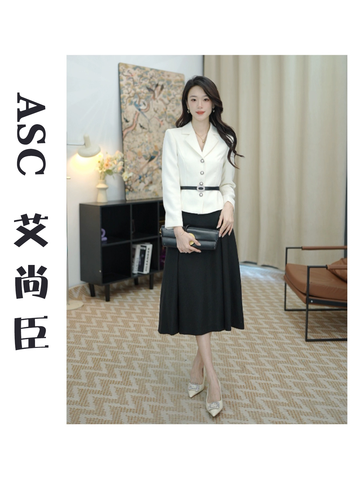 艾尚臣西装两件套白色设计感上衣黑色半身裙套装