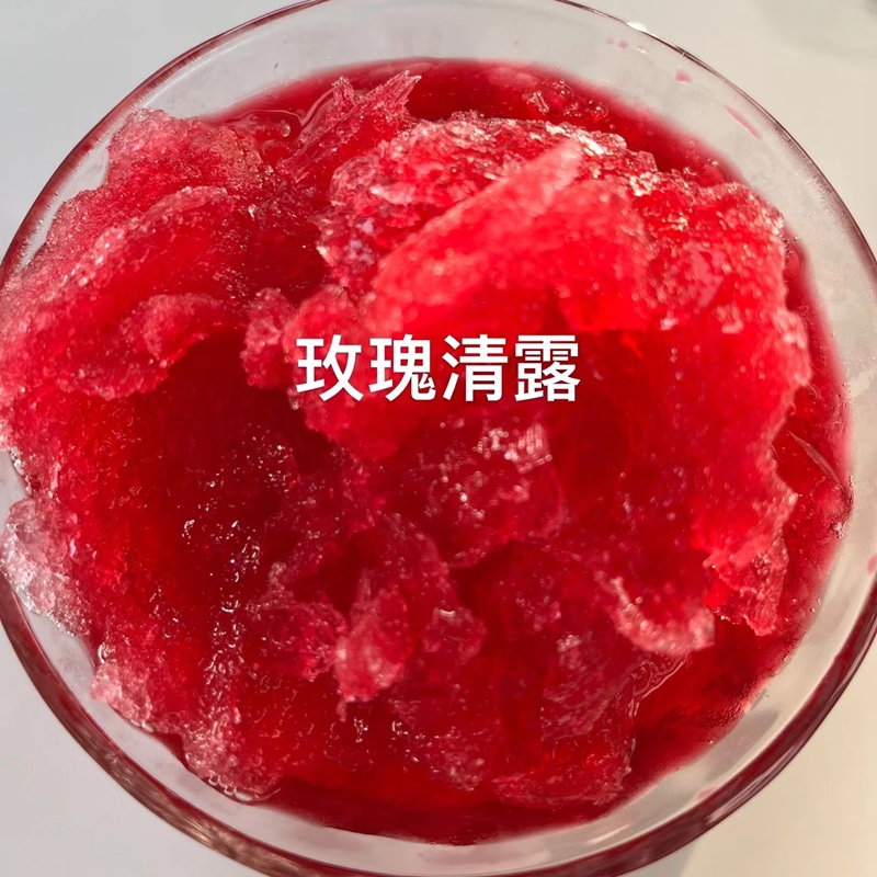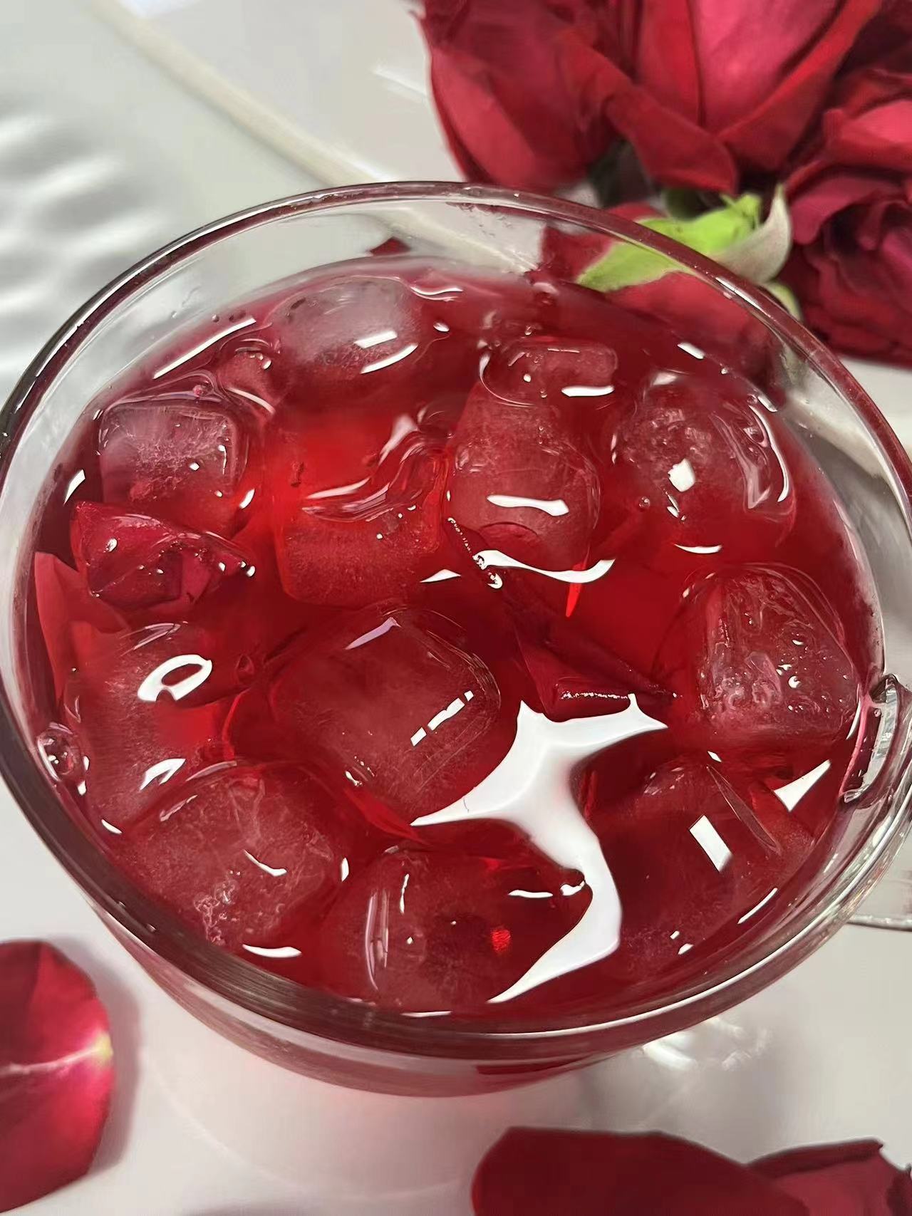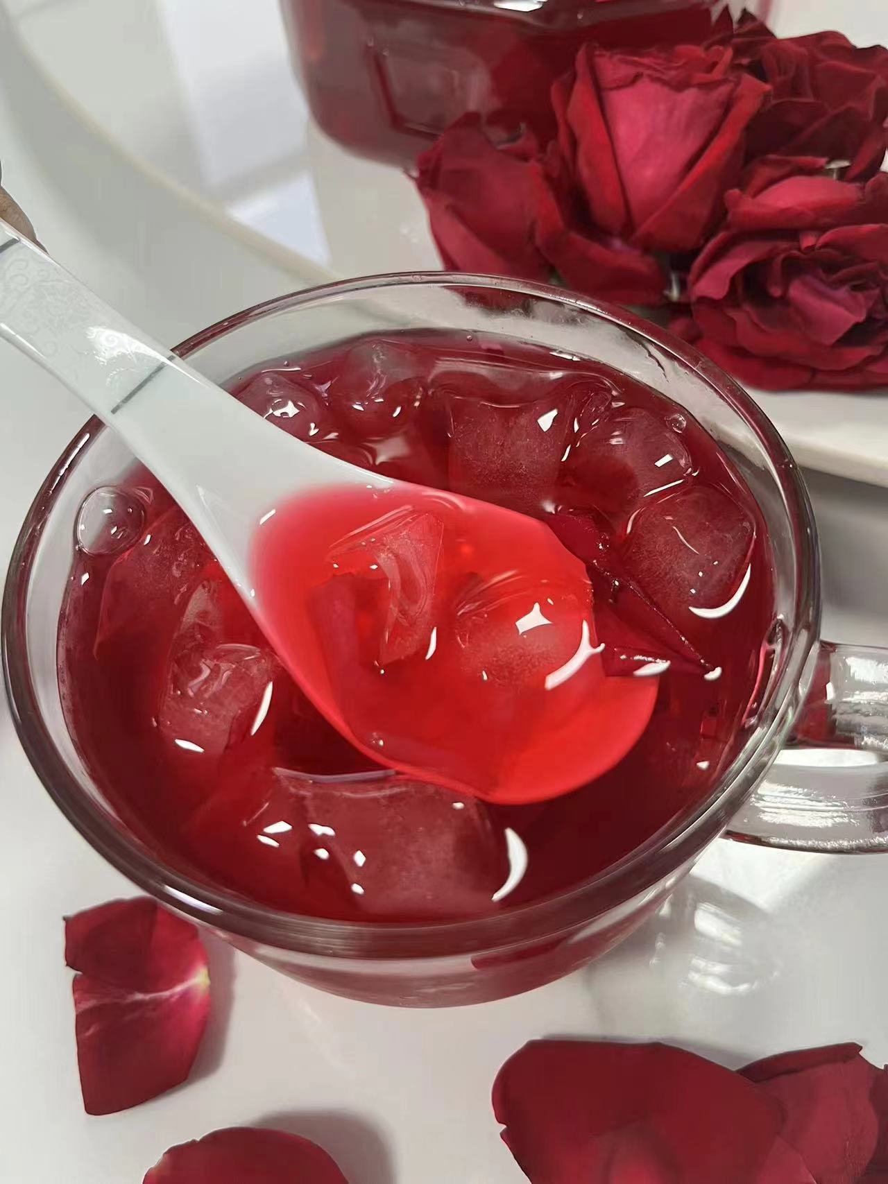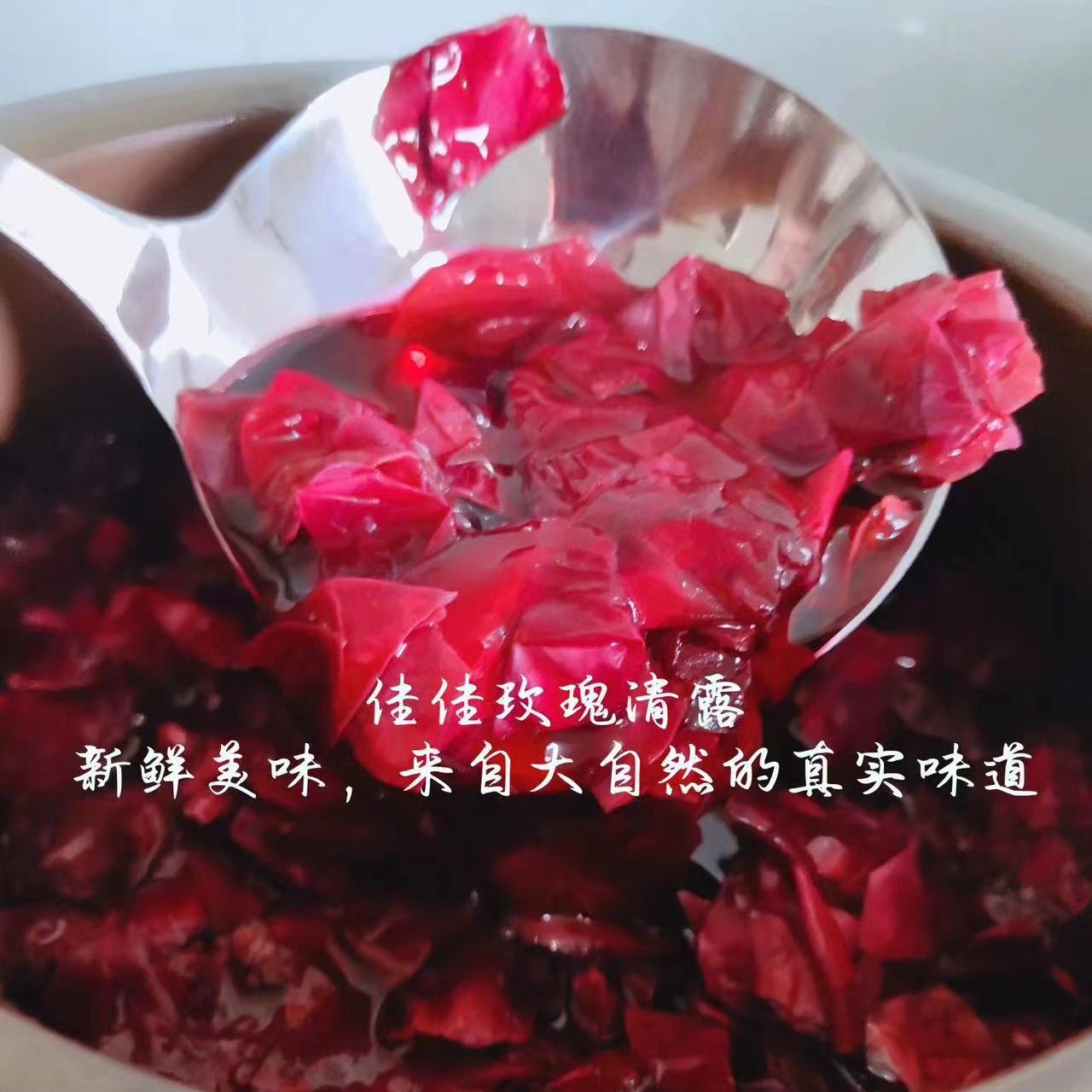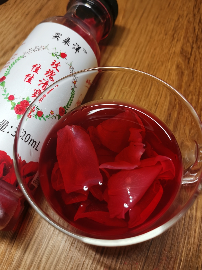 配料是简单的玫瑰鲜花、水、荞麦醋、老冰糖:荞麦醋提供了酸,冰糖提供了甜,玫瑰提供了香和那惊艳的颜色,最终成就了一杯醇香的玫瑰清露。