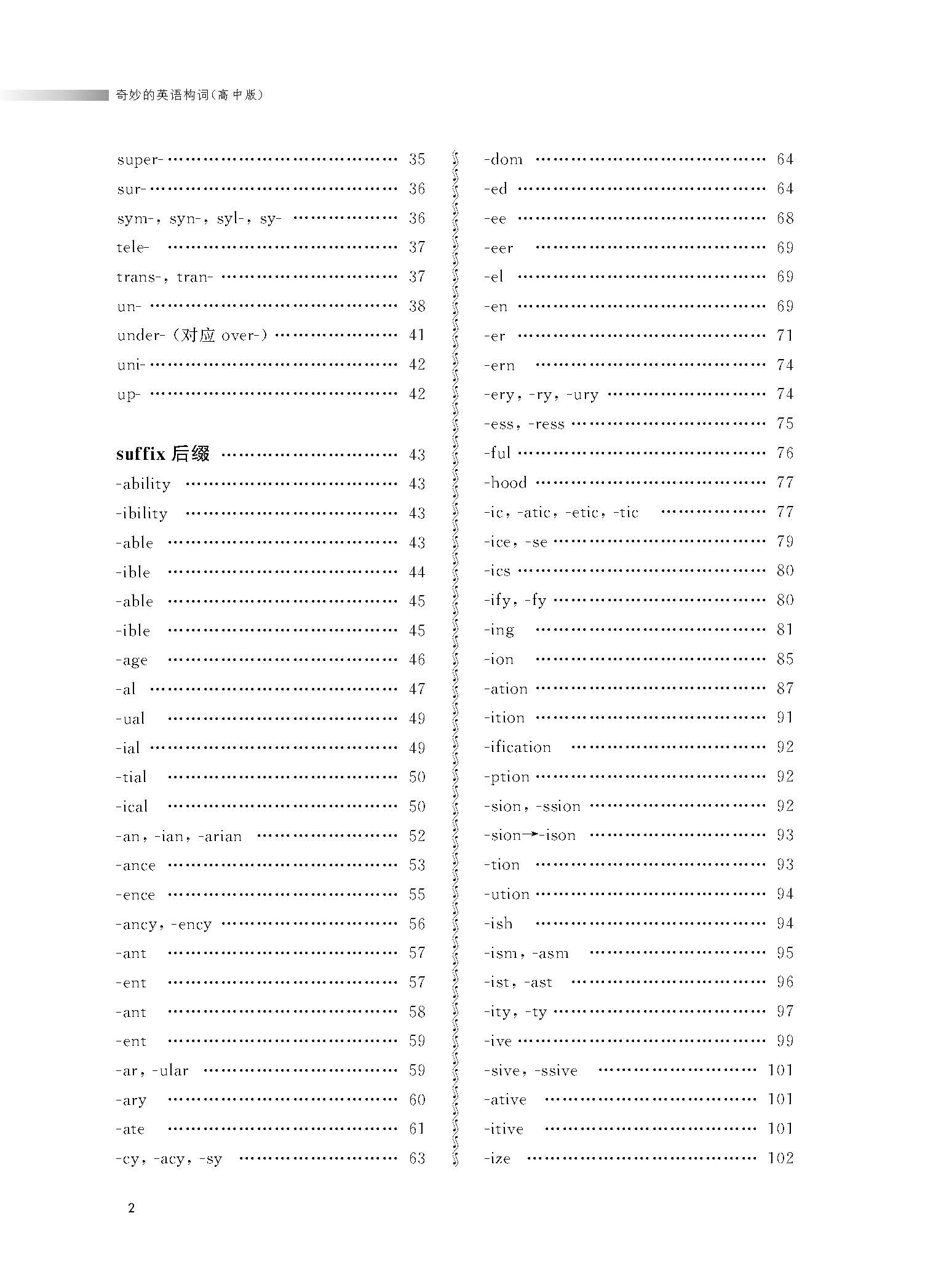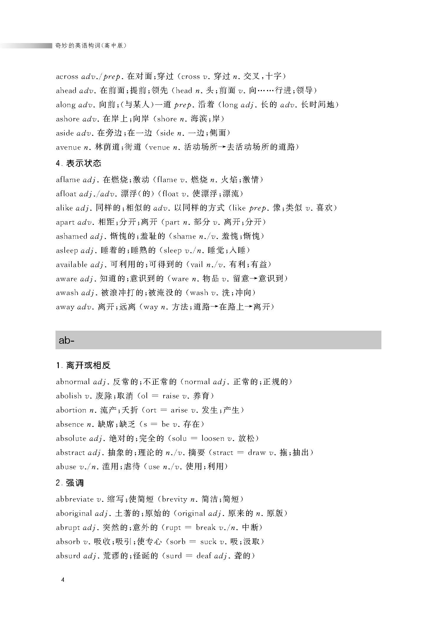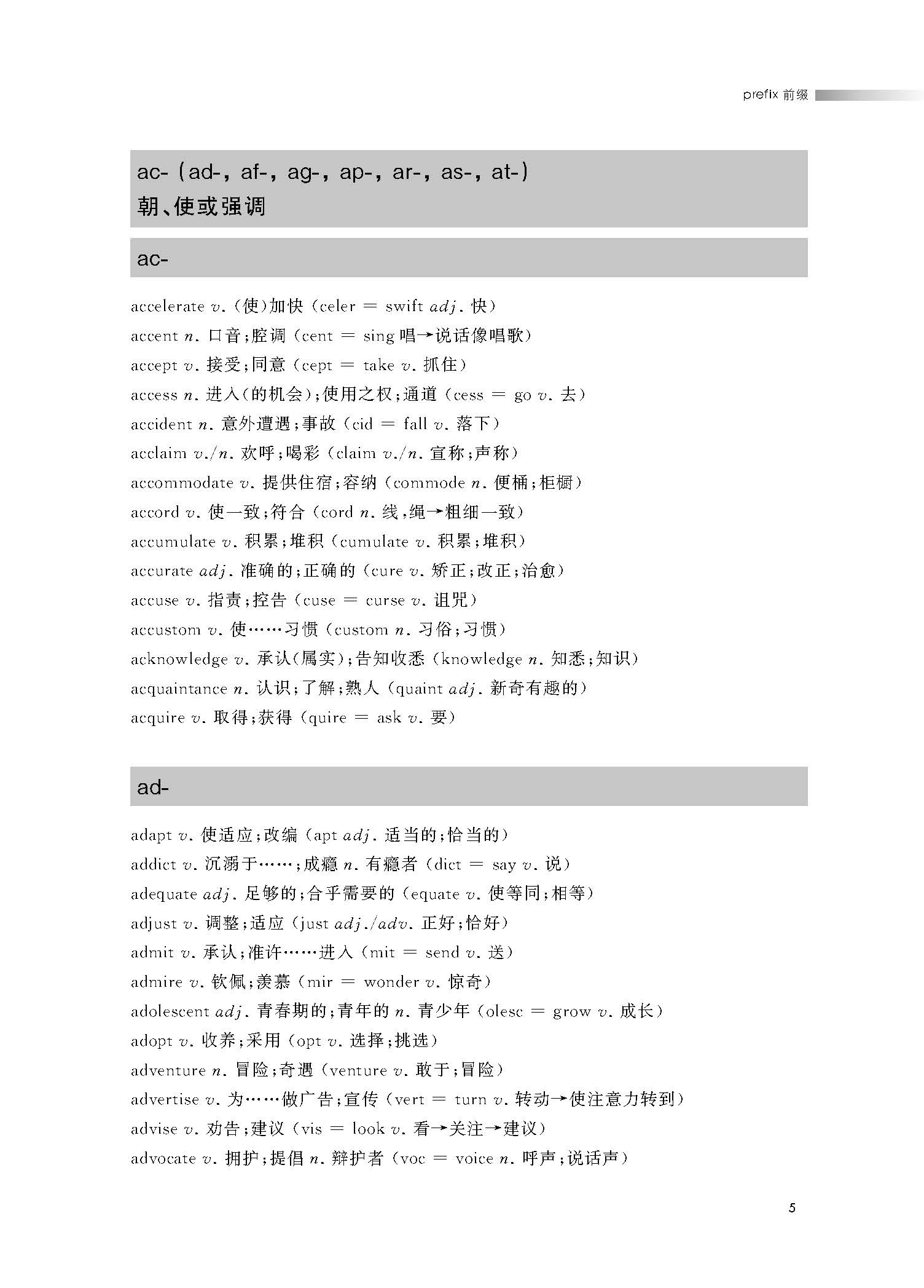 本书从构词法入手,揭示英语单词的内在构词规律。重在引导中学生遵循词根词缀的构词规律,以熟词引出新词的方法,快速、准确的记住单词。本书第一部分是词根。词根是单词的核心。一个词根可以引出与之相关的一串单词。了解一个词根就能记住一群单词。快速提高了词汇量。第二部分是词缀。(前缀和后缀)均为常用的词缀。配以中学英语中的高频词汇,加深学生的记忆,让学生不再为记不住单词而苦恼。前缀改变单词的意义,后缀改变词的语法作用。因此,掌握一定的数量的前缀和后缀,学生能准确运用单词。从而达到了从认识到运用的飞跃。