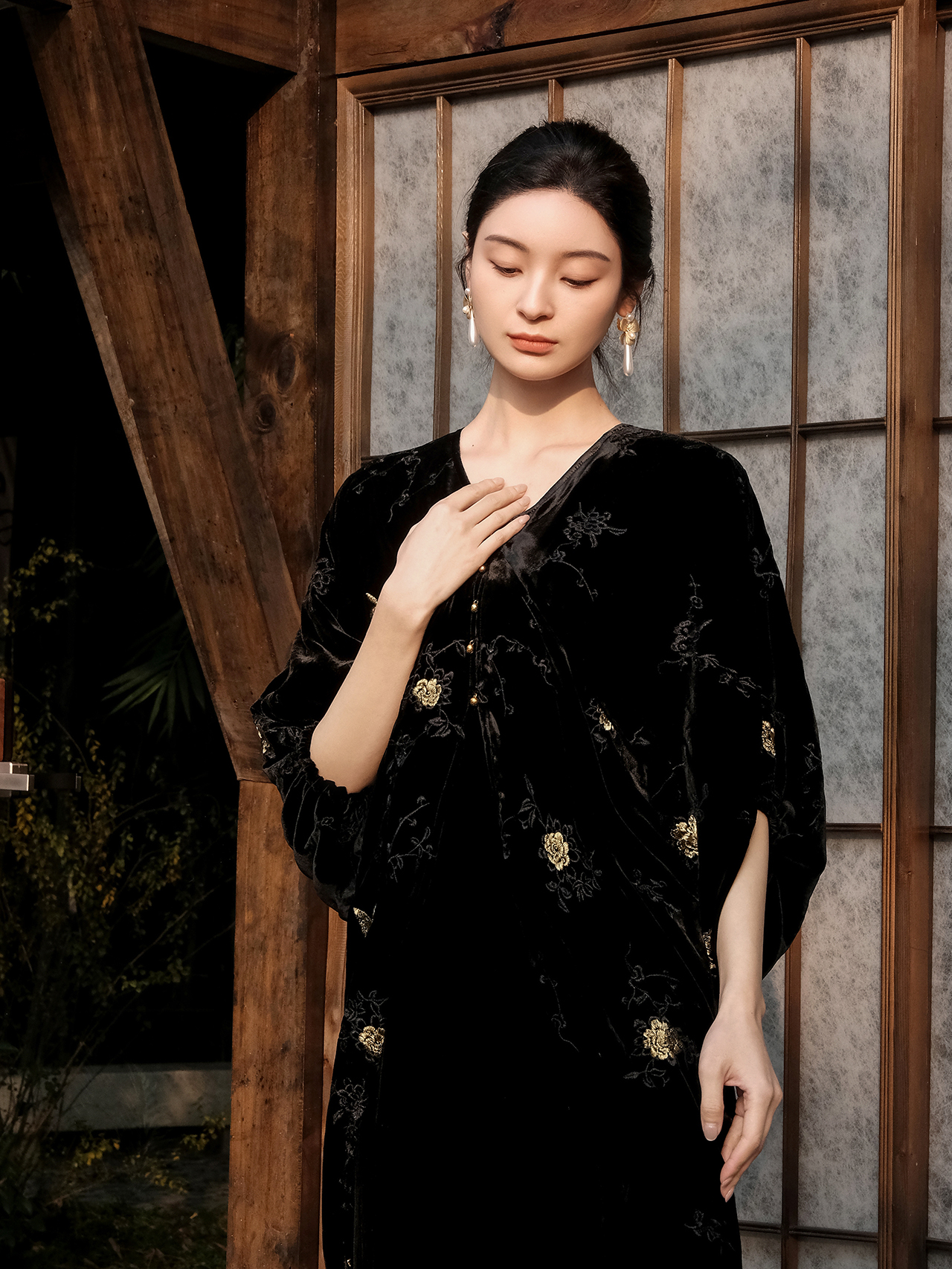 盛唐牡丹 | 黑金丝绒蝴蝶绣花长裙