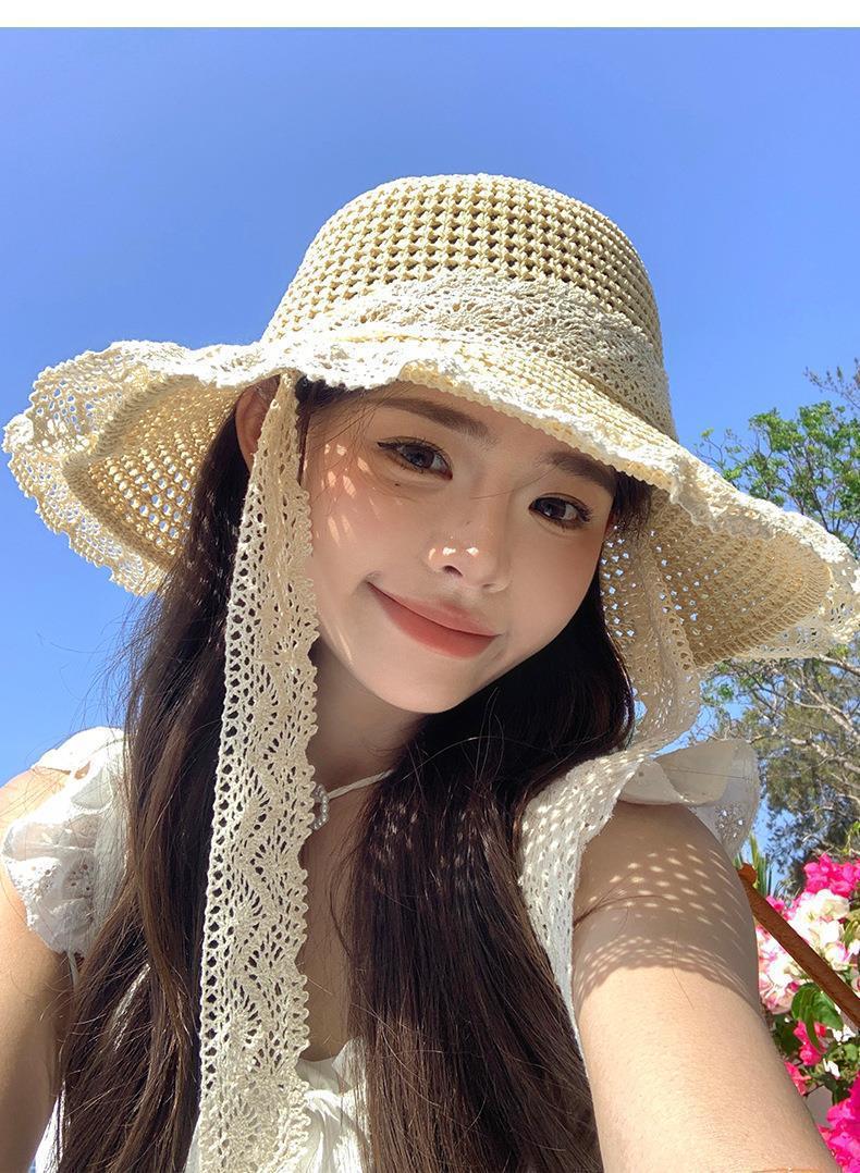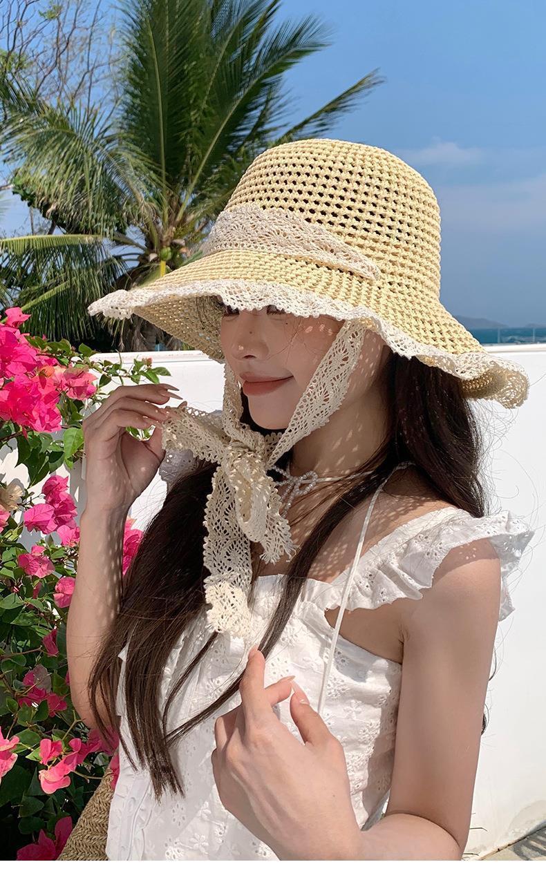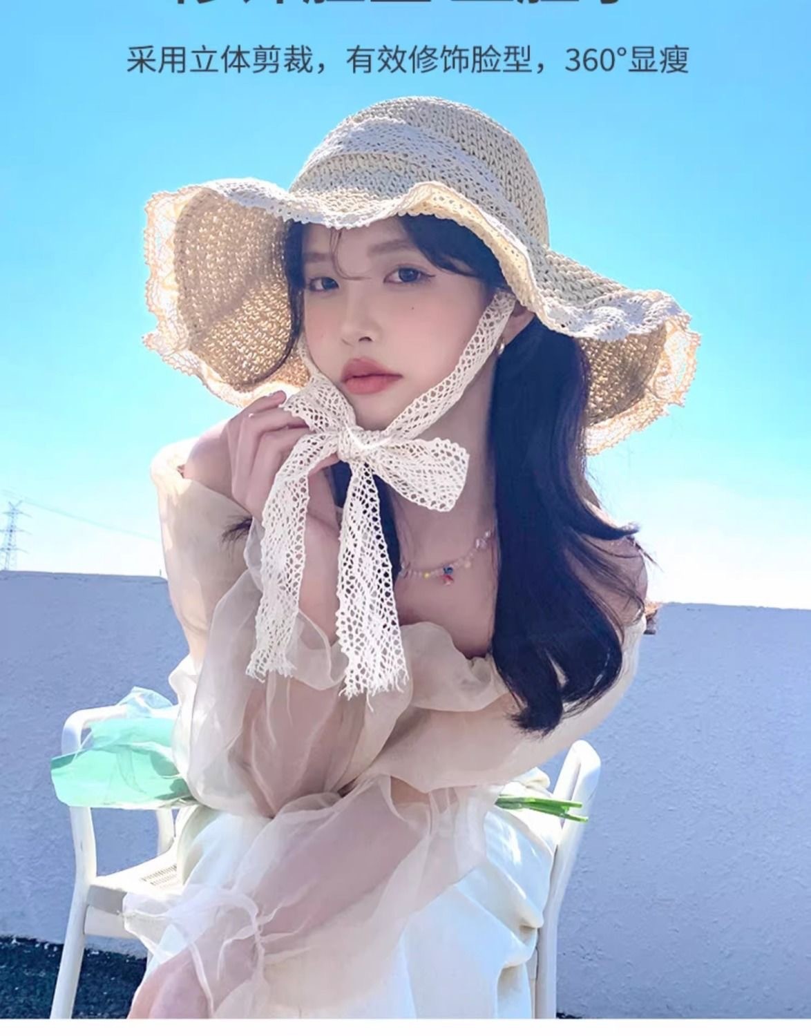 【夏日百搭款❗️温柔风草编帽】显脸小+遮阳两不误,打造温柔氛围感,轻盈透气不闷汗,海边蕾丝系带草编帽遮阳遮脸防晒帽草帽子沙滩帽女L