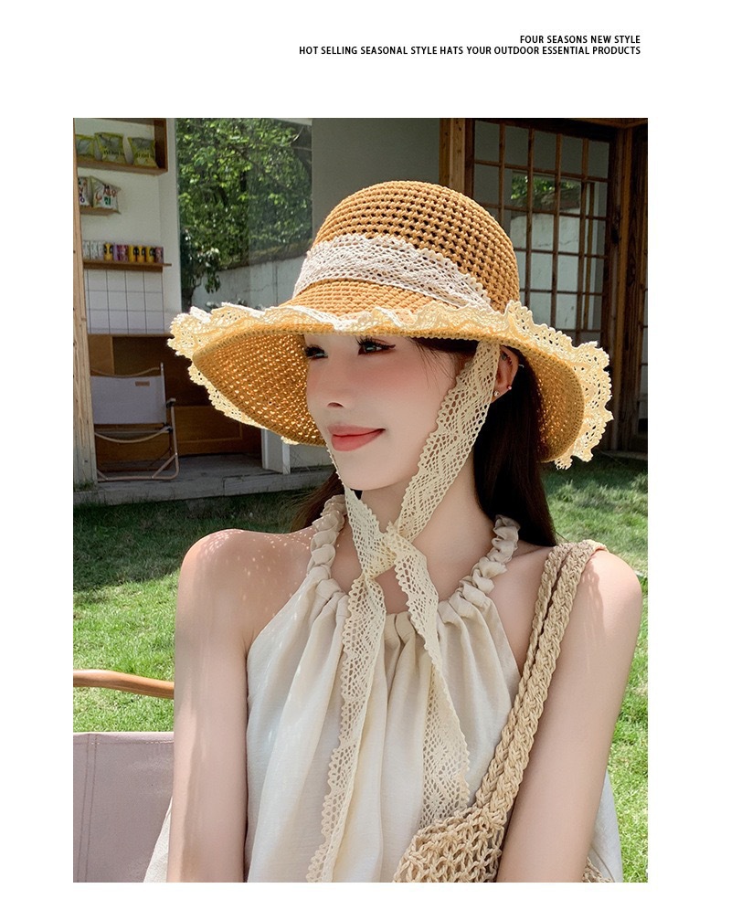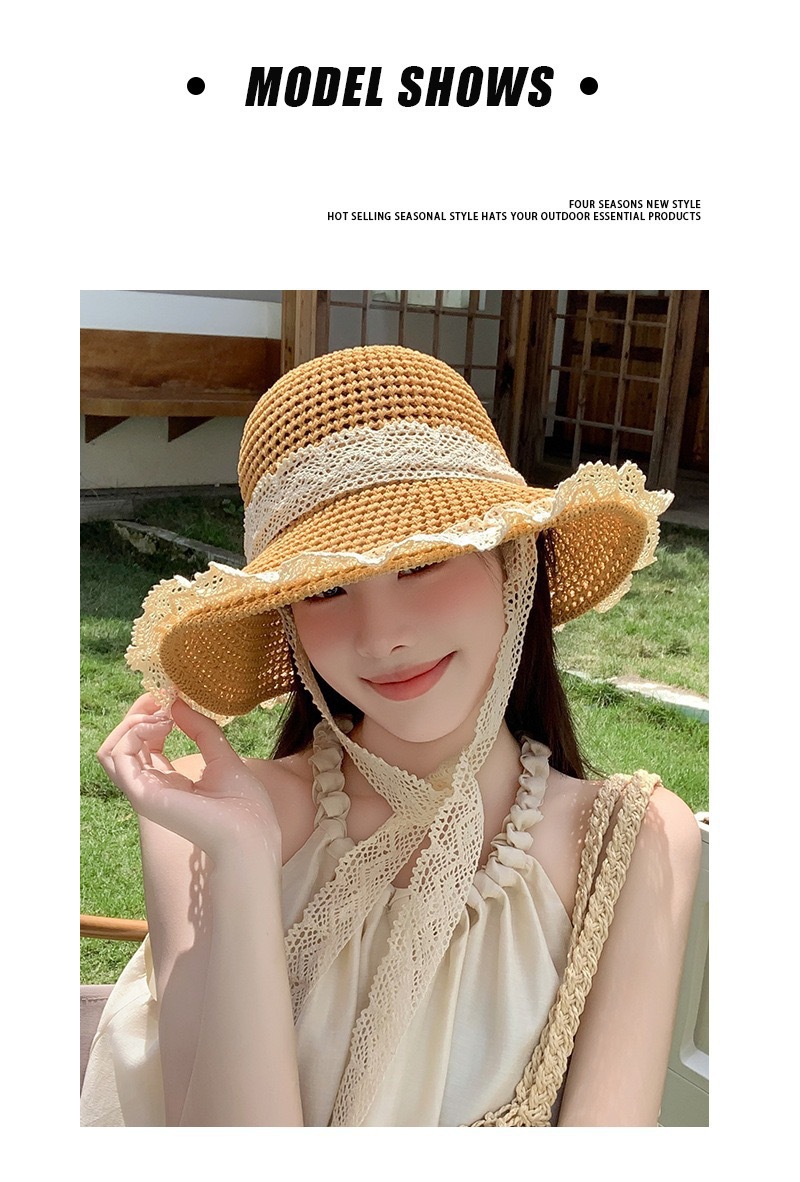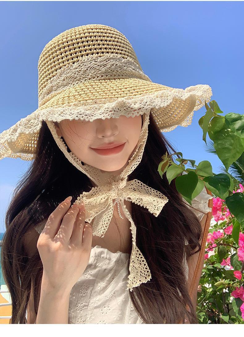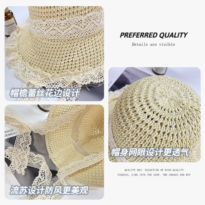 【夏日百搭款❗️温柔风草编帽】显脸小+遮阳两不误,打造温柔氛围感,轻盈透气不闷汗,海边蕾丝系带草编帽遮阳遮脸防晒帽草帽子沙滩帽女L