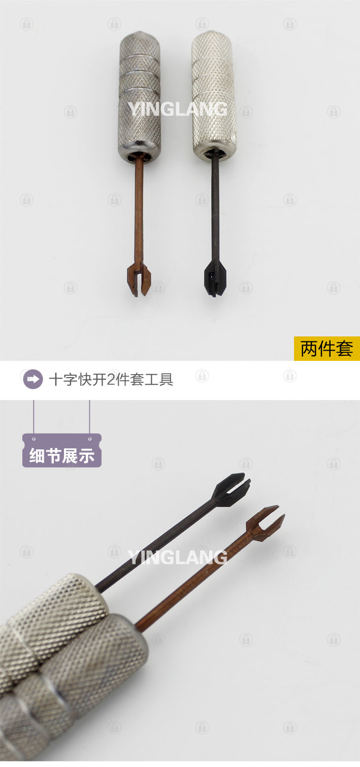 十字快开工具,原理非常的简单,就是在一般十字类的机械锁中,有后尾连杆的那种锁芯的话,十字类的锁芯,使用该工具直接插入锁芯最里部用榔头用力敲击,意思就是将锁芯那个固定连杆的卡簧敲落后,利用工具头部的那个缺口直接套钩到连杆上转动,以达到开启锁具的工作!一套有2件组成,头分大小两种!