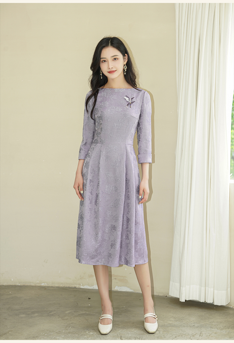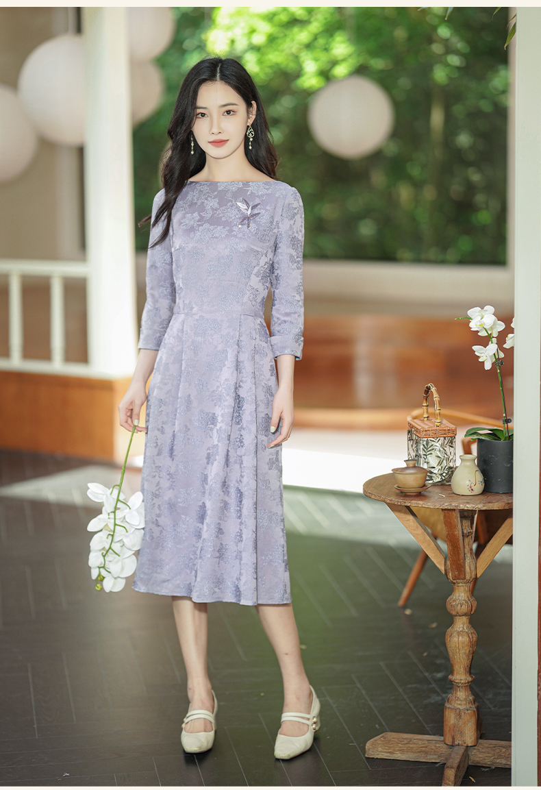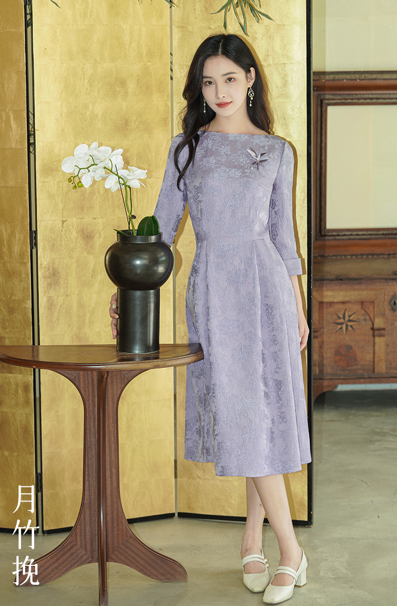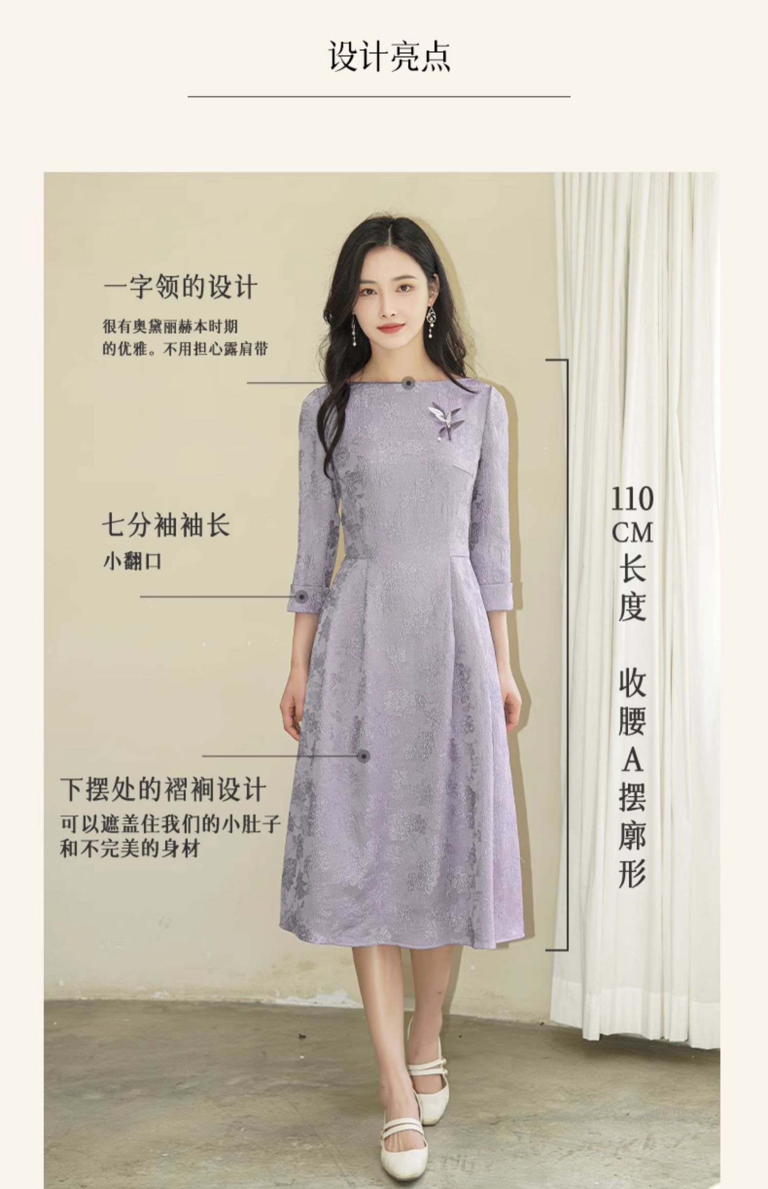 上海逸红颜月竹挽2025春秋新款提花连衣裙女一字领七分袖连衣裙