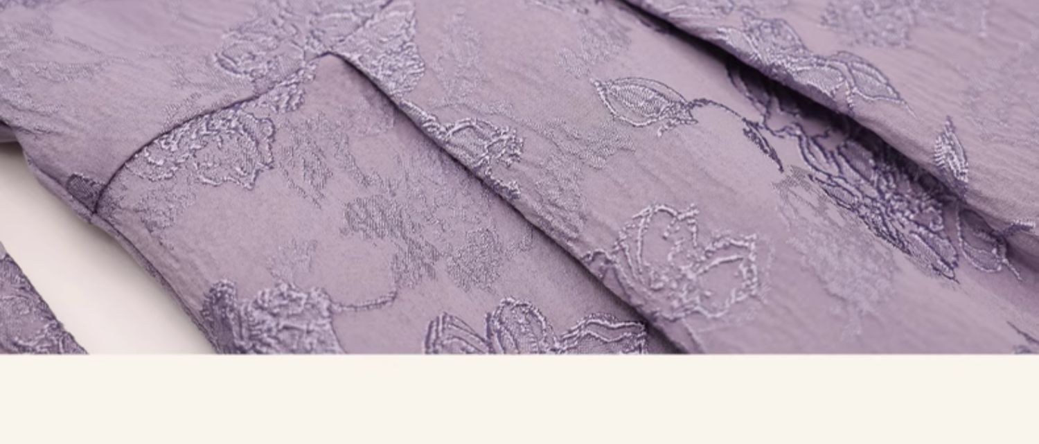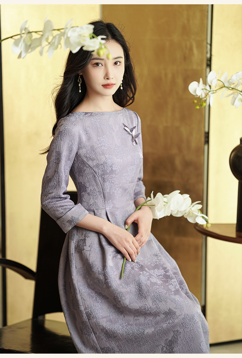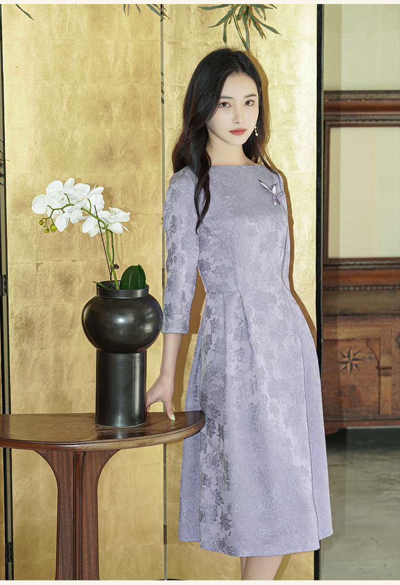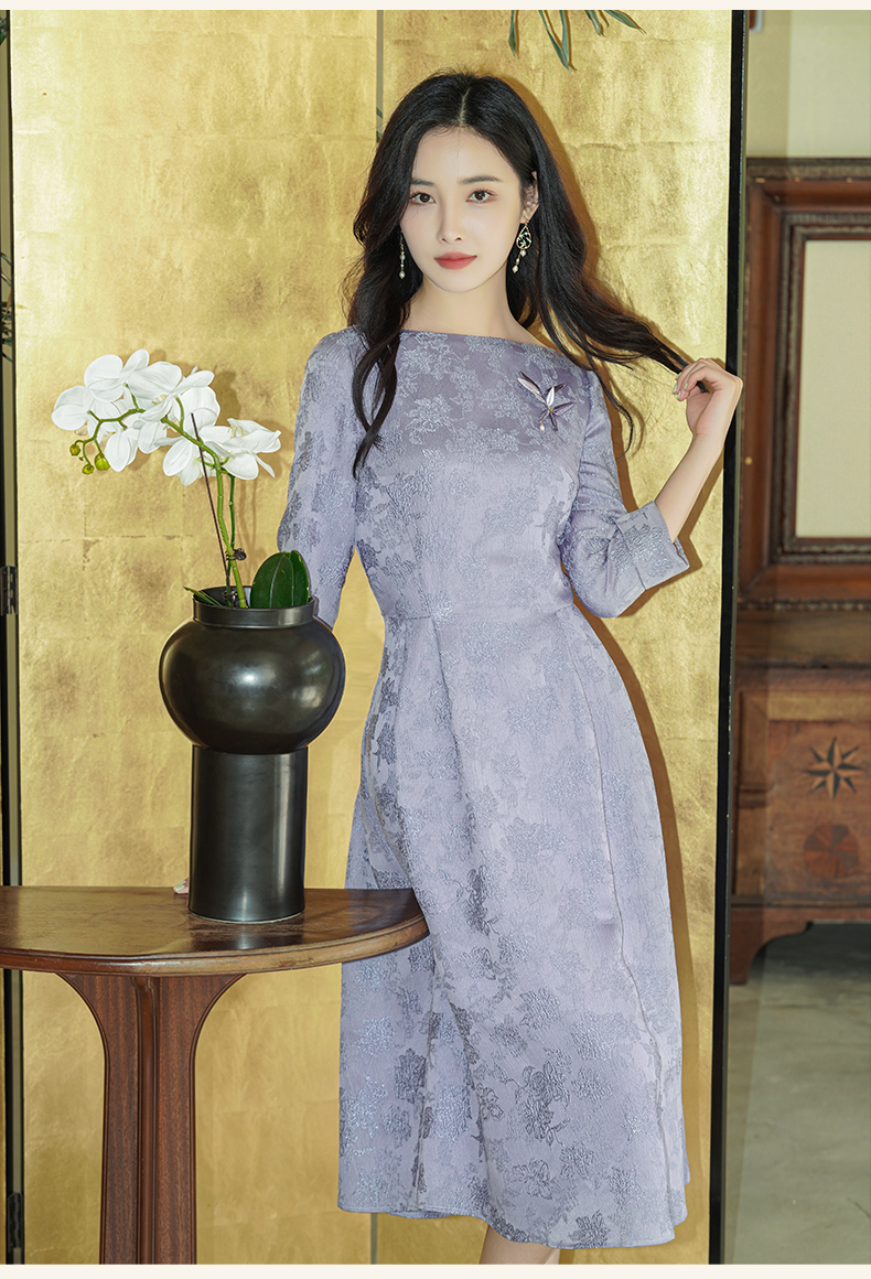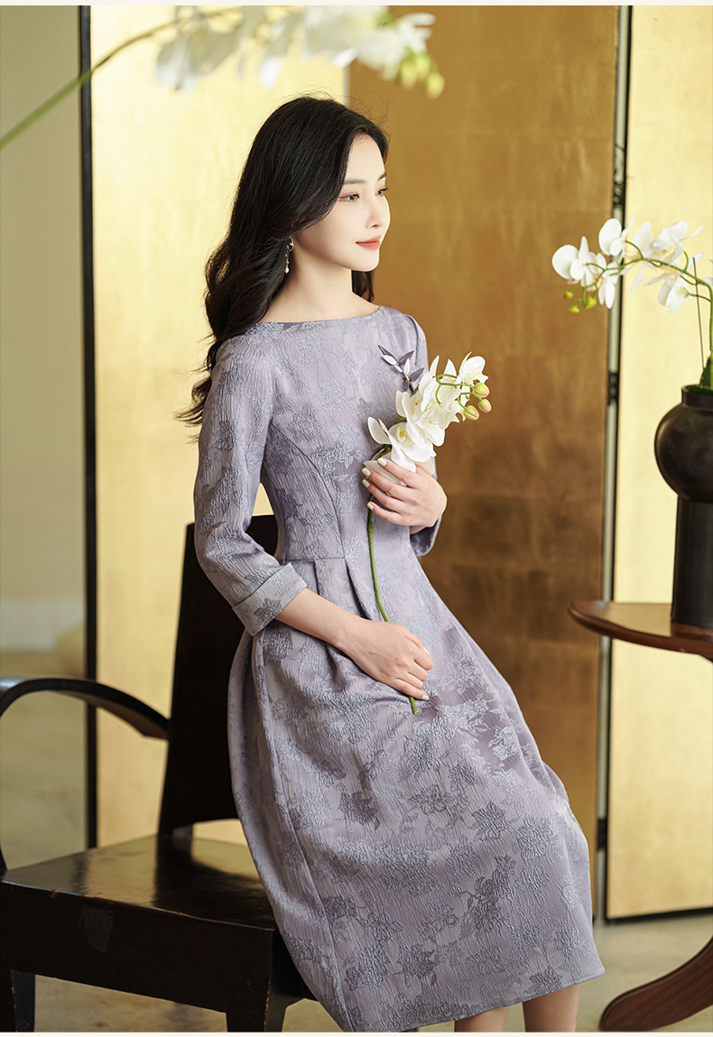 上海逸红颜月竹挽2025春秋新款提花连衣裙女一字领七分袖连衣裙