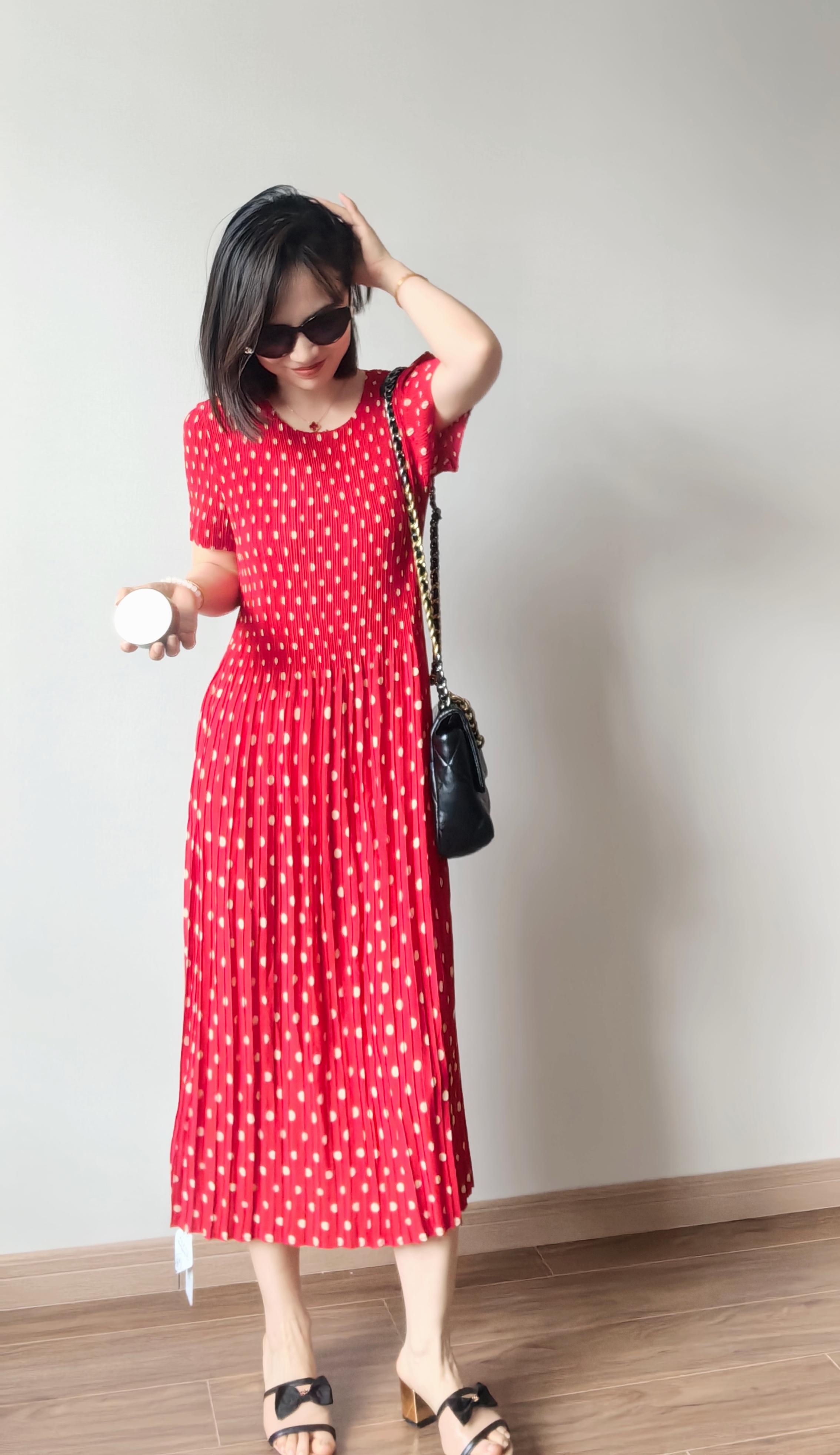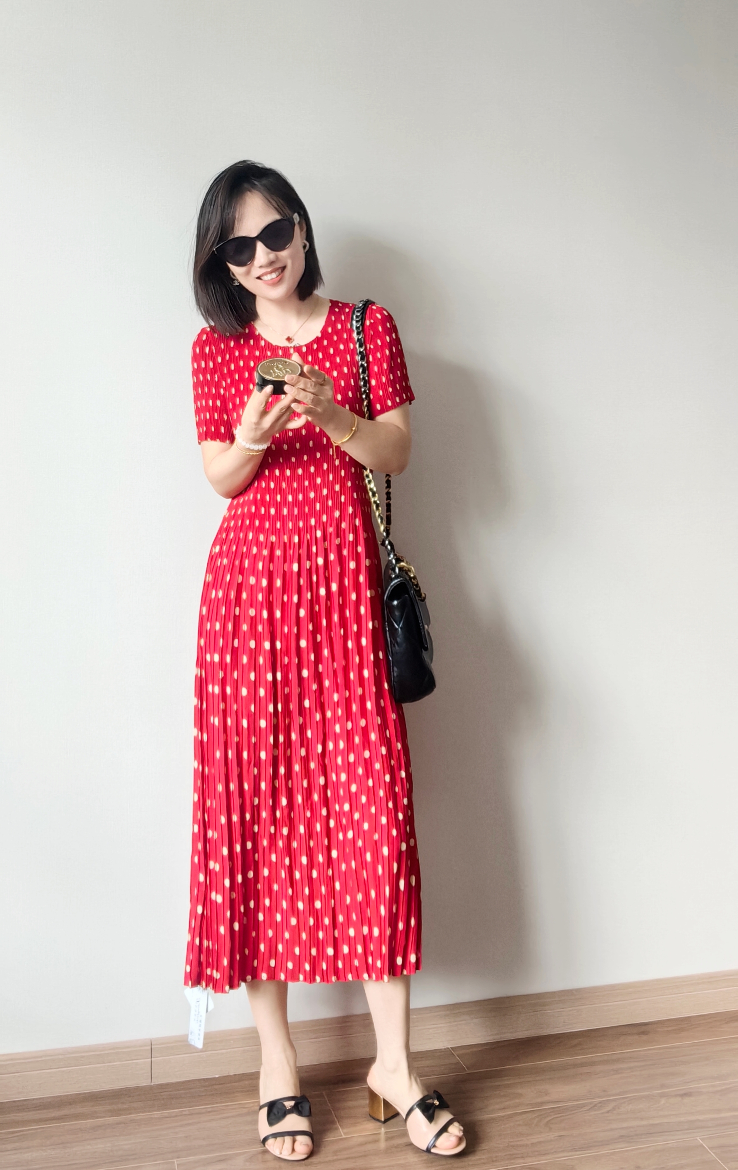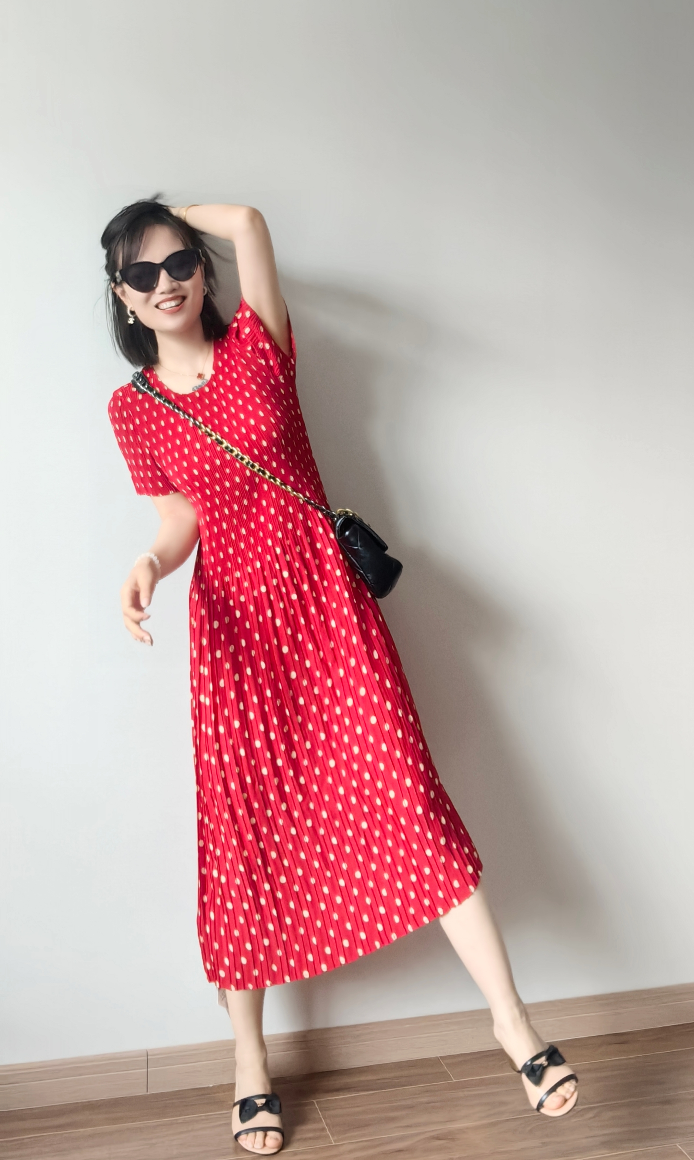弹力超级大,上身即瘦~被这波点吸引了,波点+百褶摇曳更活力,正红的很现显肤色白皙。