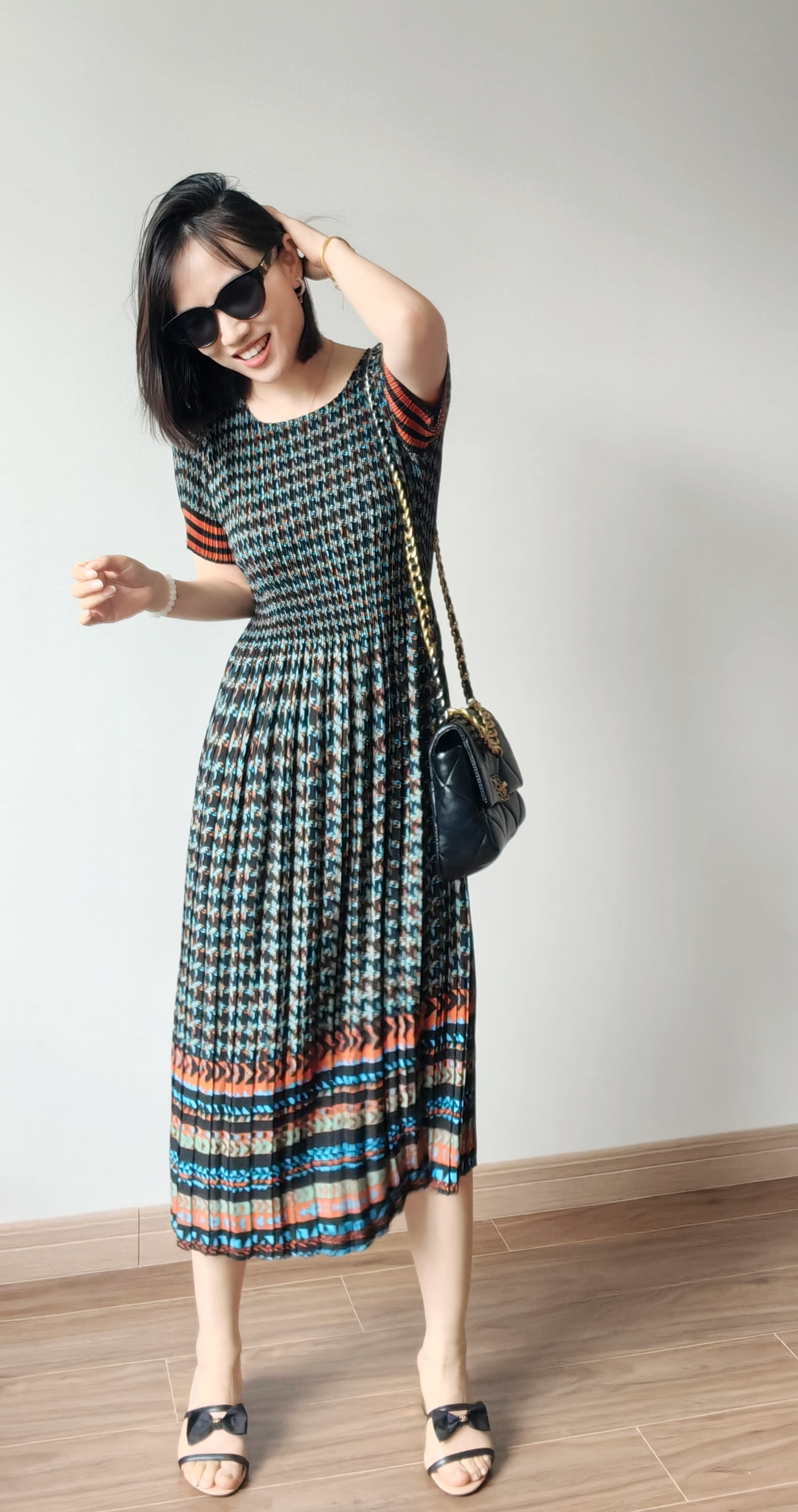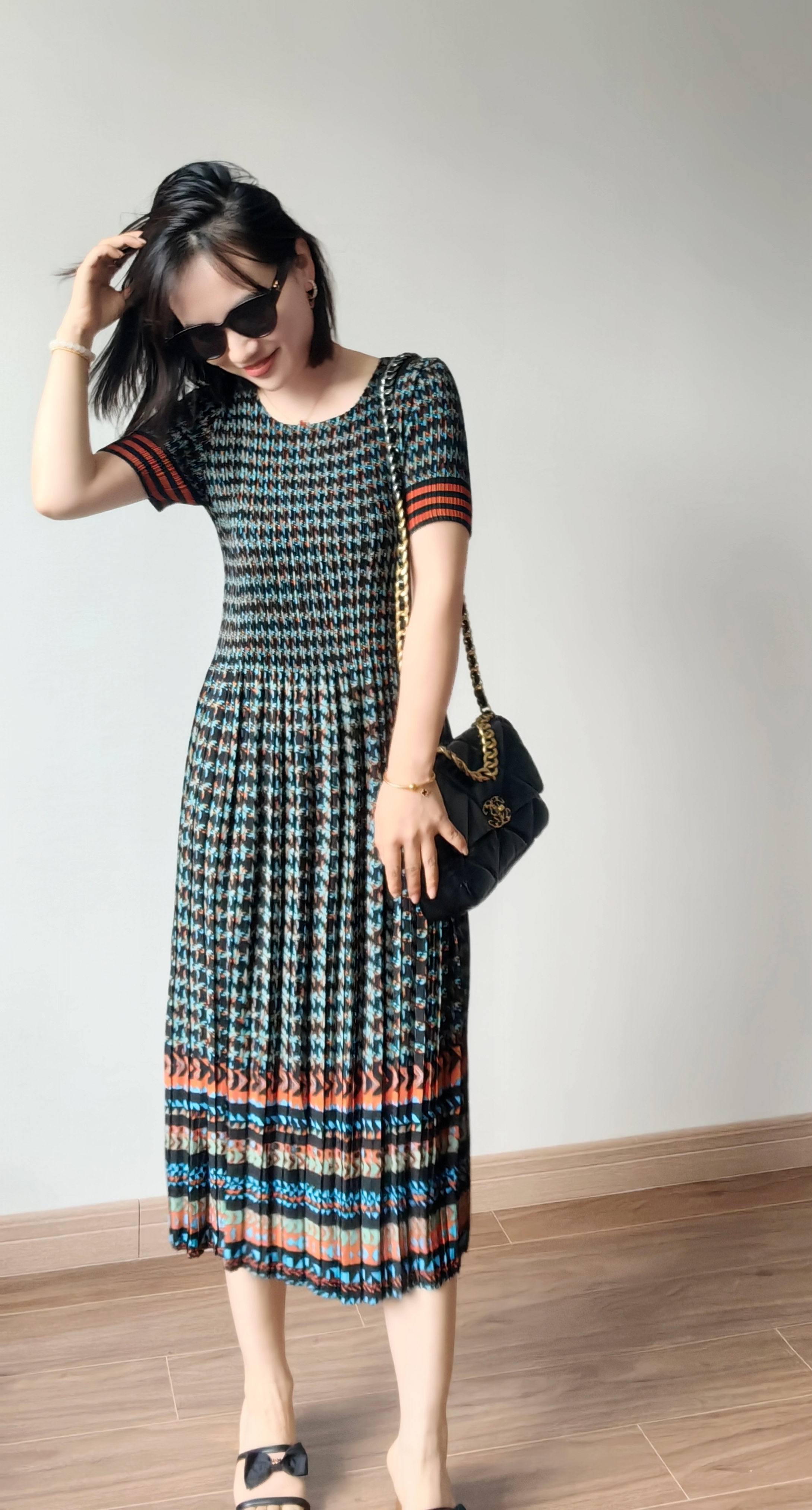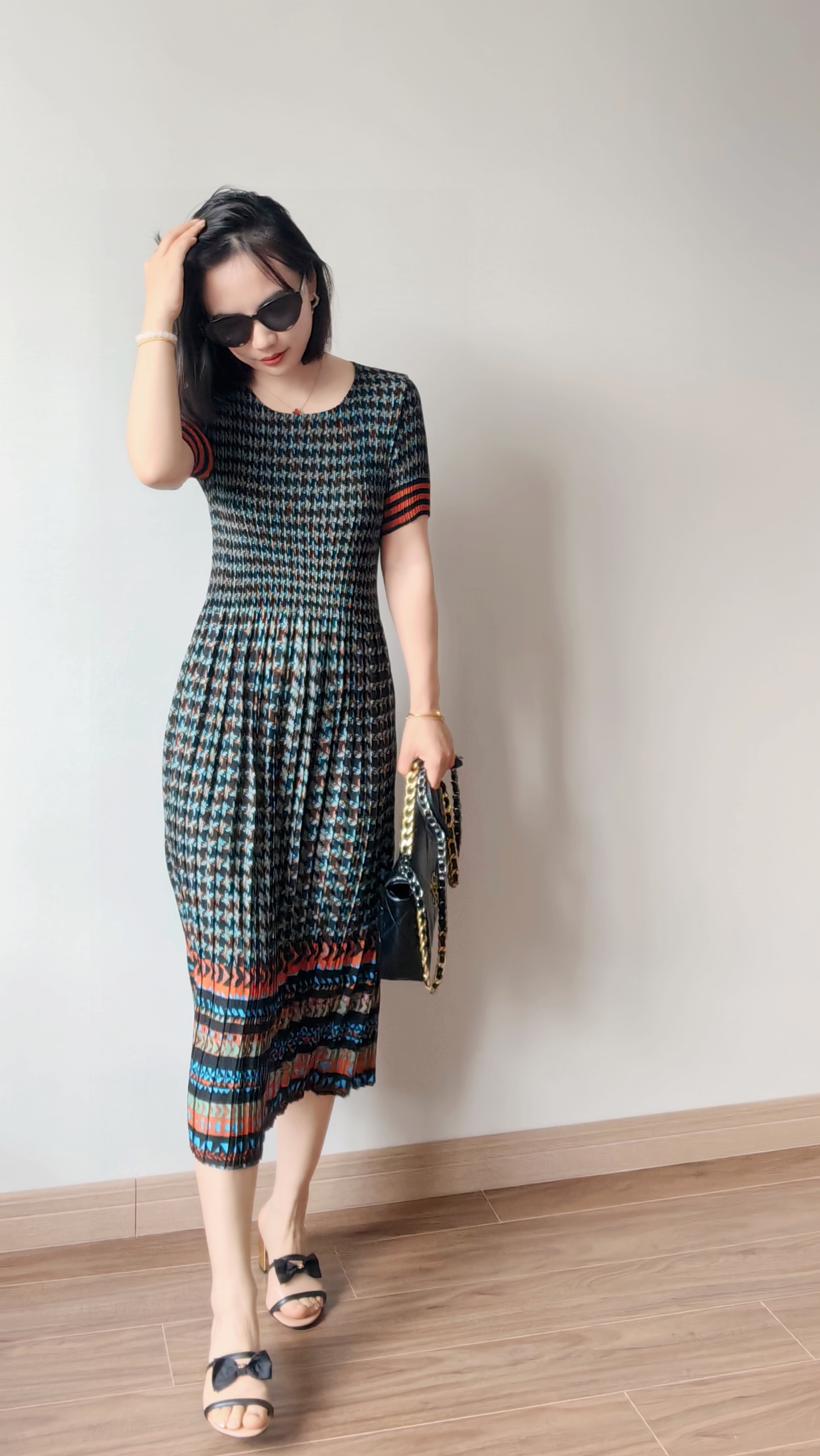 弹力超级大,上身即瘦~被这波点吸引了,波点+百褶摇曳更活力,正红的很现显肤色白皙。
