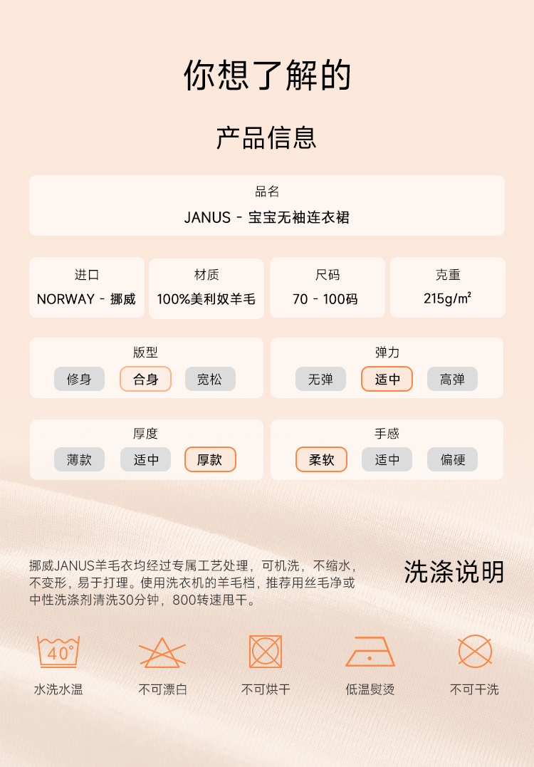 2件64折【反季特价】挪威进口JANUS100%美利奴羊毛宝宝连衣裙 克重215g/㎡