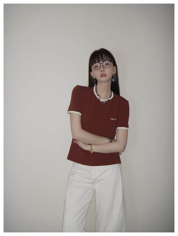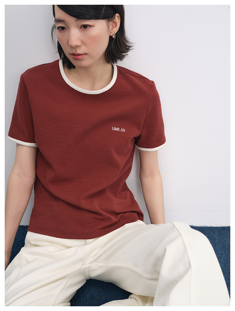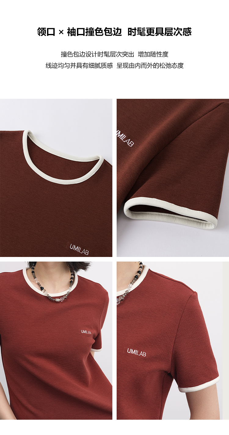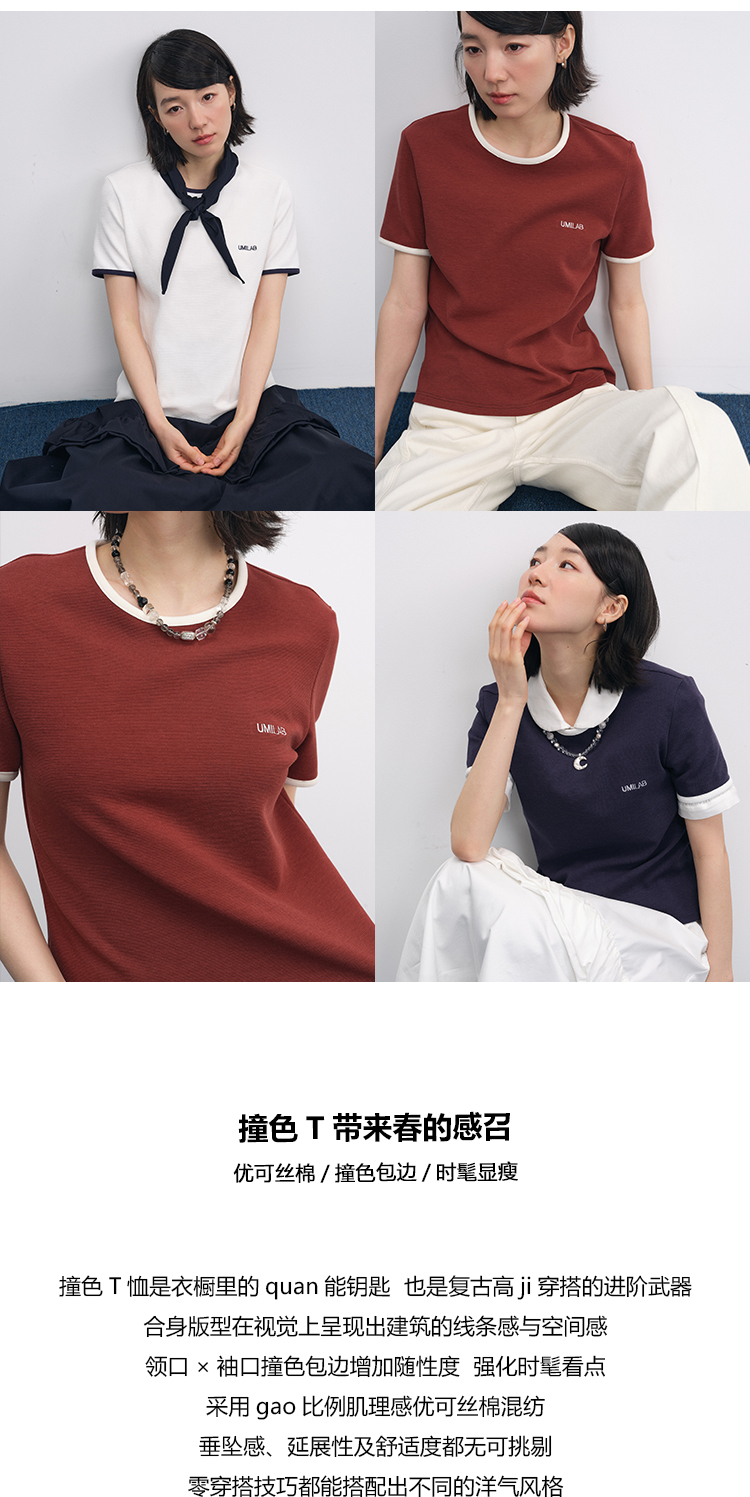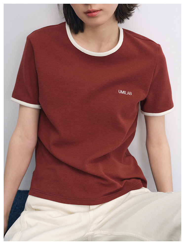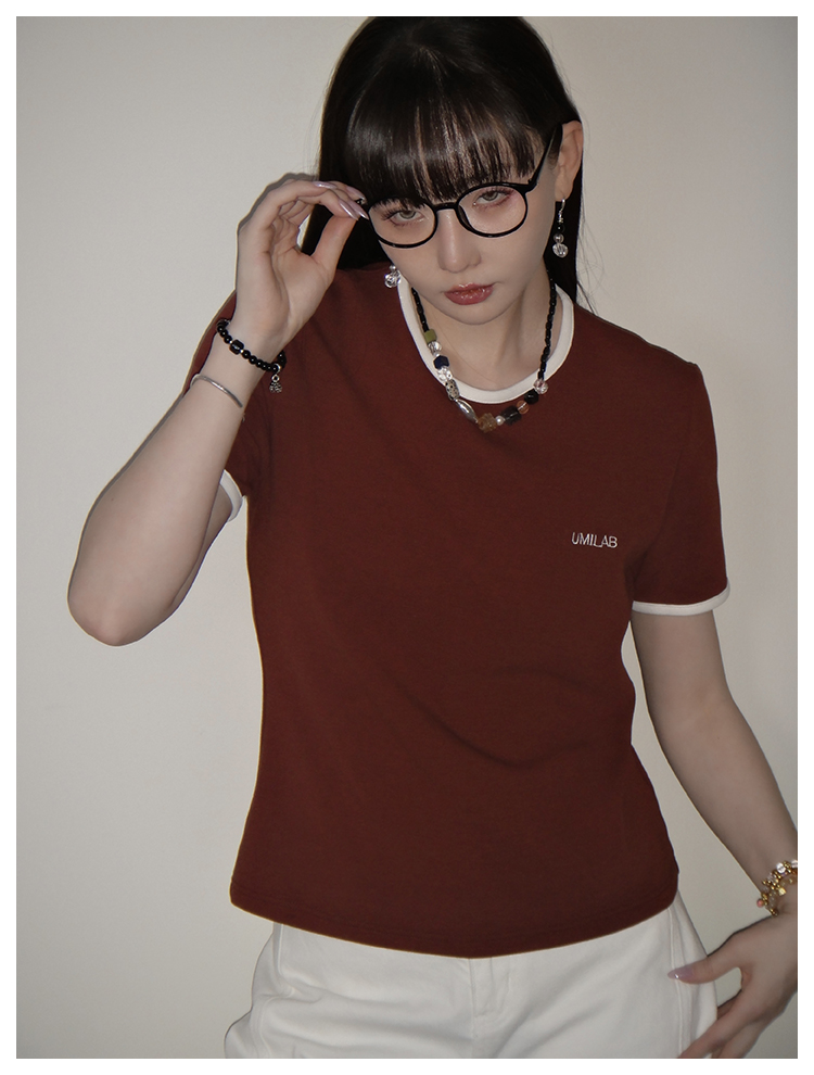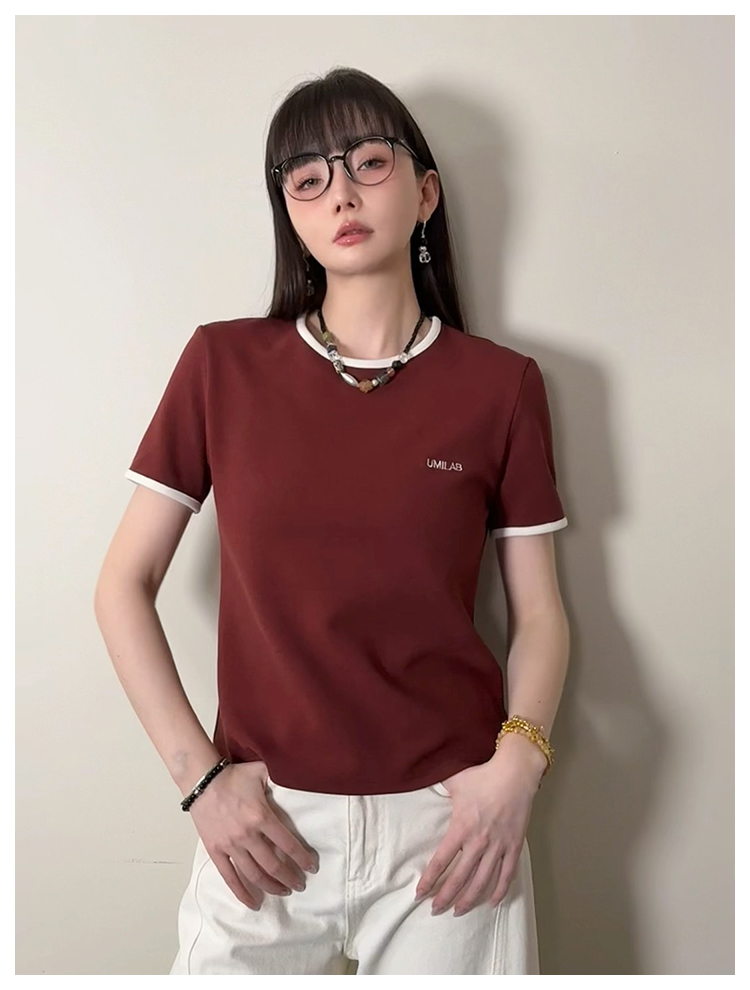 UMILAB【春游】复古miu风 优可丝棉混纺亲肤百搭撞色包边T恤T706H