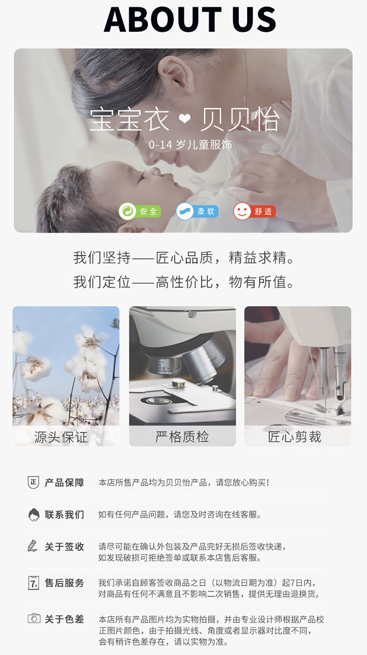 - 贝贝怡专注0-6岁婴幼儿服饰,坚持安全、柔软、舒适的产品理念,为千万中国家庭提供超高品质、安全可靠的婴幼儿服饰产品,妈妈放心,宝宝开心!