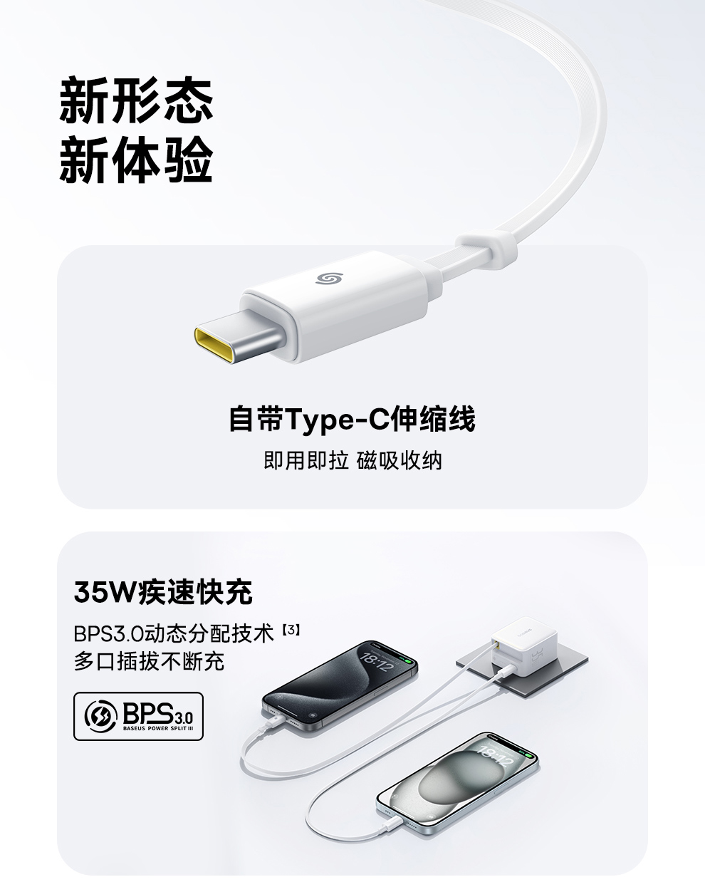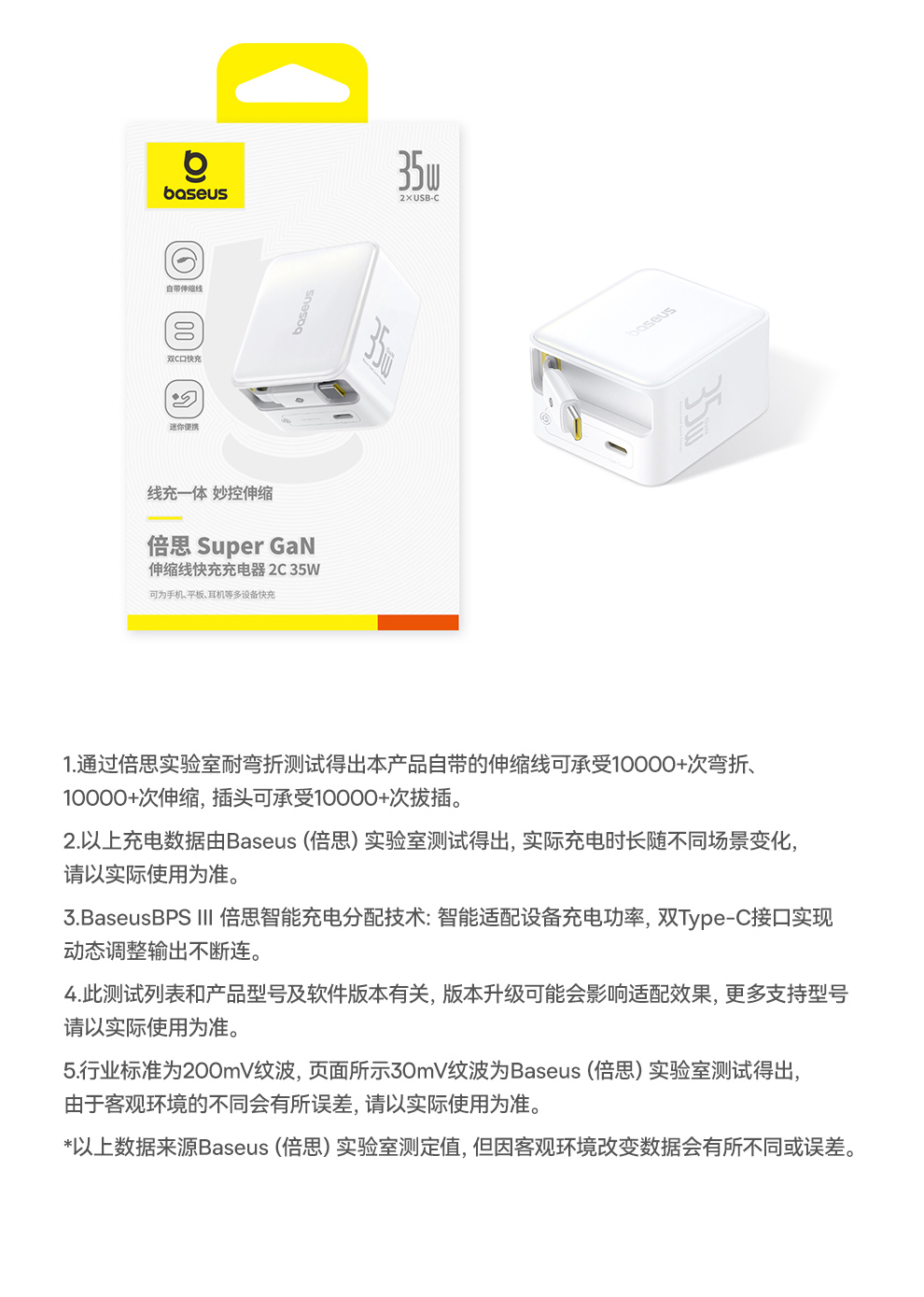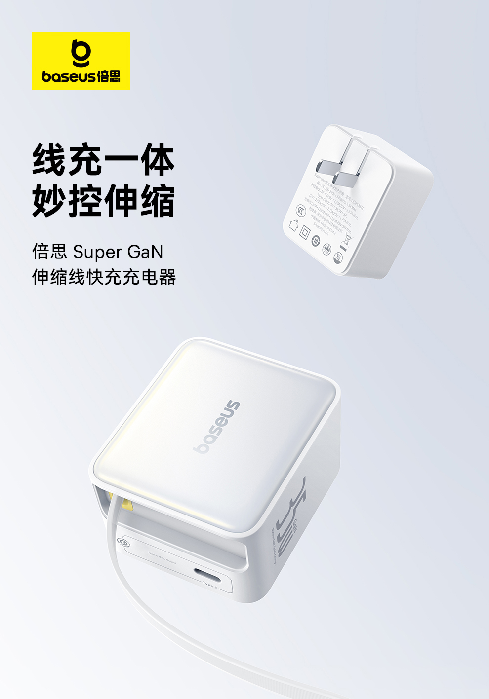倍思 Super GaN 伸缩线快充充电器 2C/C+iP 35W